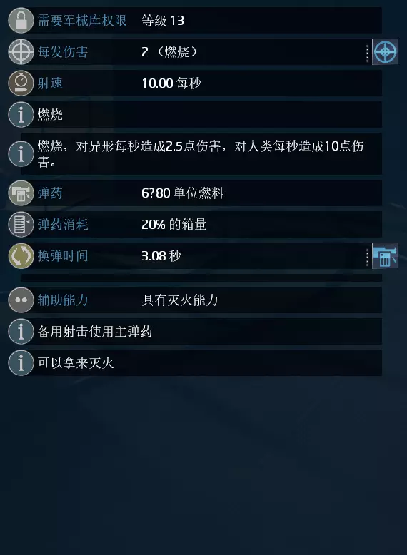 单次总伤:2(+0.5) 单发威力:每1点伤害加成技能提供0.5额外伤害 装弹速度:每1点换弹速度加成技能减少0.31装弹时间 辅助能力:弹药消耗速度翻倍,发射水流可灭火