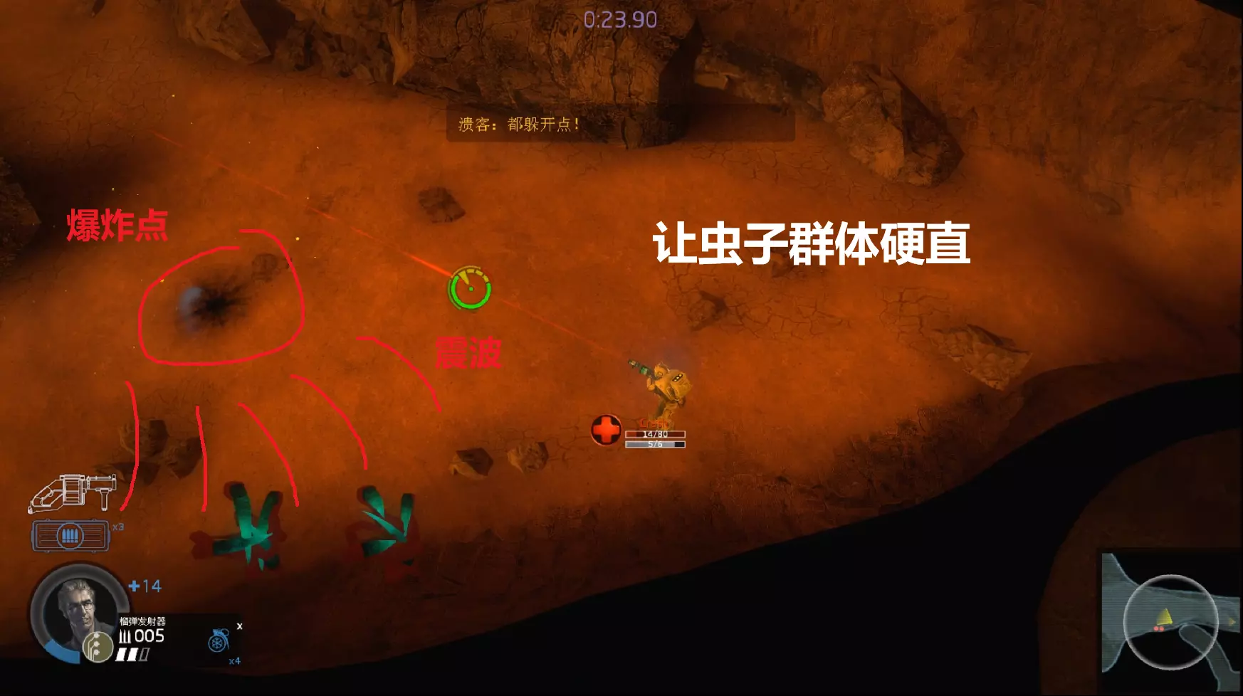 左侧的敌人目标是电锯,如果让电锯自己处理必定会拖慢前进速度,且转向的空隙时间还可能会被前方的虫子突袭,所以这里榴弹优先清理左侧的敌人,让电锯快速前进。往电锯的左上方发射榴弹硬直虫子为电锯争取时间,并清理从左侧出现的敌人。 #红色为敌方的位置与前进的方向和目标 #黄色为榴弹的弹道与落点和震波 #蓝色为我们的工具人电锯与前进的方向 榴弹视角②——守点火雷与帮助电锯清怪