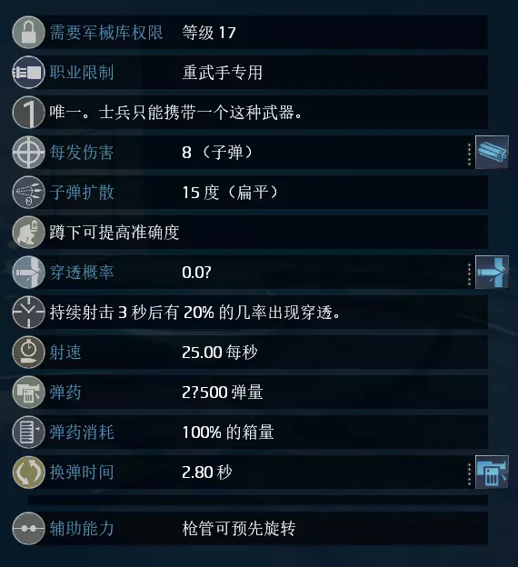 单次总伤:8(+1) 单发威力:每1点自动机枪伤害技能提供1点额外伤害 穿透概率:每1点子弹穿透力技能提供0.2(20%)的穿透概率 装弹速度:每1点换弹速度加成技能减少0.28的装弹时间 辅助能力:武器进行预热,期间减少70%移动速度(蹲下也可预热)