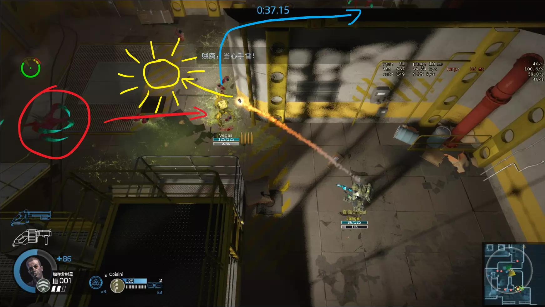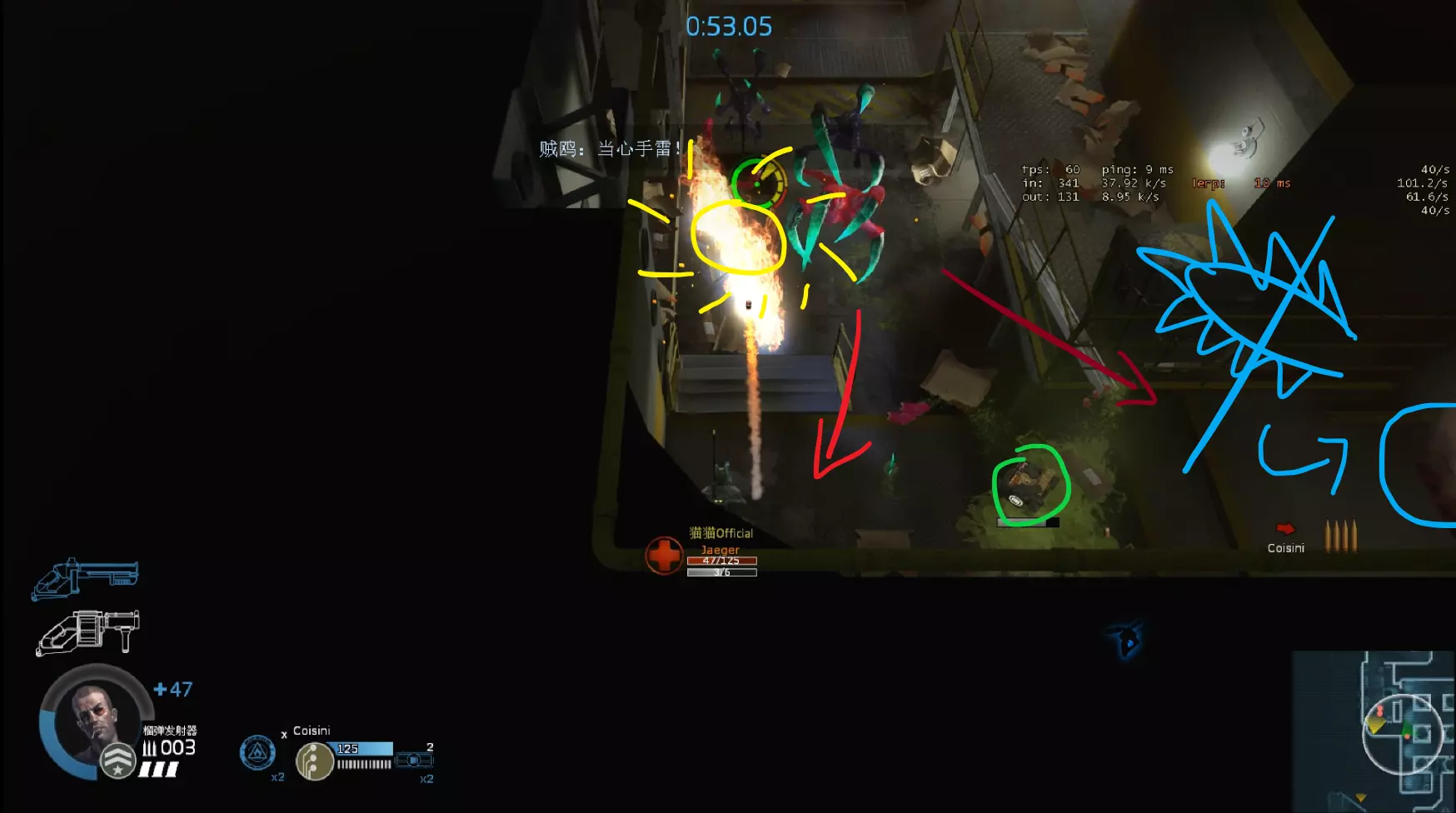 当榴弹在处理完后方敌人换弹,无法清除电锯前方的寄生虫时,不要犹豫,直接开启电甲以确保不会被寄生(携带手榴弹时同理,向前方投掷手榴弹)。双人通关时很少会完全用完3个电甲,因此不要把电甲留到最后,该使用时就使用。 #红色标记敌方的位置、前进方向和目标 #黄色标记电锯的前进方向 #蓝色标记榴弹的弹道、落点和震波 电锯视角②——处理猛攻