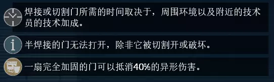 名称:手持电焊机 数量/使用次数:1/无限 持续时间:无 效果:密封或切割大门(密封使门无法打开并变得更加坚固,血量+50%)