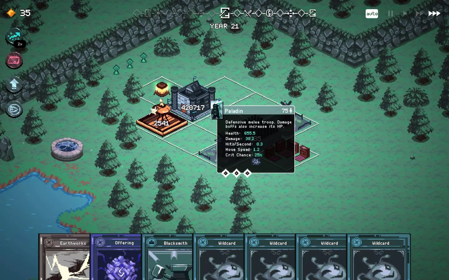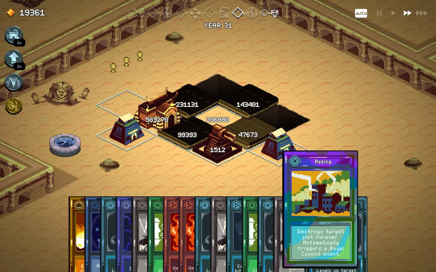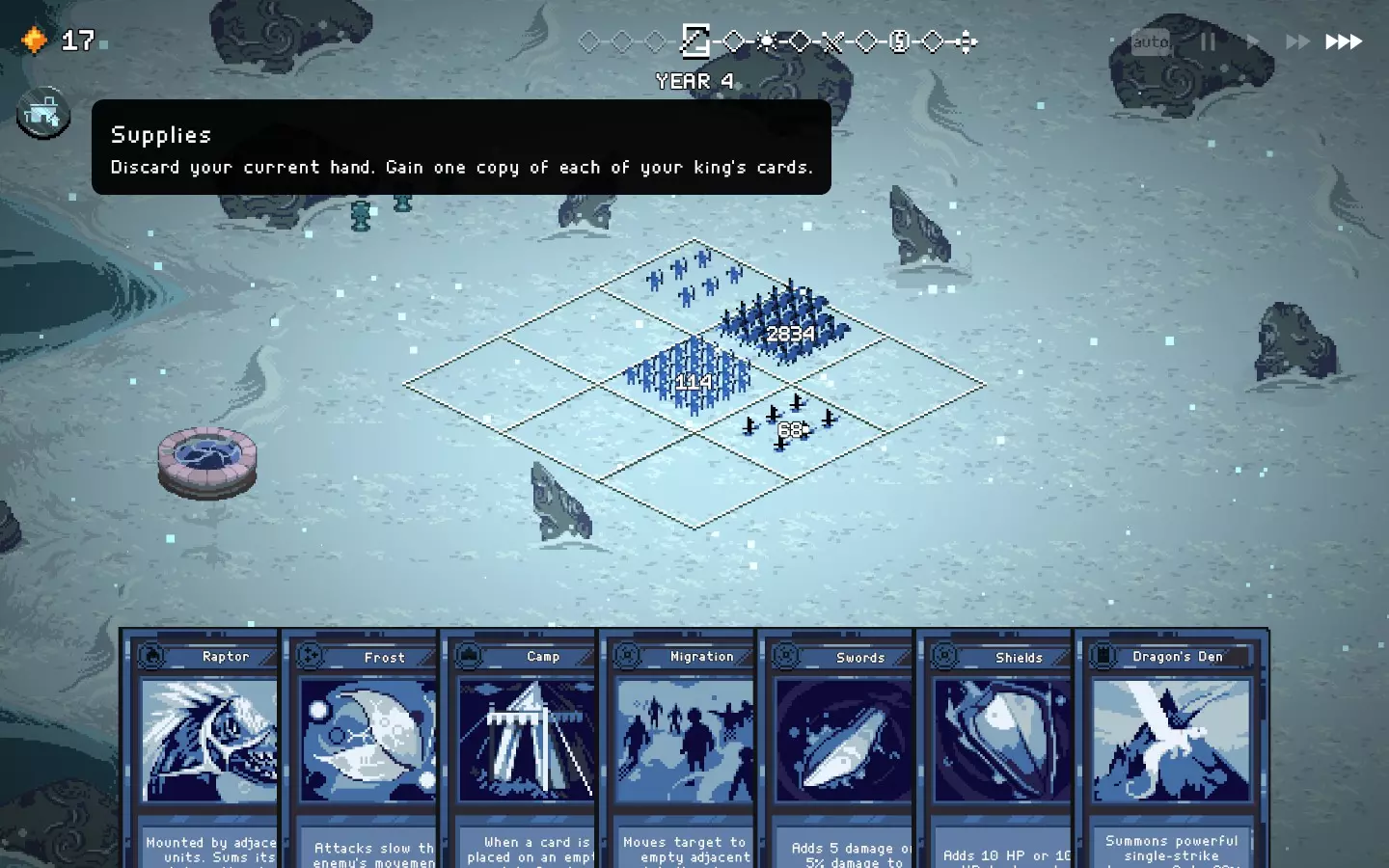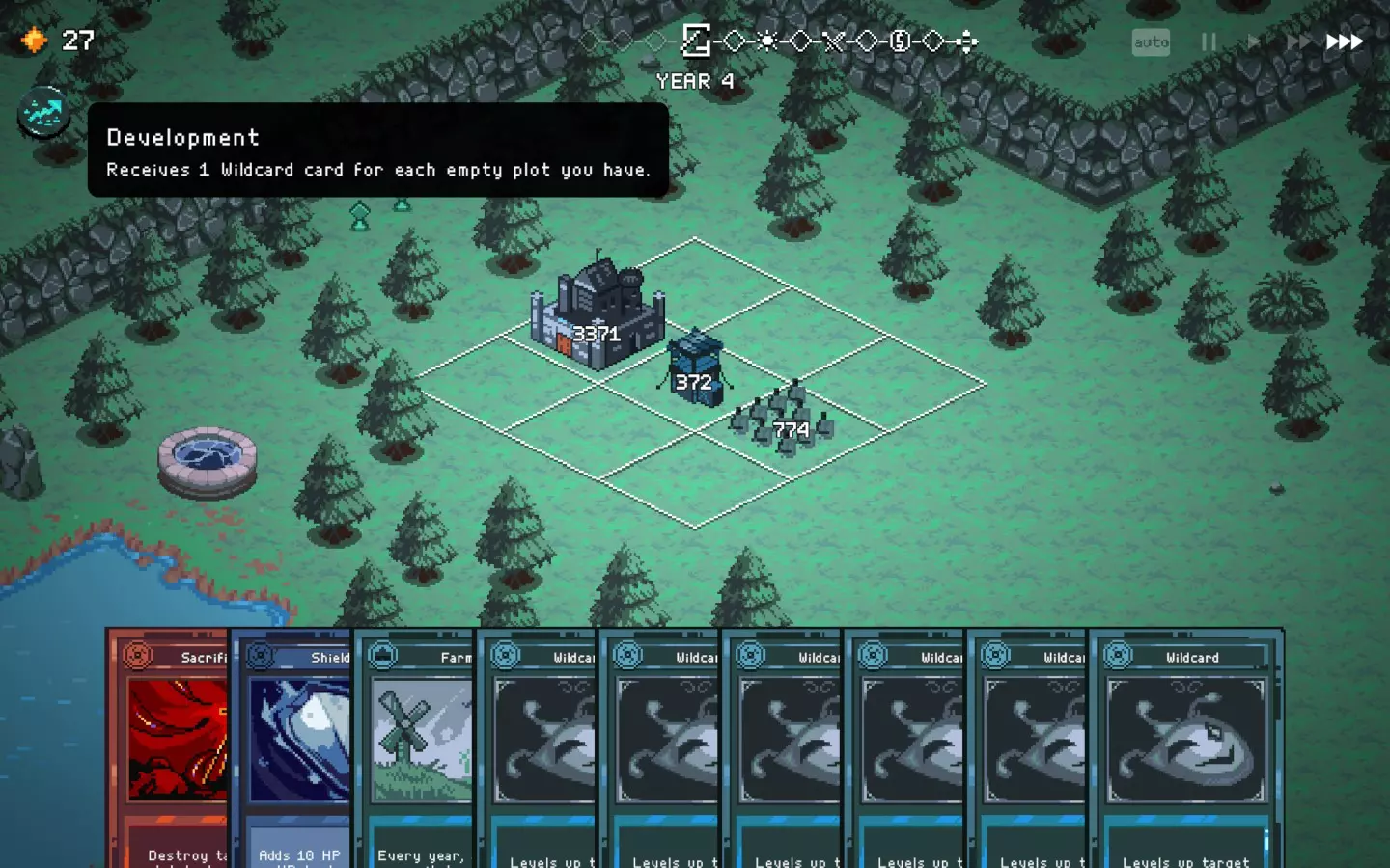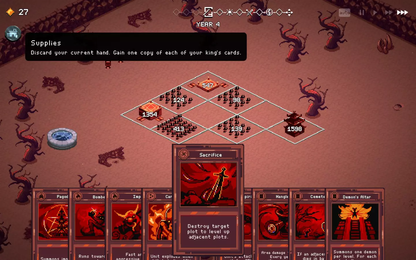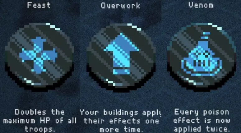 如果你以额外的可部署卡牌开始游戏,或许可以选择【法术之王】作为第一年的敌人。部署一些建筑或单位,战斗结束后你可以重新刷新,并使用“奉献”卡牌来获得最多3次城堡/地格升级(当然,这需要一点运气)。这能让一些原本难以实现的操作成为可能,总体上让你的开局更加顺利。这个技巧在整个游戏过程中都能使用,帮助你处理无用卡牌和糟糕的随机数生成情况。