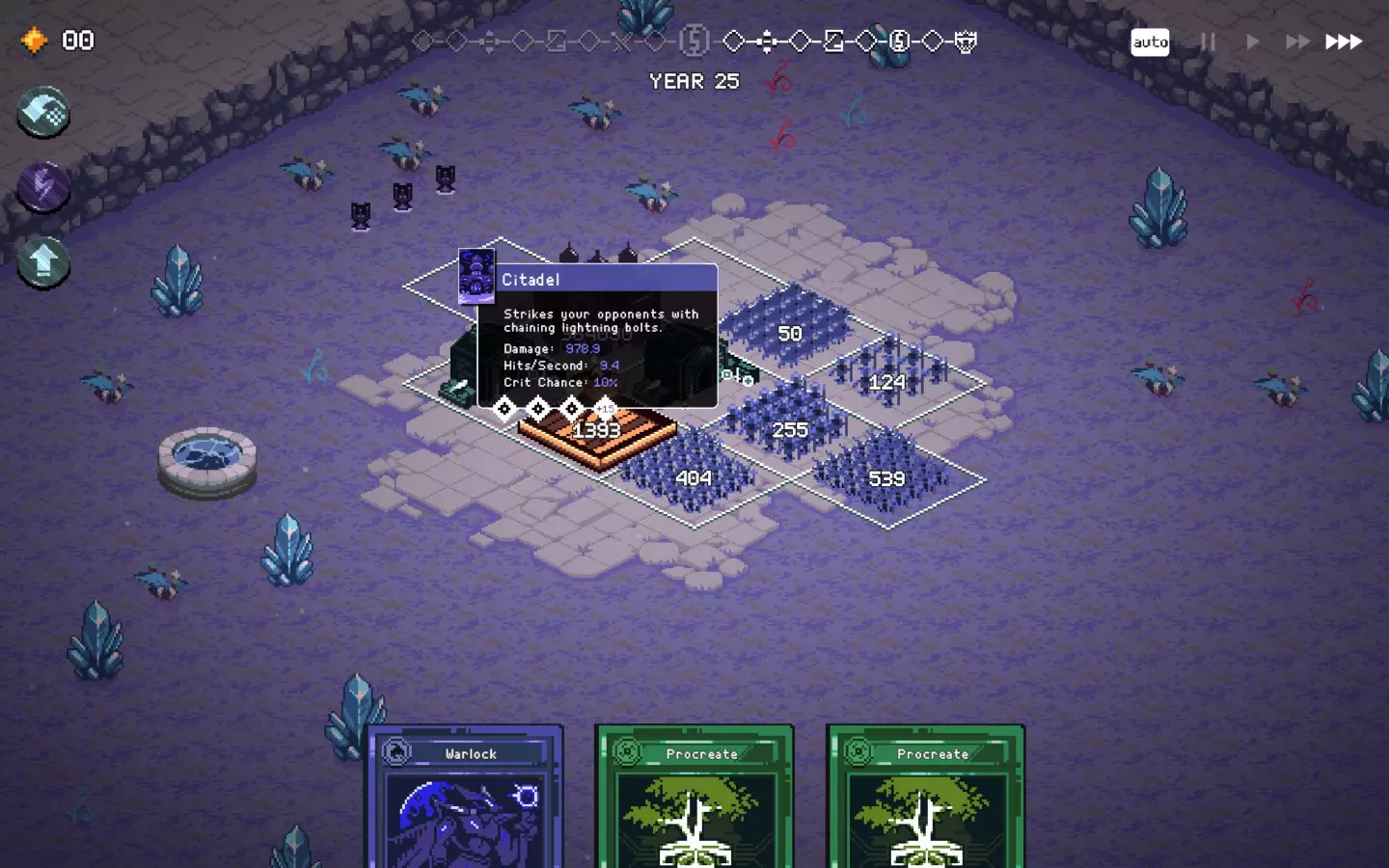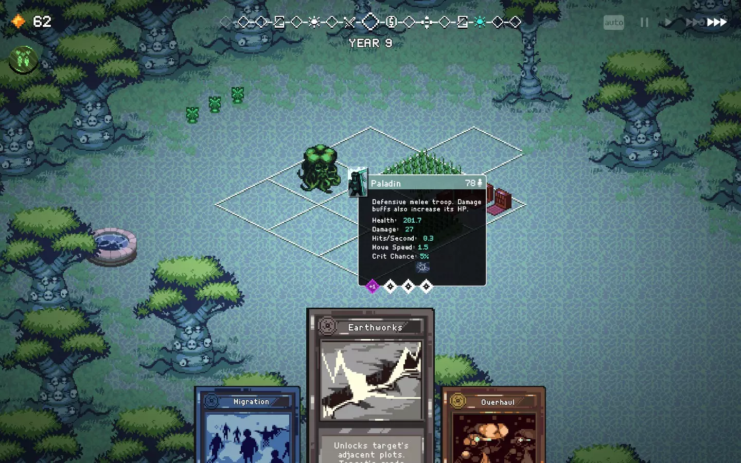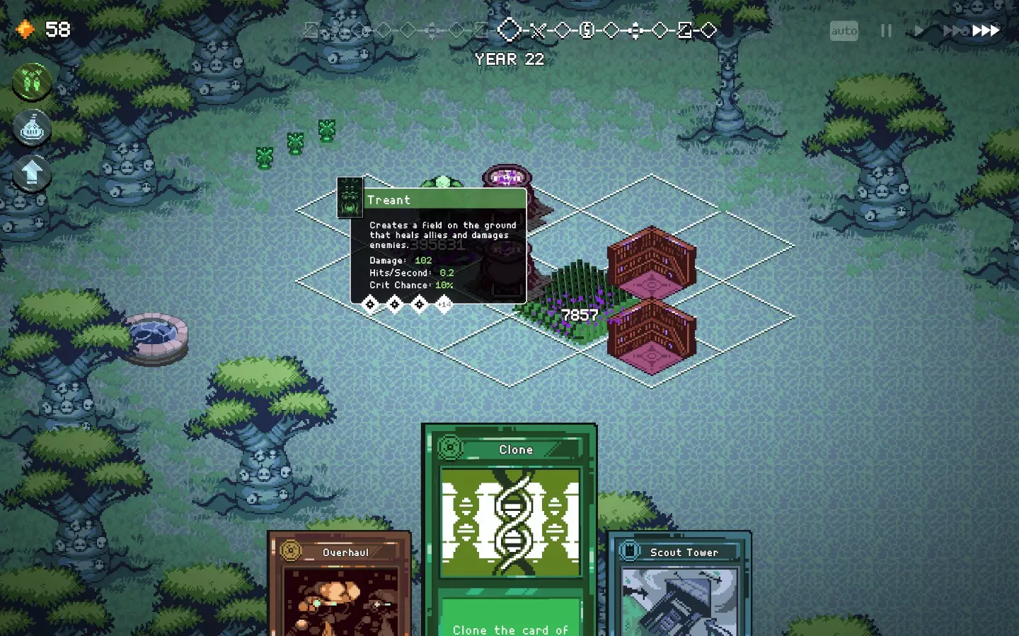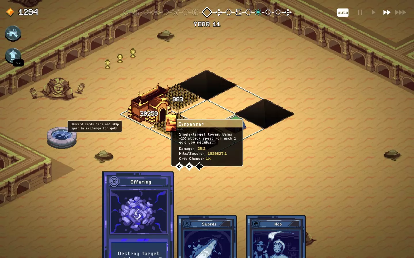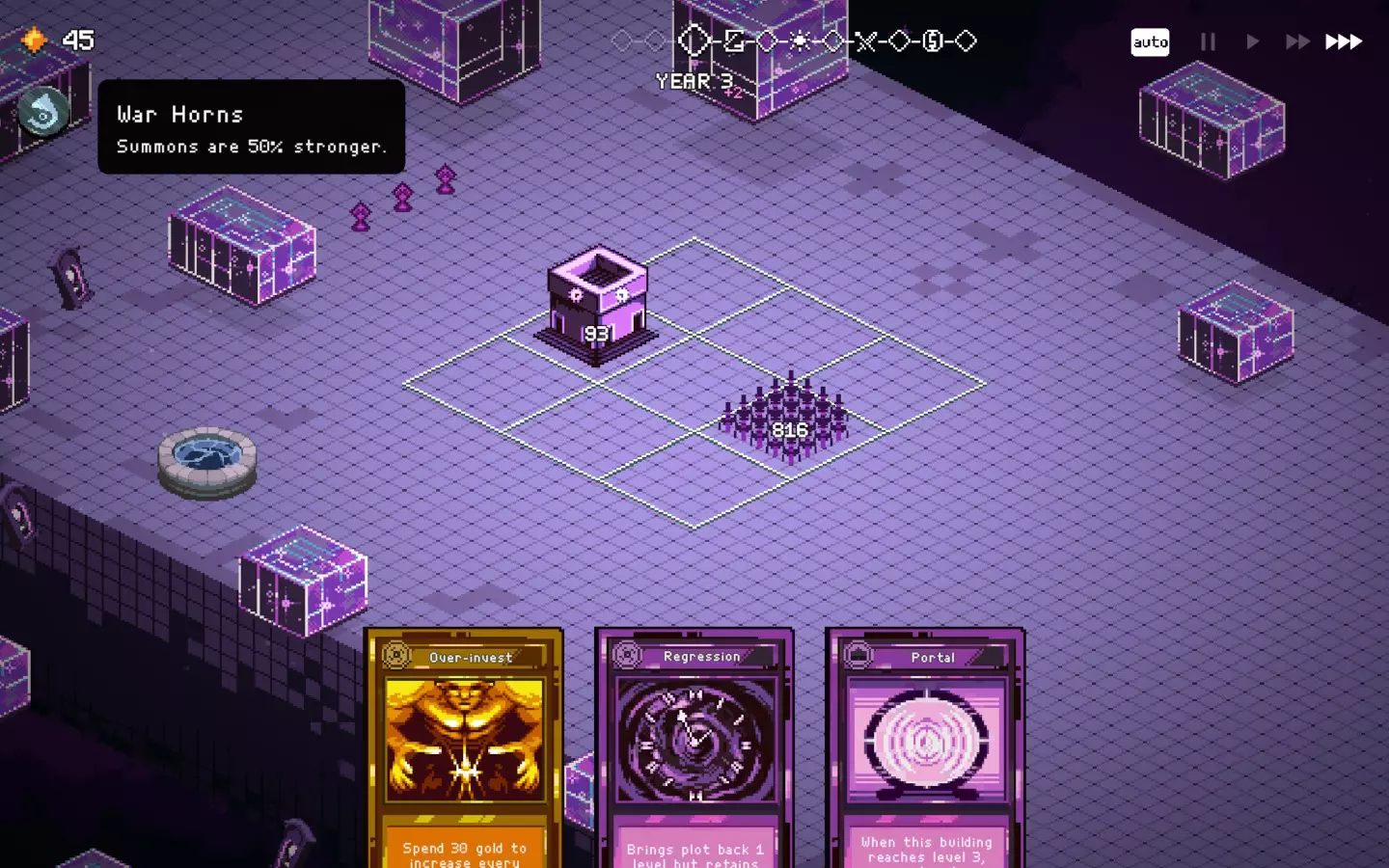 如果你以额外的可部署卡牌开始游戏,或许可以选择【法术之王】作为第一年的敌人。部署一些建筑或单位,战斗结束后你可以重新刷新,并使用“奉献”卡牌来获得最多3次城堡/地格升级(当然,这需要一点运气)。这能让一些原本难以实现的操作成为可能,总体上让你的开局更加顺利。这个技巧在整个游戏过程中都能使用,帮助你处理无用卡牌和糟糕的随机数生成情况。