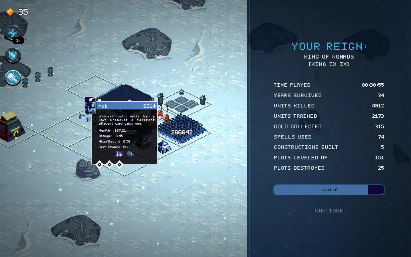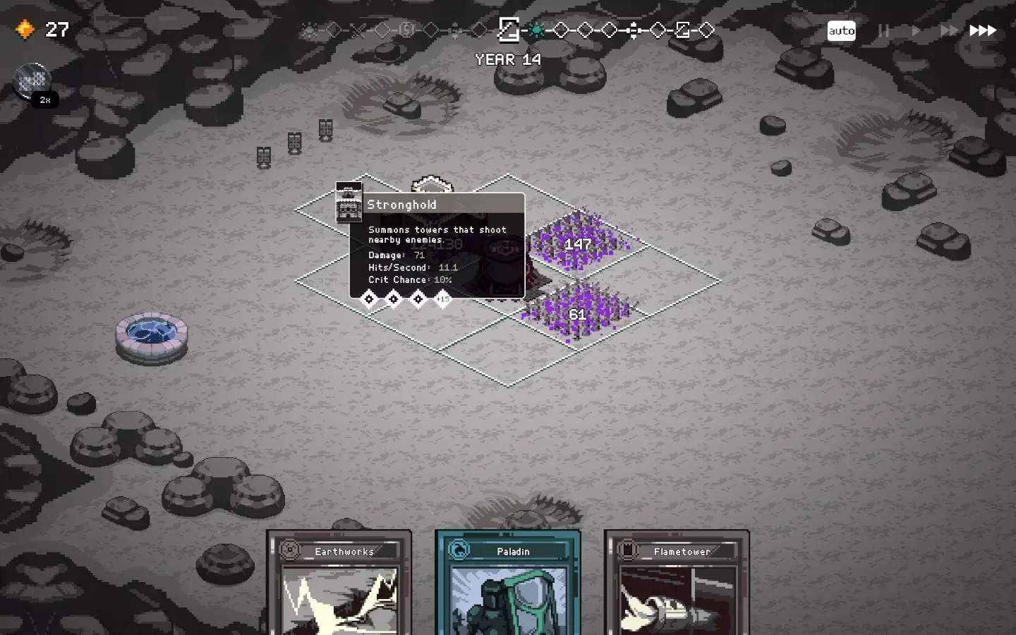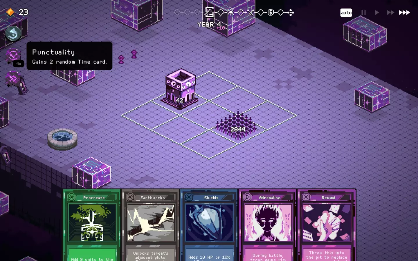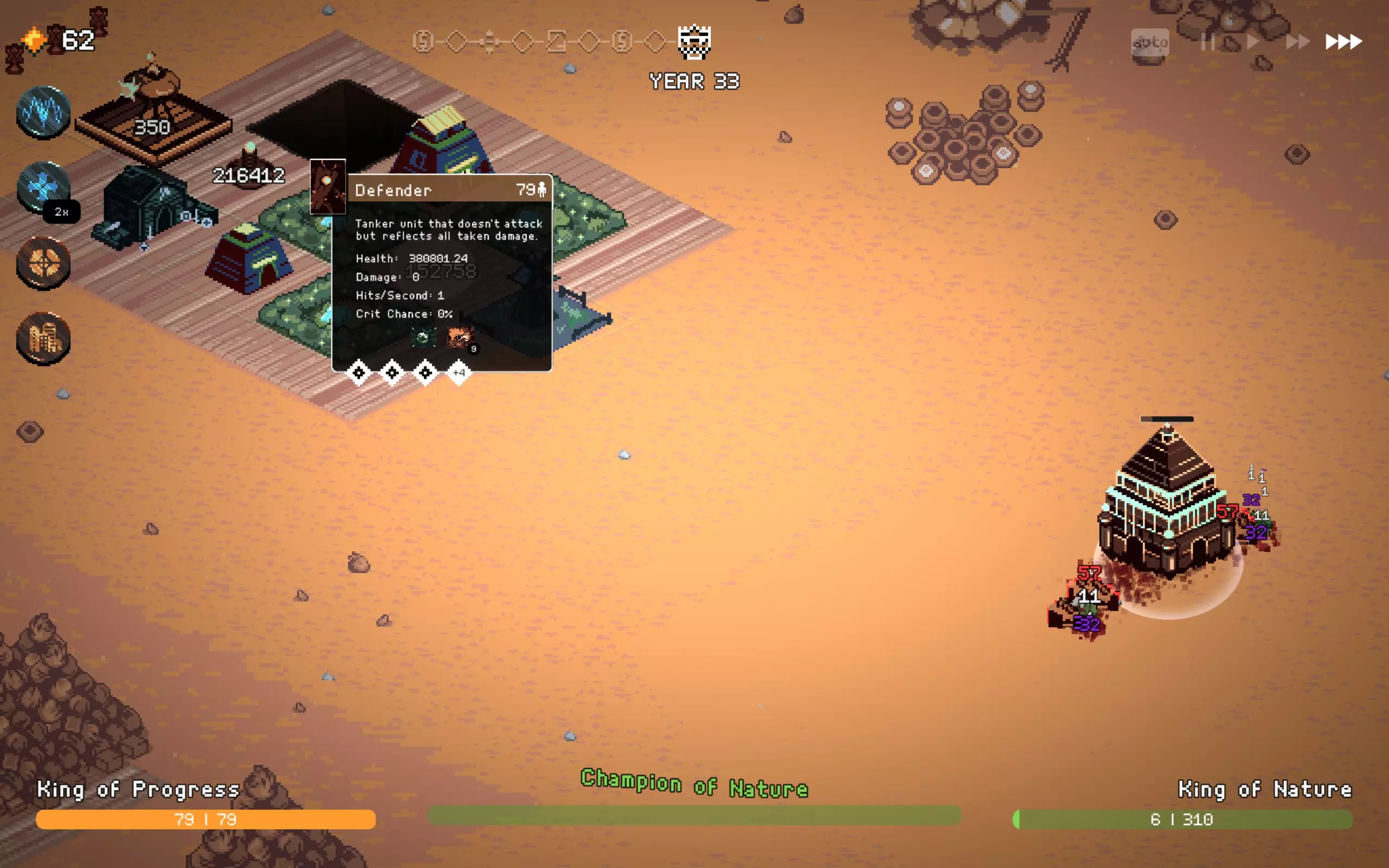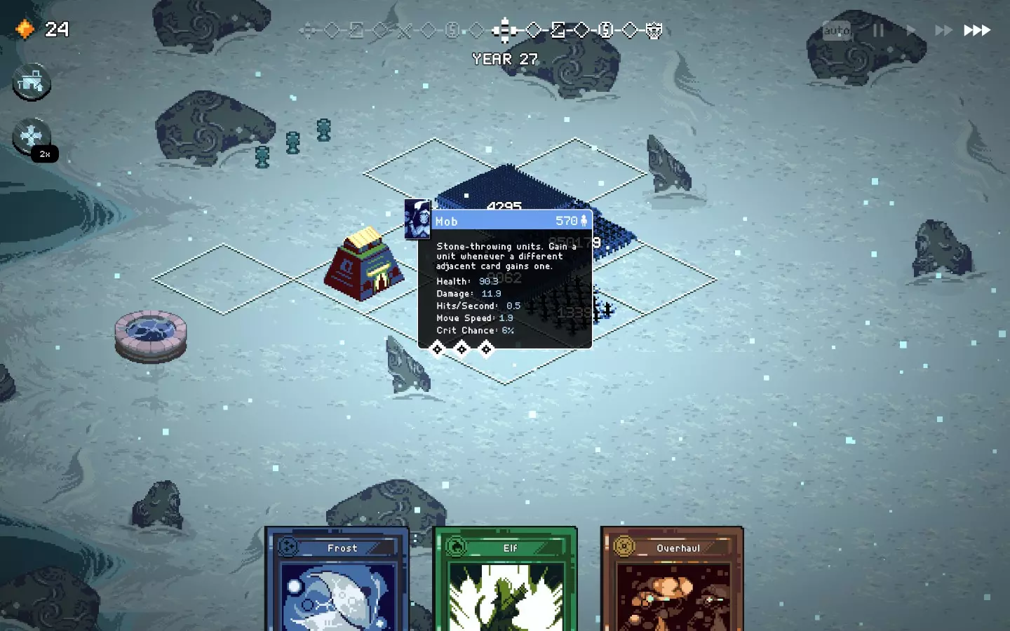 如果你以额外的可部署卡牌开始游戏,或许可以选择【法术之王】作为第一年的敌人。部署一些建筑或单位,战斗结束后你可以重新刷新,并使用“奉献”卡牌来获得最多3次城堡/地格升级(当然,这需要一点运气)。这能让一些原本难以实现的操作成为可能,总体上让你的开局更加顺利。这个技巧在整个游戏过程中都能使用,帮助你处理无用卡牌和糟糕的随机数生成情况。