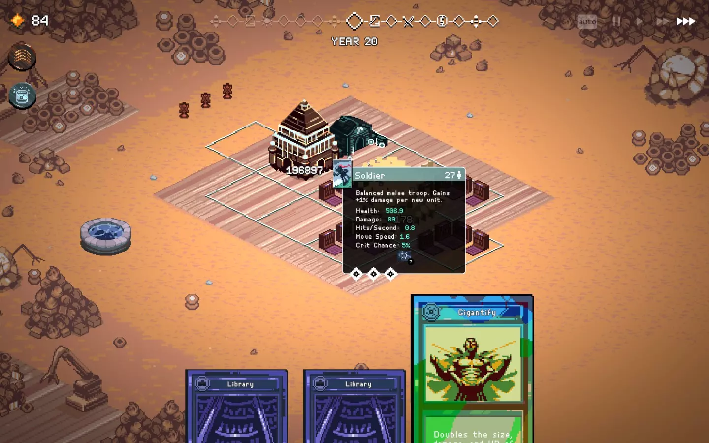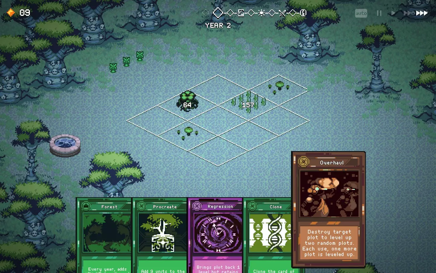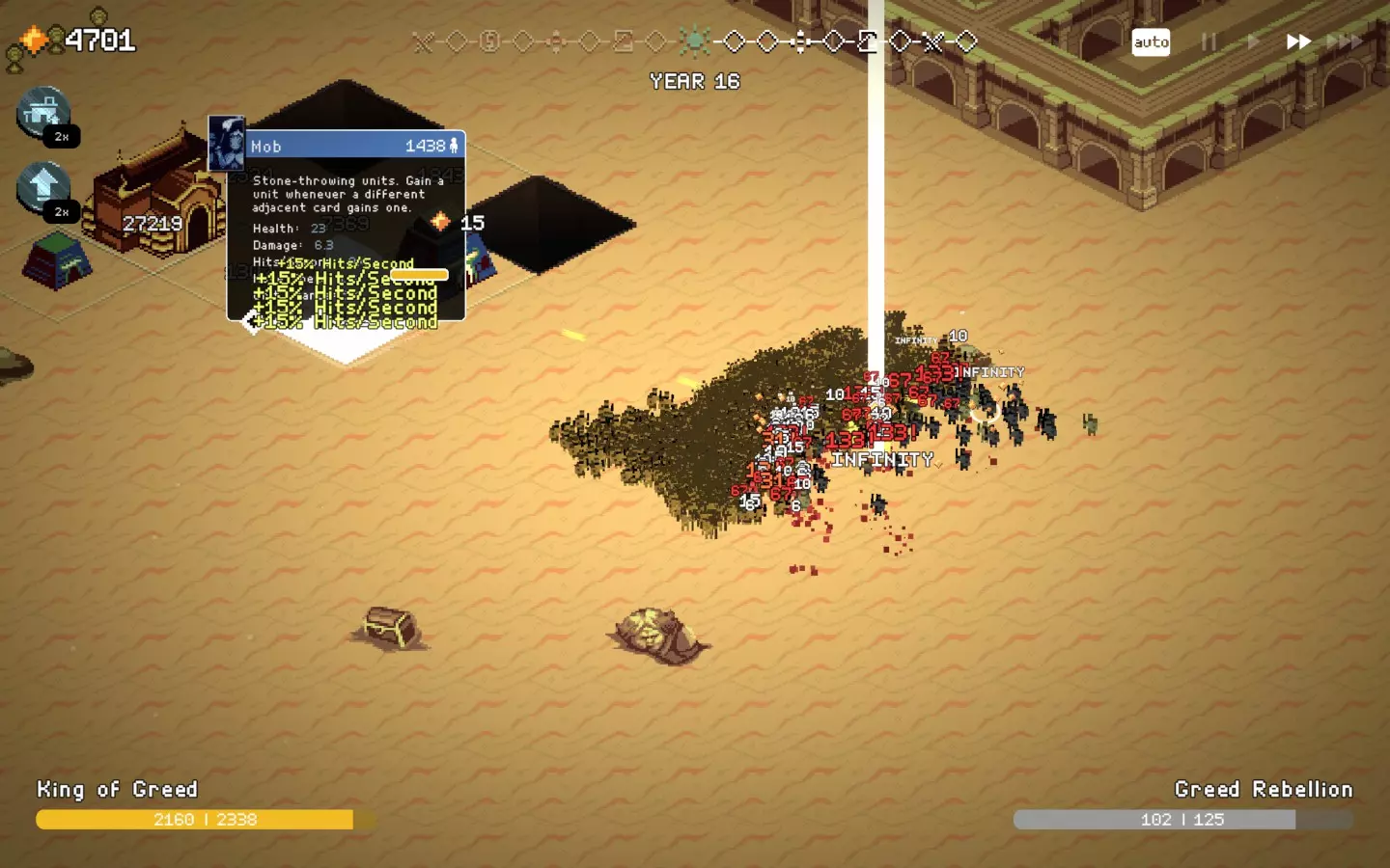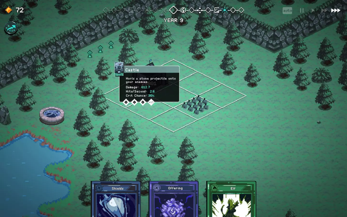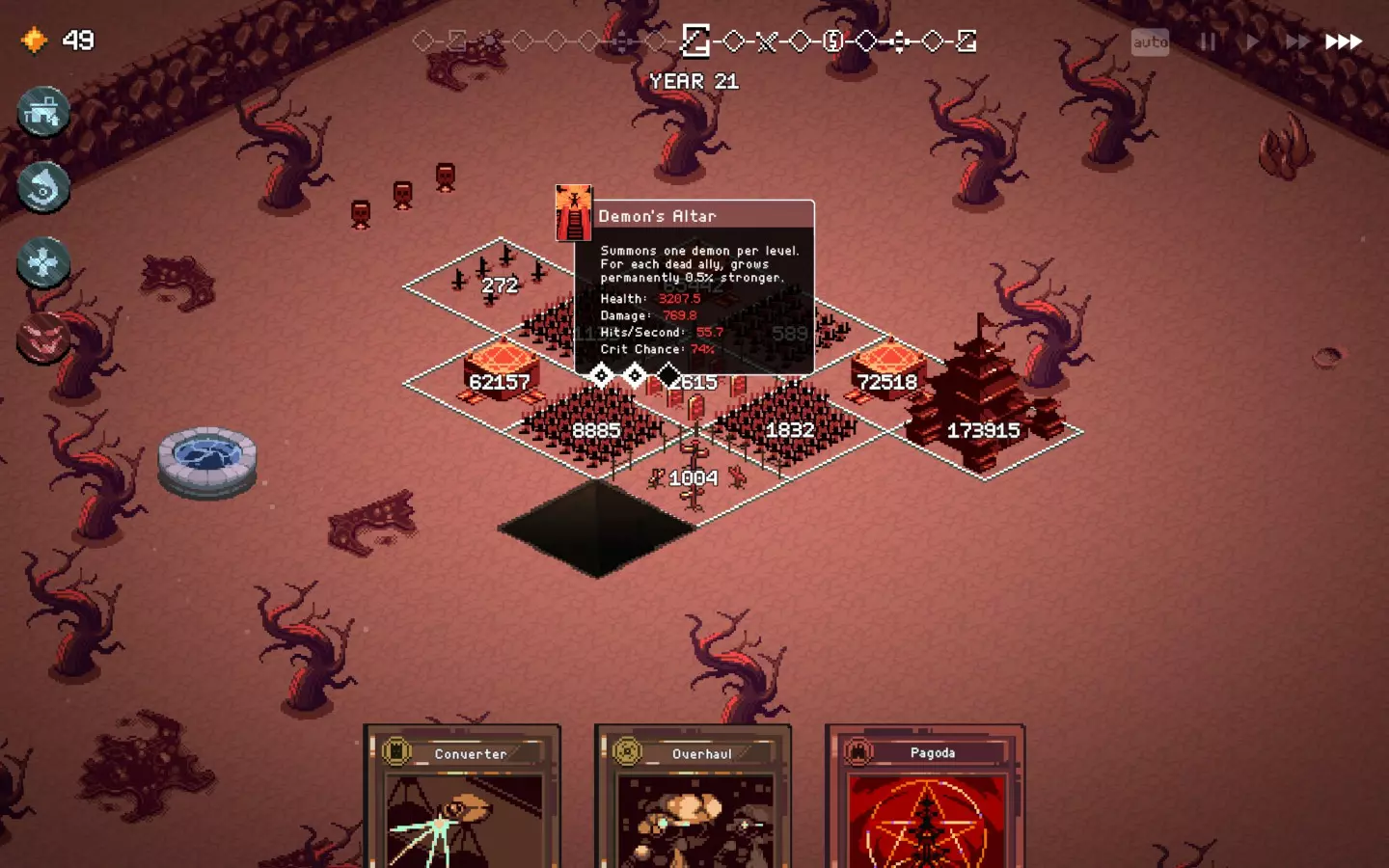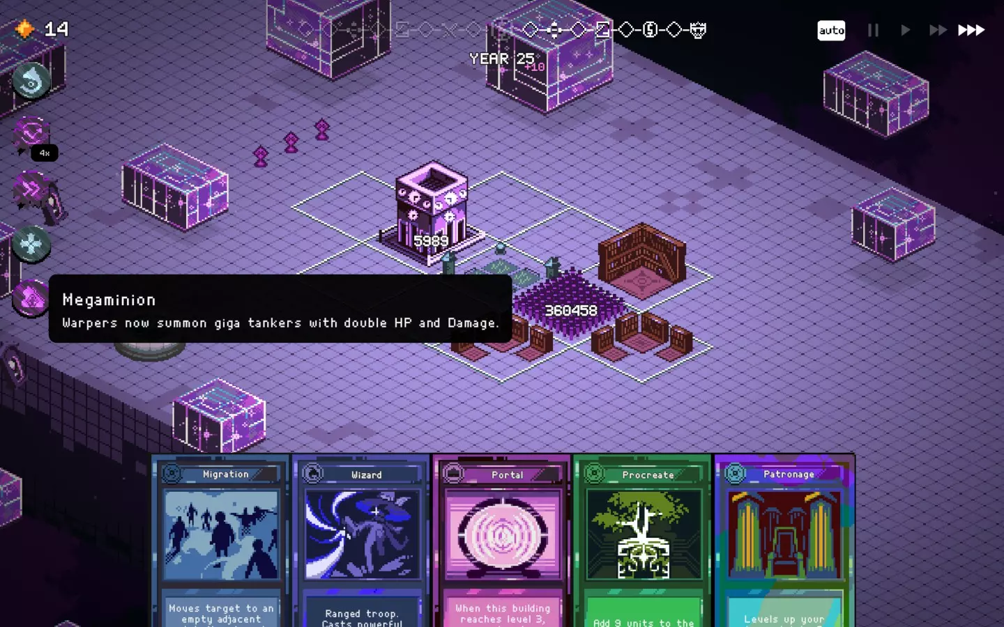 如果你以额外的可部署卡牌开始游戏,或许可以选择【法术之王】作为第一年的敌人。部署一些建筑或单位,战斗结束后你可以重新刷新,并使用“奉献”卡牌来获得最多3次城堡/地格升级(当然,这需要一点运气)。这能让一些原本难以实现的操作成为可能,总体上让你的开局更加顺利。这个技巧在整个游戏过程中都能使用,帮助你处理无用卡牌和糟糕的随机数生成情况。