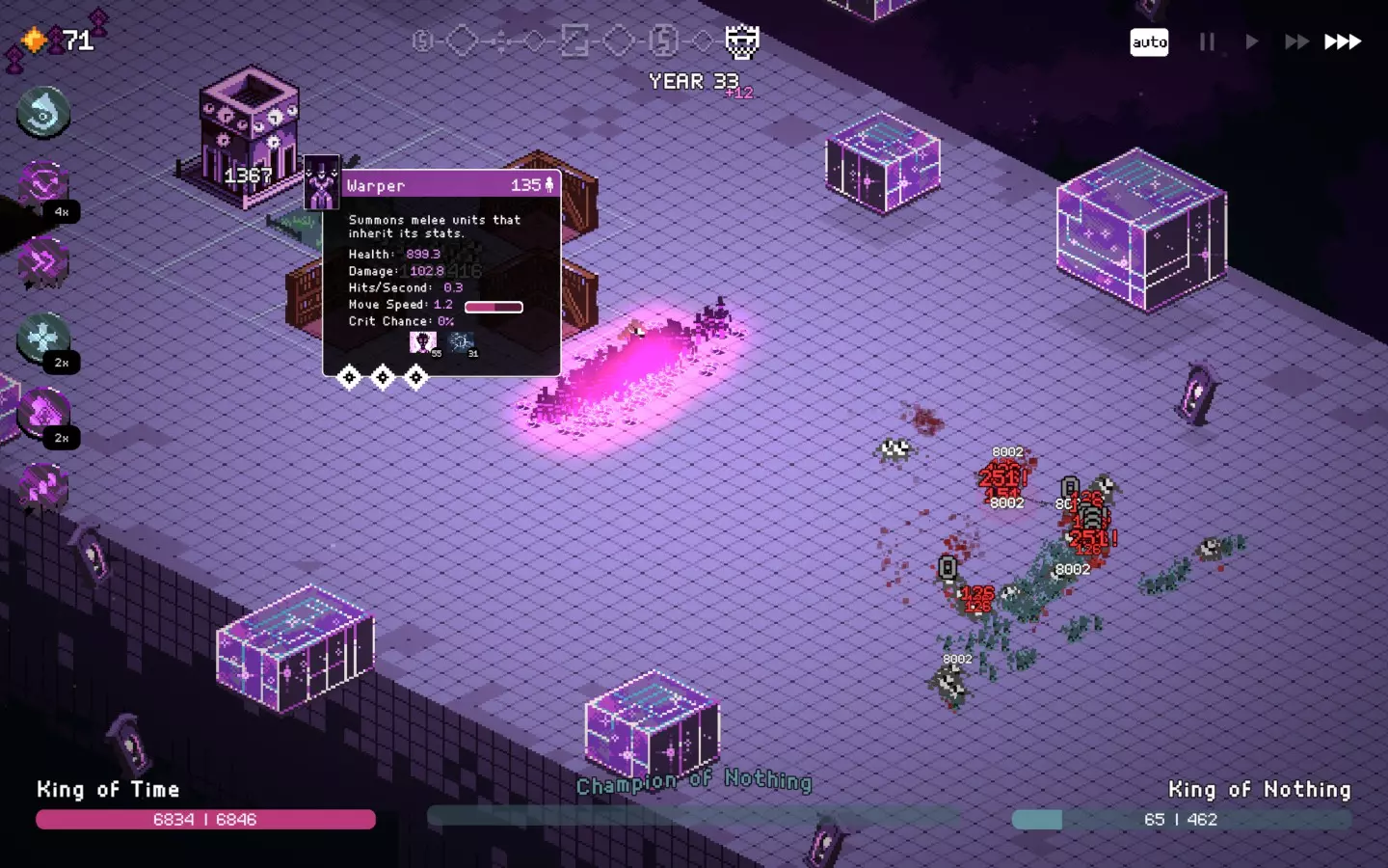 时间之王“住手!” 时间旅行?不了……我不喜欢,因为这种时间骗局每次尝试都可能超过一个小时。现实生活中的时间嘛,如果我有的话…… 在第一个法令选择时进行时间旅行,可以回到过去<>前往未来。一直这样做,直到你的随机数生成器(RNG)背叛你,或者你感到厌倦为止。 这是一个相当稳定的玩法,下面的截图中有不错的初始卡组示例。通过使用“倒带”将这个卡组转换为“扭曲者”升级,以便轻松开始。 然后尽快升级“扭曲者”,尽可能多地使用“回归”。关键在于,通过使用“残酷” perk,这个单位会像机关枪一样召唤大量单位,尤其是在游戏中后期。而且,这些召唤单位的属性增长非常奇特,它们可以在主单位数据不高的情况下造成大量伤害。增加“扭曲者”的单位数量也很重要,农场对此很有帮助。尝试将扭曲者的数量控制在200-300左右,否则在配置较低的设备上游戏可能会崩溃。同时,要克制内心的贪婪,尽快完成当前回合。无限回溯就像是无尽模式,最终总会导致崩溃。 【回溯】是这里的核心卡牌。当你的牌组较大时,使用几张你需要的卡牌,然后通过回溯再次使用它们。这对快速生成传送门非常有帮助。 通过技能跳过或禁用【贪婪男爵】和【自然之敌】,他们会优先攻击“扭曲者”单位而非召唤物。【法术之王】在游戏初期也可能很棘手,他的范围攻击可以秒杀你的召唤物,但他的卡牌也非常有用。许多法令在这里都是可行的,但建议优先选择与召唤相关的,【补给】在游戏初期也是个非常不错的选择。 他的城堡不是个好选择,在游戏初期很难充分升级。你可以让它保持1级不管。 更新信息: 【传送门】+【神龛】+【过度工作】法令可以完成这一局,因为现在部署【传送门】卡牌时可以立即传送。你现在才是真正的时间之王…… 在最新修复版本中测试过,并尝试了不同的国王/卡牌,效果非常好。唯一的挑战是在第一年法令时及时传送,这可能绝对需要良好的初始卡组。 新增了【防御者】,它们可以为【传送者】争取一些时间来召唤更多单位。“恶魔祭坛”在召唤物死亡时也会提供增益效果,而且召唤物数量众多…… 法令数量过多会导致无法完全显示在屏幕上,还会出现轻微bug,请停止传送并完成当前回合。【更新说明中已注明此问题已修复】 感谢Dronda Desuix对技能布局优化的建议。