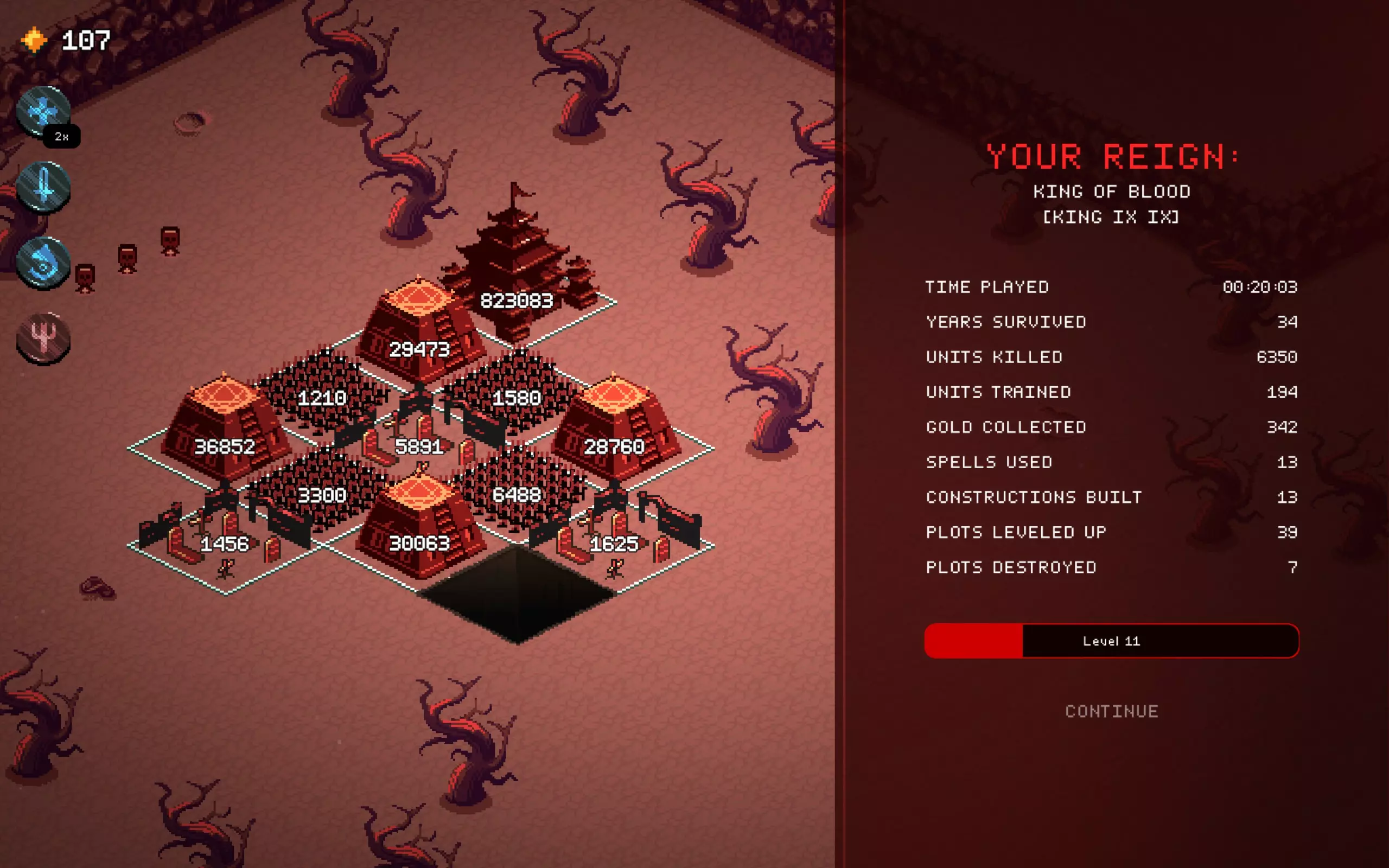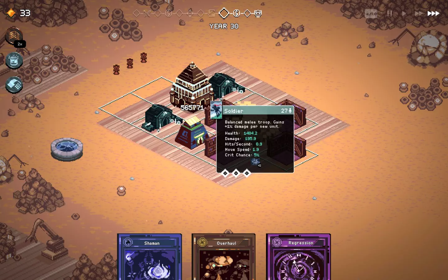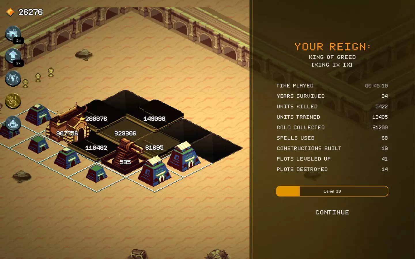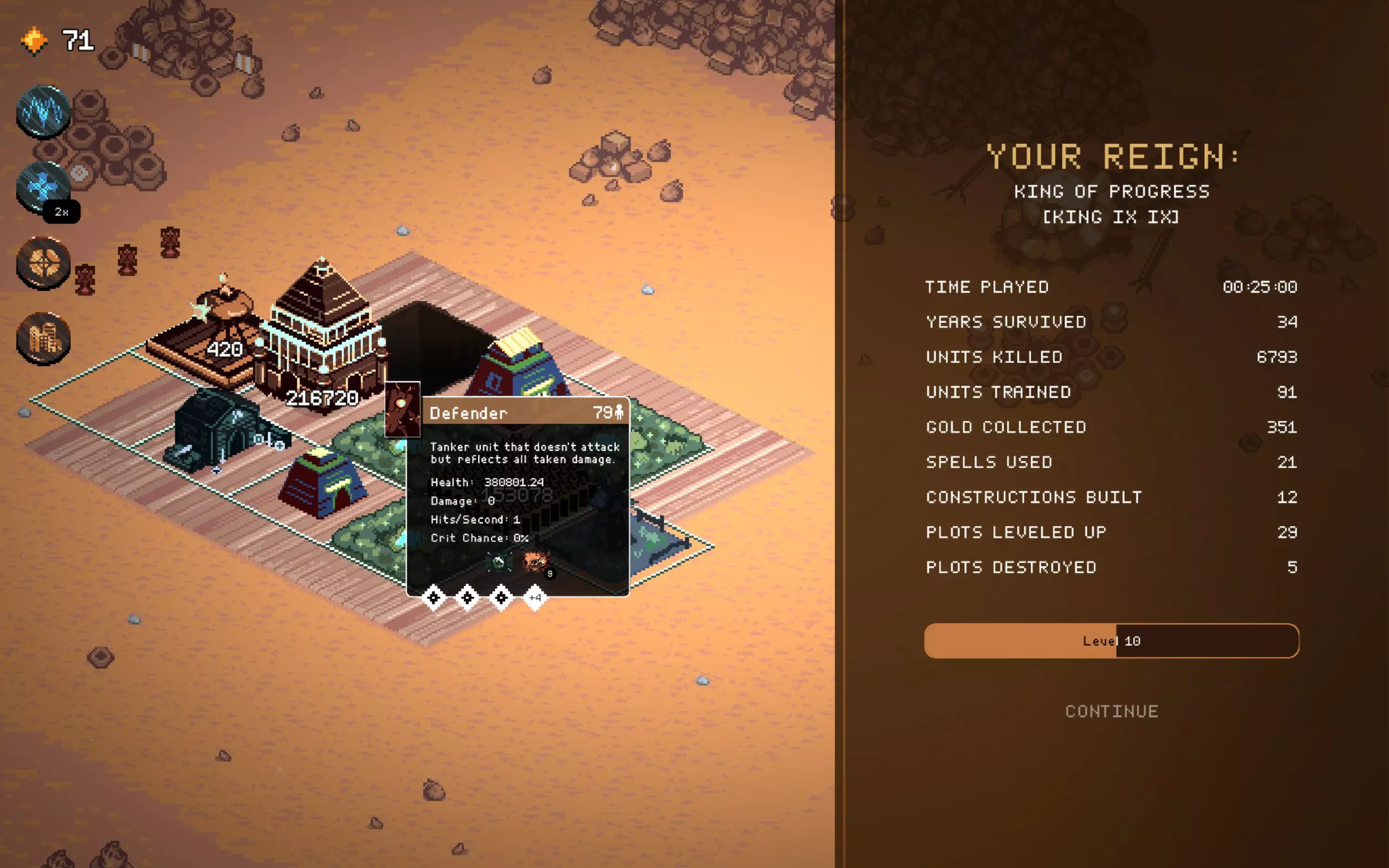 遗产,毒坦流派截图。前期是最难的阶段。尝试用“盛宴”法令来生存。 距离“防御者”还需提升4级,将其与“盛宴”法令和神庙相结合,能获得极高的生命值。 正如截图所示,在 boss 战中不会损失任何单位。 根据截图,不要选择国王专属法令或第一个法令,我当时只是运气不好…… 仍然可以游玩,但非常依赖运气,而且不值得花费时间。