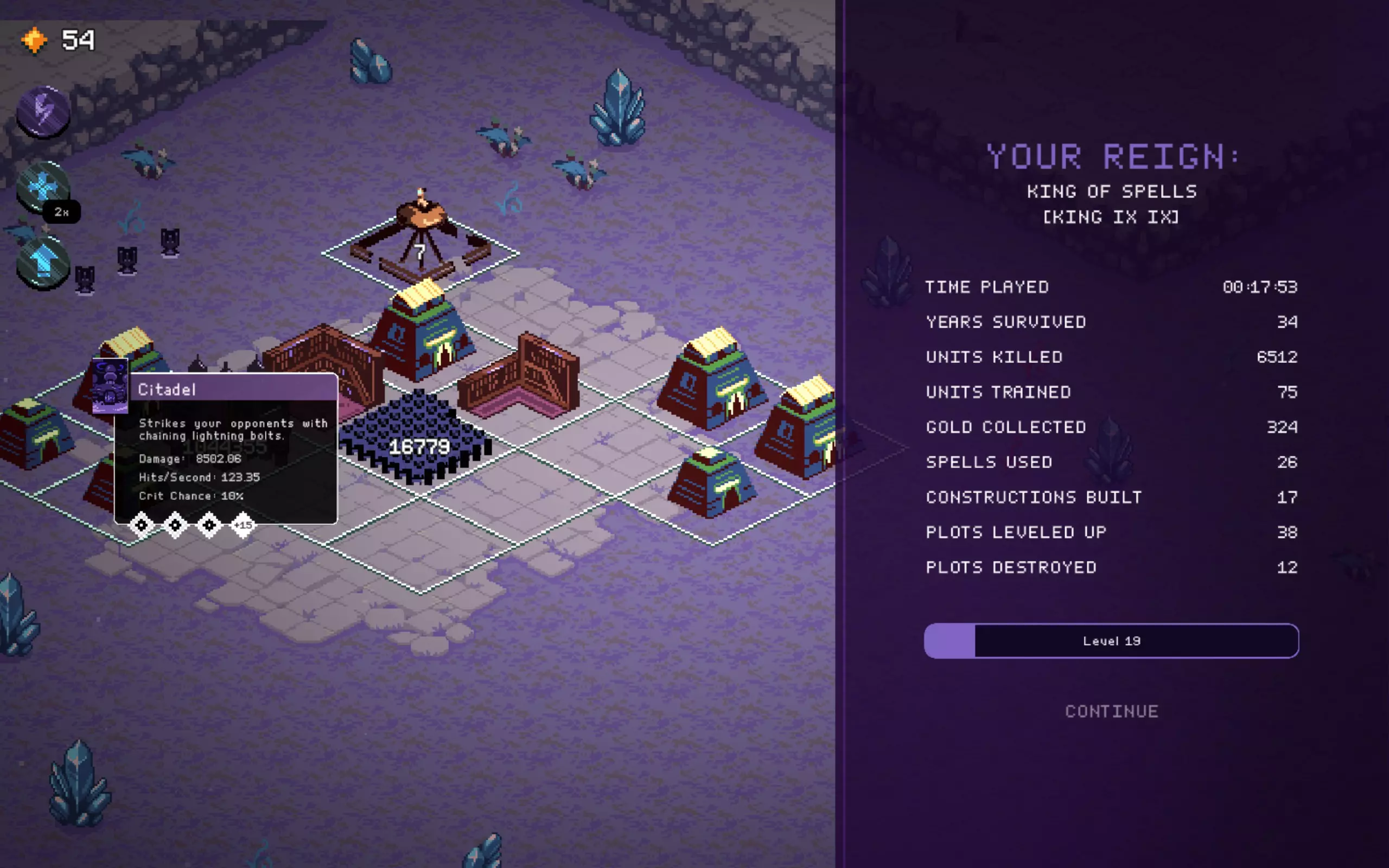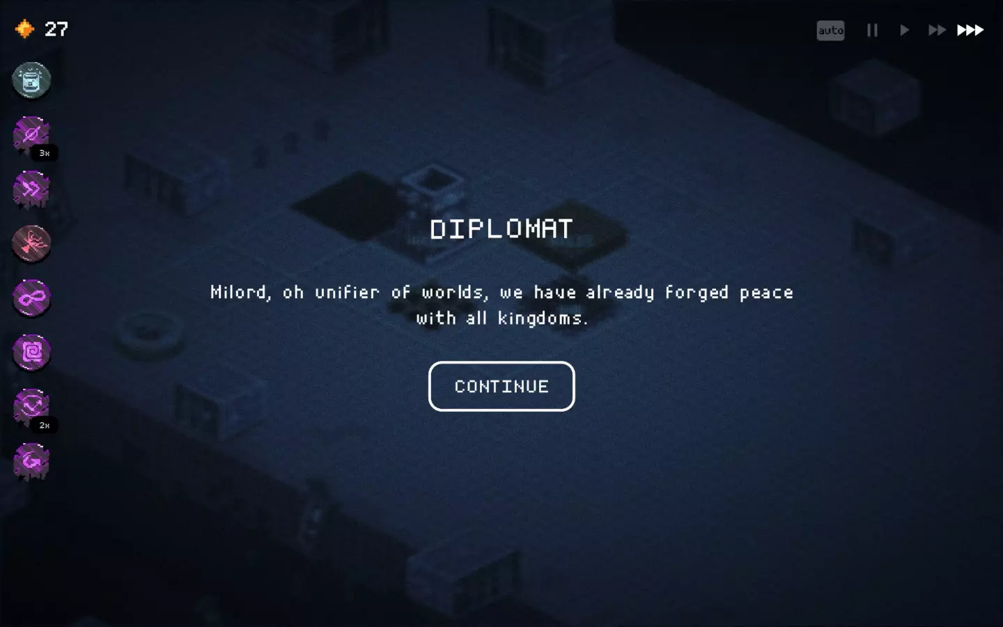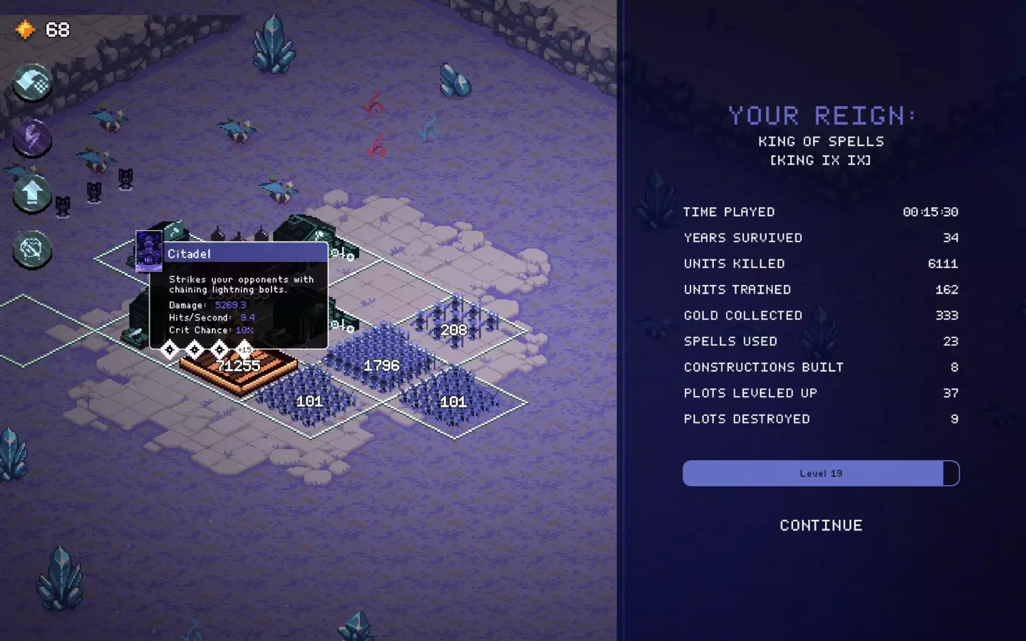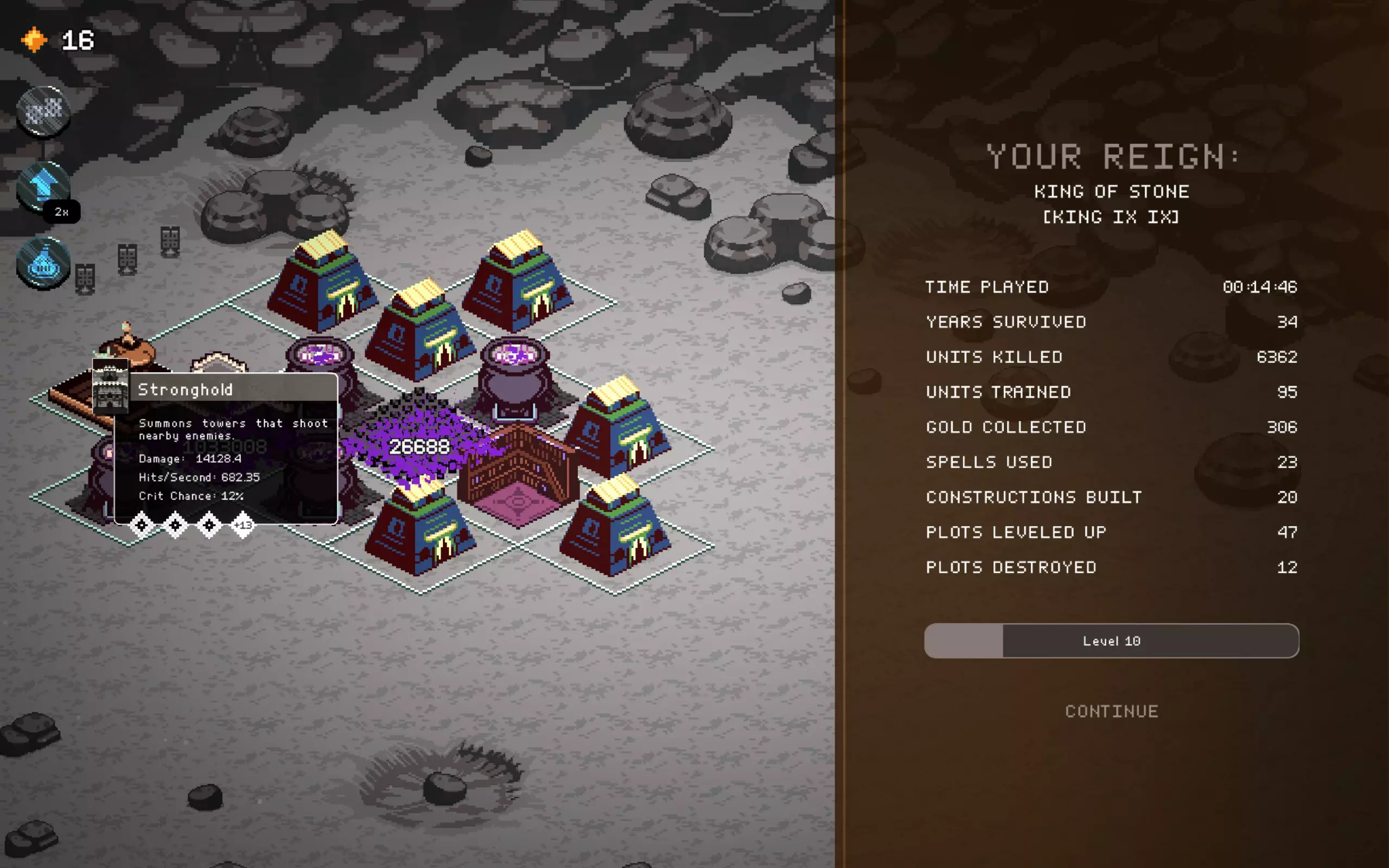 遗产,毒坦流派截图。前期是最难的阶段。尝试用“盛宴”法令来生存。 距离“防御者”还需提升4级,将其与“盛宴”法令和神庙相结合,能获得极高的生命值。 正如截图所示,在 boss 战中不会损失任何单位。 根据截图,不要选择国王专属法令或第一个法令,我当时只是运气不好…… 仍然可以游玩,但非常依赖运气,而且不值得花费时间。