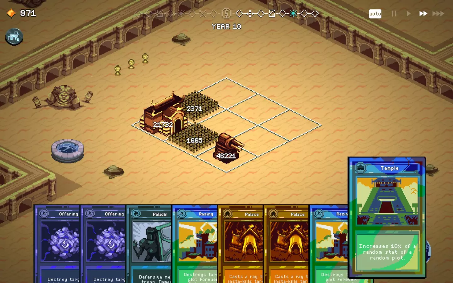 你可以使用【土方工程】摧毁你的满级神庙,获得3张1级神庙卡牌和2个免费地格。重新部署它们并升级。重复此操作,直到数量变得离谱并导致游戏崩溃。当然,这也适用于你想要复制的其他卡牌。