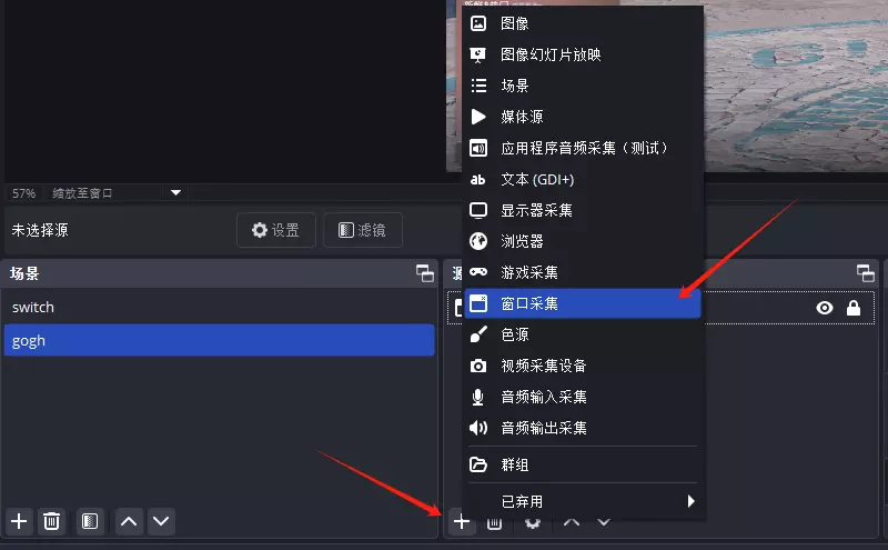 点击添加的场景,在分类【源】内添加窗口采集的源