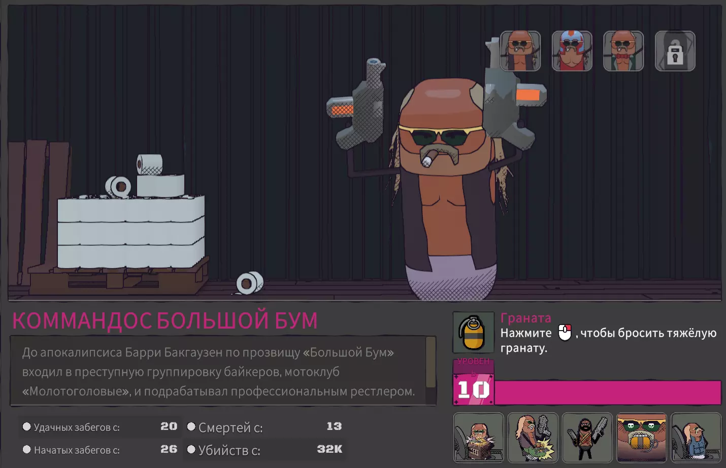 初始技能: 1. 每个任务都会获得5个弹匣,和其他人一样。 2. 所有武器的基础弹药量增加30%。 3. 商店中机枪和霰弹枪享受25%折扣。 4. 倒下(死亡)时会在自己脚下投掷一枚手榴弹(F键触发),顺便一提,这个 perk 可以在商店或宝箱中获得。 5. 游戏开始时拥有护甲。(不过还挺不错的) 优势:
