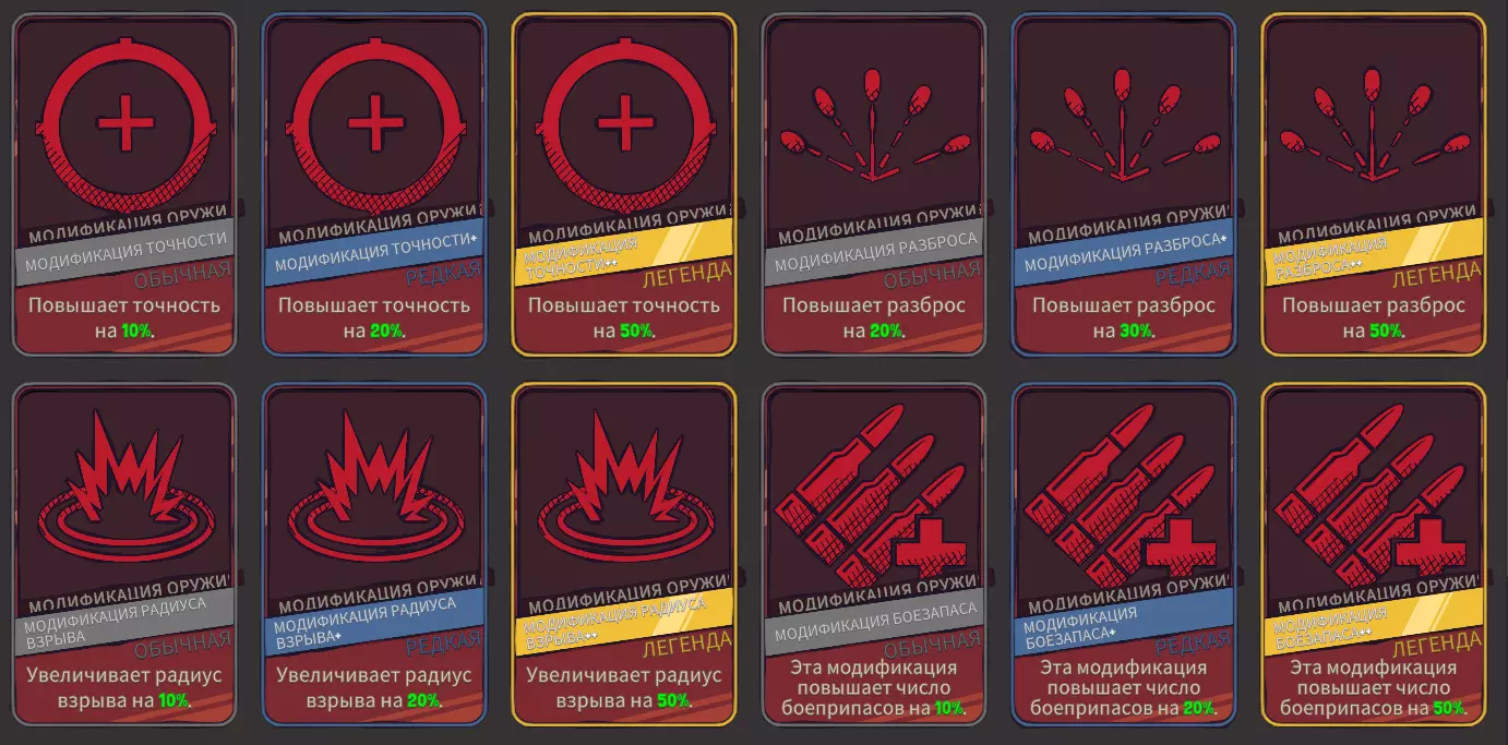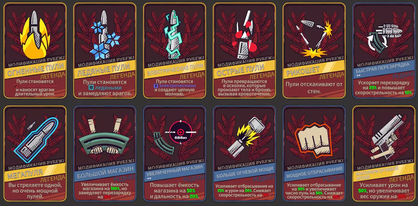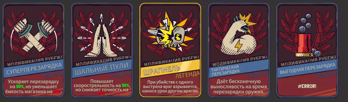 边界改装 边界改装是武器升级后提供的强化,每次升级后会出现2个改装选项(在进行2次、3次、4次普通升级后)。 这些改装大多需要购买,当然也有初始就可用的。事先说明,【 ricochet 】不会延长射击距离,虽然它是传奇品质,但增益不大,而【 shrapnel 】是个强力部件,用一发子弹击杀敌人时会对周围所有敌人造成50-100%的伤害,对付【 клещам 】效果尤其好。 一个部件不够用,可能需要【 ракетомет 】或【 автомат 】,之后我会尽量了解清楚并补充。 【 выгодной перезарядки 】的俄语描述有问题,所以我从英文翻译一下——每025秒的重新装填时间会增加一发子弹。 从1.02版本开始,破片弹成为了传说级模组。 现在来说说我遇到的困扰,我花了10多个小时试图找到缺失的模组,并且已经向开发者寻求帮助,他们提示说这个模组适用于自动步枪和冲锋枪,看来那天我只是运气不好,希望能有好运气降临到工作室。