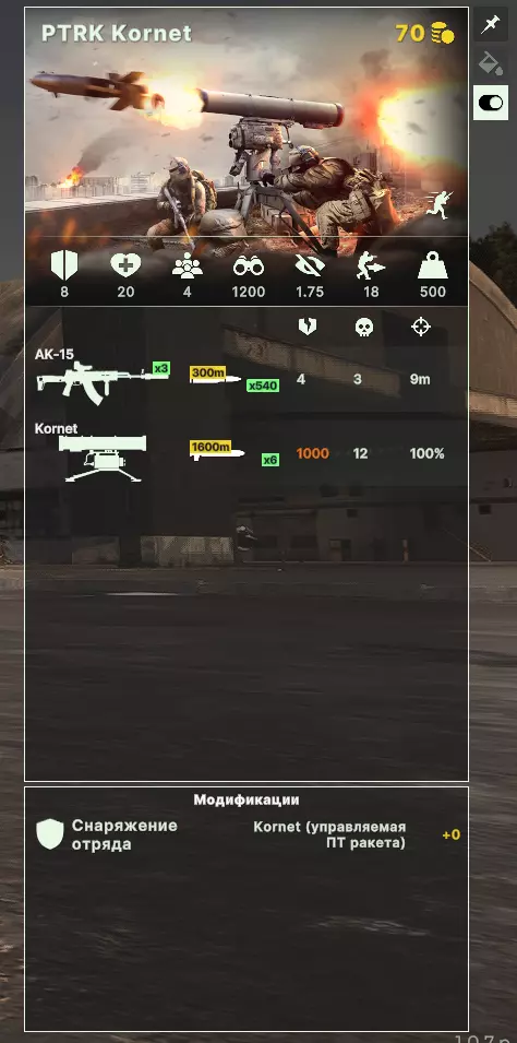 这类单位包括配备便携式武器和机枪的步兵侦察兵。他们既可以直接用于突击,也能与狙击手协同作战。其隐蔽性数值仅低0.5,但拥有更多的弹药储备和更多样化的武器,甚至包括便携式防空导弹。 非常适合在敌方出生点瞬间摧毁其轻型装甲防空单位和炮兵。 3. 无人机