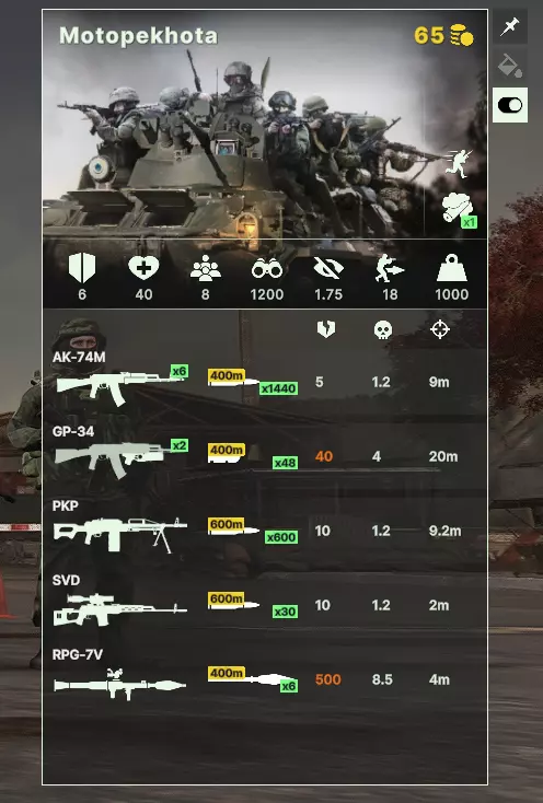 游戏中的侦察载具与普通载具相比,唯一的区别在于其突然提升的隐蔽性和可见性。这类载具具有很强的情境适应性,但若能掌握相应的操作技巧,便能充分发挥其作用。 INF——步兵 重要提示:请记住,任何步兵单位在前线的存活时间都可能不超过5分钟,这是正常现象。所有步兵都是消耗品,其主要用途是造成最大伤害、进行牵制,或者相反——在其他单位的支援下发动大规模冲锋并吸引火力。 1. 重型消耗型步兵。