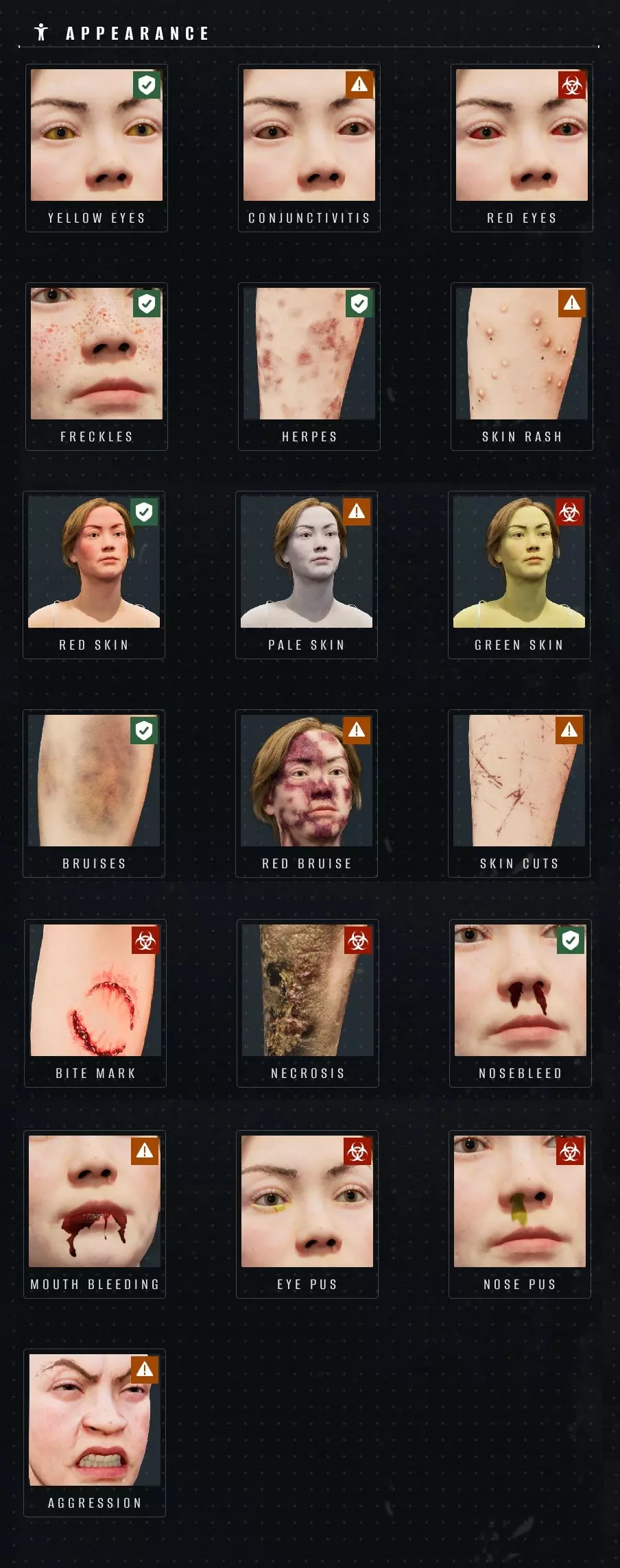 黄眼睛(默认开启) 结膜炎(默认开启)——当人物眼睛出现红色时,很可能是结膜炎。它与“红眼”症状不会混淆,因为后者的眼白会呈现鲜红色。 红眼(默认开启)——与“结膜炎”不会混淆,当人物出现“红眼”症状时,其眼白会呈现鲜红色。换句话说,如果你不能确定某人有红眼症状,那么95%的可能是结膜炎。雀斑(默认显示)仅出现在面部。疱疹看起来更像皮疹,有时可能与雀斑混淆,但雀斑绝不会出现在面部以外的任何地方。皮疹看起来比实际皮疹要轻微——如果你看到丘疹(尤其是带有白头的丘疹),那就是皮疹。红色皮肤(默认显示)仅出现在面部;肤色越深,可能越难看到该症状(手电筒有帮助)。苍白皮肤(默认显示)整个肤色会显得苍白;肤色越深,可能越难看到该症状(手电筒有帮助)。绿色皮肤(默认显示)看起来【并非绿色】(很可能是一个漏洞),而是看起来更像类似黄色皮肤;换句话说,如果你看到《辛普森一家》里的角色——那就是“绿色皮肤”症状。 淤青(默认显示)——有时可能会被误认为污垢(使用能去除污垢的扫描仪升级会有帮助),通常也会有一些黄/绿色斑点,但绝不会是蓝色或红色——那是另一种症状。 红色淤青(默认显示)——有时可能会被误认为普通淤青或坏死,可出现在身体任何部位,并非只在脸上(如图所示);看起来像是身体上的红色区域。 皮肤割伤(默认显示)——有时可能会被误认为污垢(使用能去除污垢的扫描仪升级会有帮助),大多看起来是有小伤口的小区域,但有时(尤其是在颈部或肩部)会出现大面积的多处割伤(此时看起来很像疤痕)。要点:但疤痕没有相关症状。 咬伤(默认显示)——外观与图片完全一致,可出现在任何部位。 坏死(默认显示)——与图片不符(图片所示更像腐烂),实际为红色瘀伤但呈黑色。我从未见过除黑色以外其他颜色的坏死。 流鼻血 口腔出血 眼脓——极难察觉,需近距离观察他人才能看到。 鼻脓 攻击性(默认显示)——有此症状的人会持续做出特定鬼脸并说出粗鲁或攻击性言论。部分人可能在没有“攻击性”症状的情况下说出粗鲁或攻击性言论——只需检查其鬼脸即可。具有【攻击性】特质的人员在被送往【清除区】或【隔离区】后,极有可能会攻击你(根据游戏内症状描述,他们也可能在检查过程中发起攻击——但我从未遇到过这种情况)。【热脉冲仪】