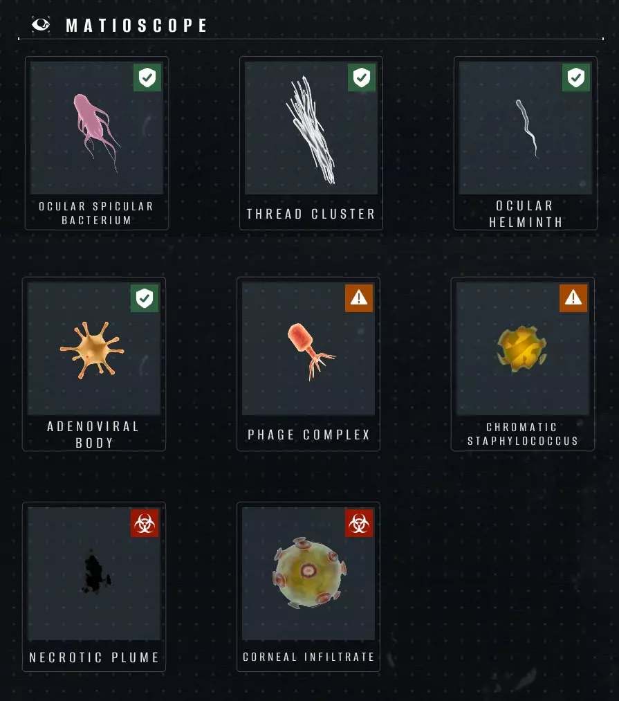 默认全部开启。除了【坏死羽流】(通常非常小)外,其他所有症状在调整好焦距后,无需移动即可从第一层直接观察到。注意,目前所有这些症状都存在 bug,在检查结果中无法被成功记录——对于有大量【matioscope】相关症状的人,你很可能会得到“检查不合格”的评价。X 光