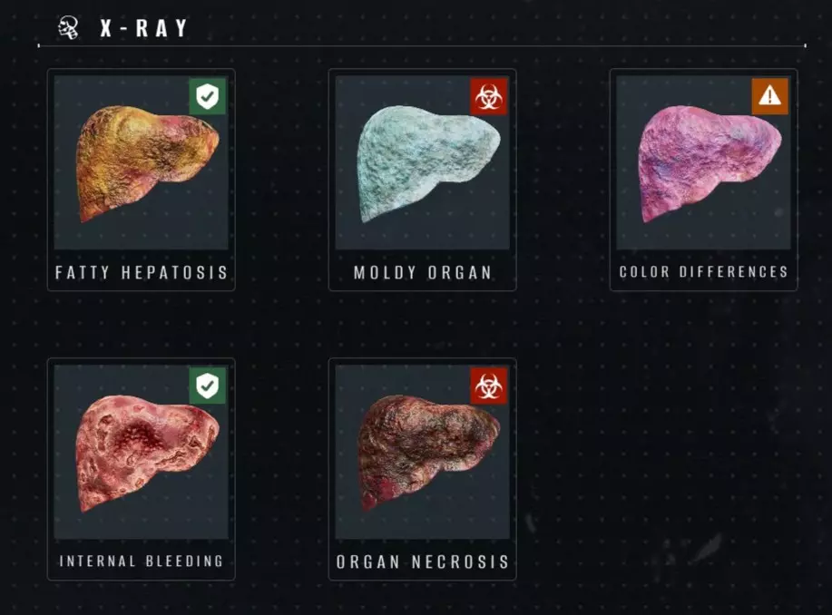 注意,所有症状也可能出现在大脑上,这只能在一种X光模式下看到。 脂肪肝:寻找任何带有黄色调的器官(脾脏除外,其天然颜色即为黄色——它几乎位于身体中部,靠近或在肺部下方,在任何X光模式下都几乎难以看到)。 霉变器官:寻找器官上的蓝色调。 颜色异常:寻找器官上相当明显的紫色/粉色调。 内出血(默认显示):很难识别,因为出血的器官看起来几乎和健康器官一样红,可根据患者的动作判断(如果患者捂住肚子,而你没有看到任何异常颜色——很可能是内出血)。内出血通常不会像现实中那样伴随(红色)淤青(公平地说,淤青本质上就是内出血)。器官坏死——观察器官上的黑色阴影,其颜色不像皮肤上的“坏死”那样深,但仍可察觉。