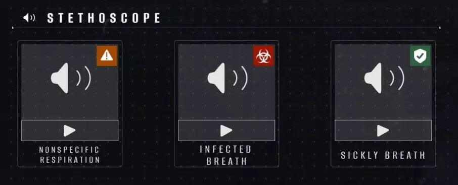 虚弱呼吸(默认开启)——吸气时伴有沉重的呼吸声(获得听诊器后会立即遇到此症状) 非特异性呼吸——听起来与“虚弱呼吸”症状几乎相同,但在吸气和呼气时都能听到沉重的呼吸声 感染性呼吸——独特的声音,绝对不会错过,因为其中包含明显的咕噜声,尤其是在呼气时