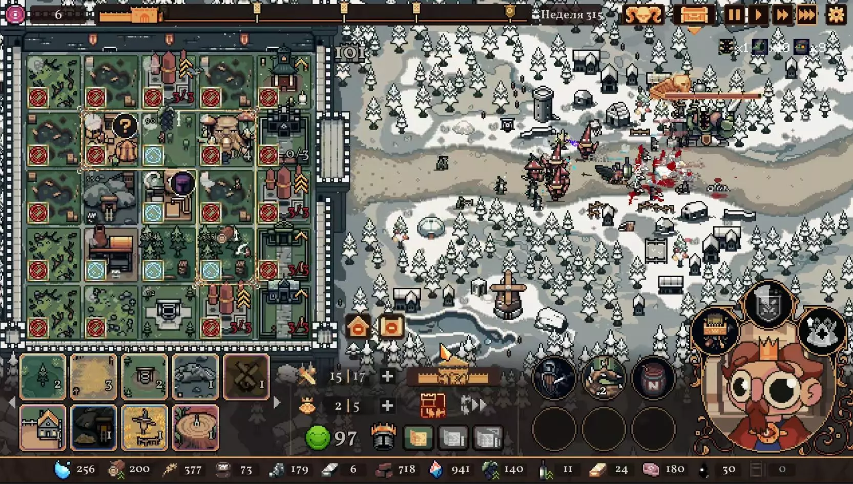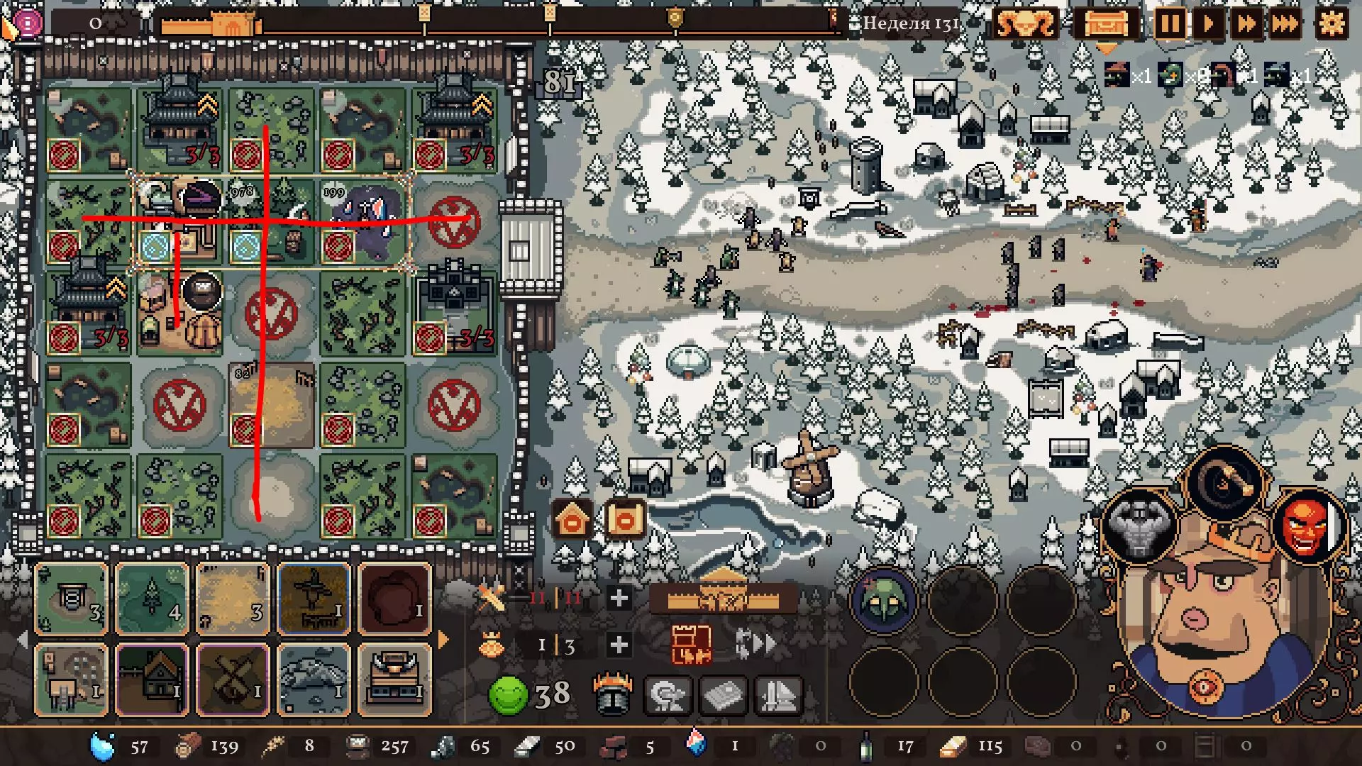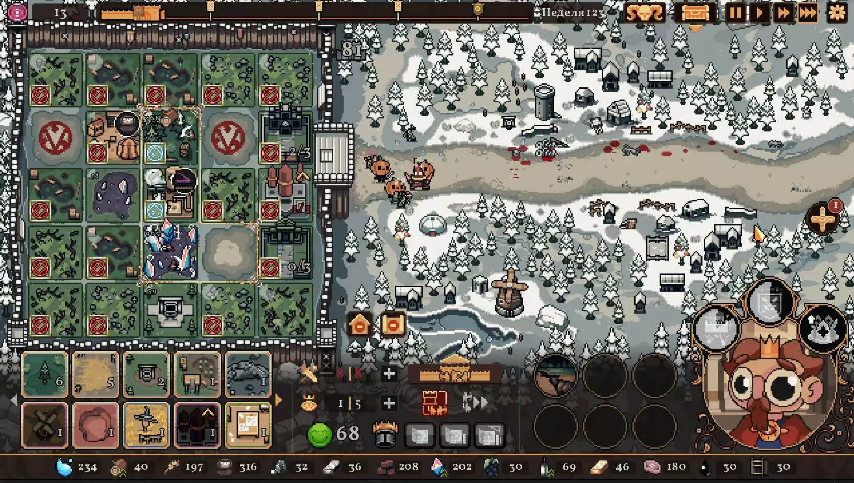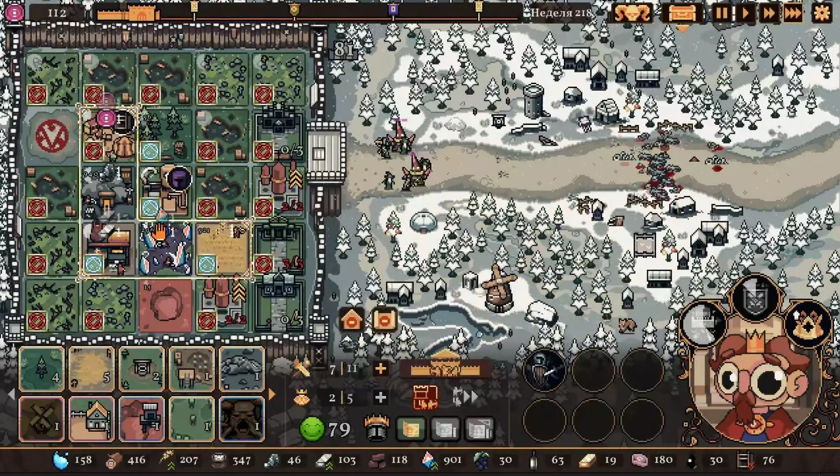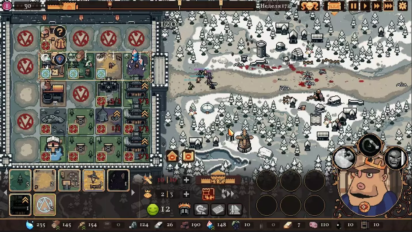 清理带有蓝色符文的格子。建造水井,然后种植小麦和树木。在旁边的空地或红色格子上建造市场并出售小麦。目标是快速积攒资源建造研究中心,并开始研究以下其中一种类型的部队:初级部队(刺客)或精英部队(水晶战士)。之后再根据游戏进展来决定是补充现有单位还是寻找其他单位。无论如何,一定要研究高级生产——面粉和铸锭。也就是说,如果对军队有信心,就研究生产;如果没有信心,就研究单位。 局势在任何情况下都很大程度上取决于随机因素。有时就是不顺利,找不到所需的资源,得不到神器,甚至在第五回合后都抽不到需要的单位。 所需资源(参考): 对于水晶单位——3-4个200单位的水晶(或1个1000单位的水晶),2-3个200单位的黏土。之后——2-3个铁矿,每个200单位资源,或者1个铁矿1000单位资源;1-2块麦田;1-2个锯木厂。 对于流民来说,大体上也是如此,只是需要更多的铁矿,以及1单位的水晶和1单位的黏土。 如果在大约第120周时,你还没有强力单位,那么在规划敌人波次时,最好只选择一种类型的敌人。不要贪心。 对付第一个 boss,有1个水晶战士、初始的2个火枪手,再加上一些流民作为支援就足够了。我的选择是狂徒。它们由黏土建造而成,生命力顽强,能够提升士气并对敌人造成伤害。 第二个首领战如果遇到龙就很糟糕。这家伙会把所有远程单位都烧成灰烬。战术是:先把法师藏在城堡里,开始时只留1个单位。每完成一个阶段,再放出一个。 到这个时候,需要用强大的单位来加强军队,并且一定要添加治疗师。要开始生产锭和面粉,通过采集木材来增加军队上限。第三个首领 通常此时资源已经足够,单位数量应该会受限于人口上限。如果所有科技都已研究完成,研究中心可以拆除;否则应研究基础设施科技,以建造竞技场、医院和/或国王雕像。有时建造精灵井和佛教寺庙会很有用。非常重要的是建造英雄雕像,并持续升级单位(冠军+法师或新兵)。 1. 博杜安