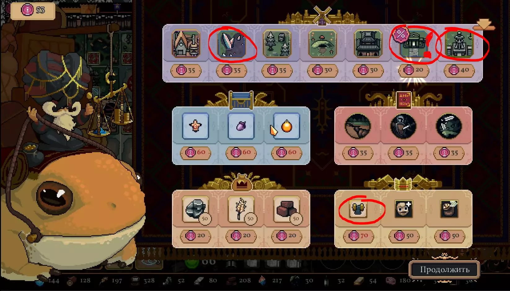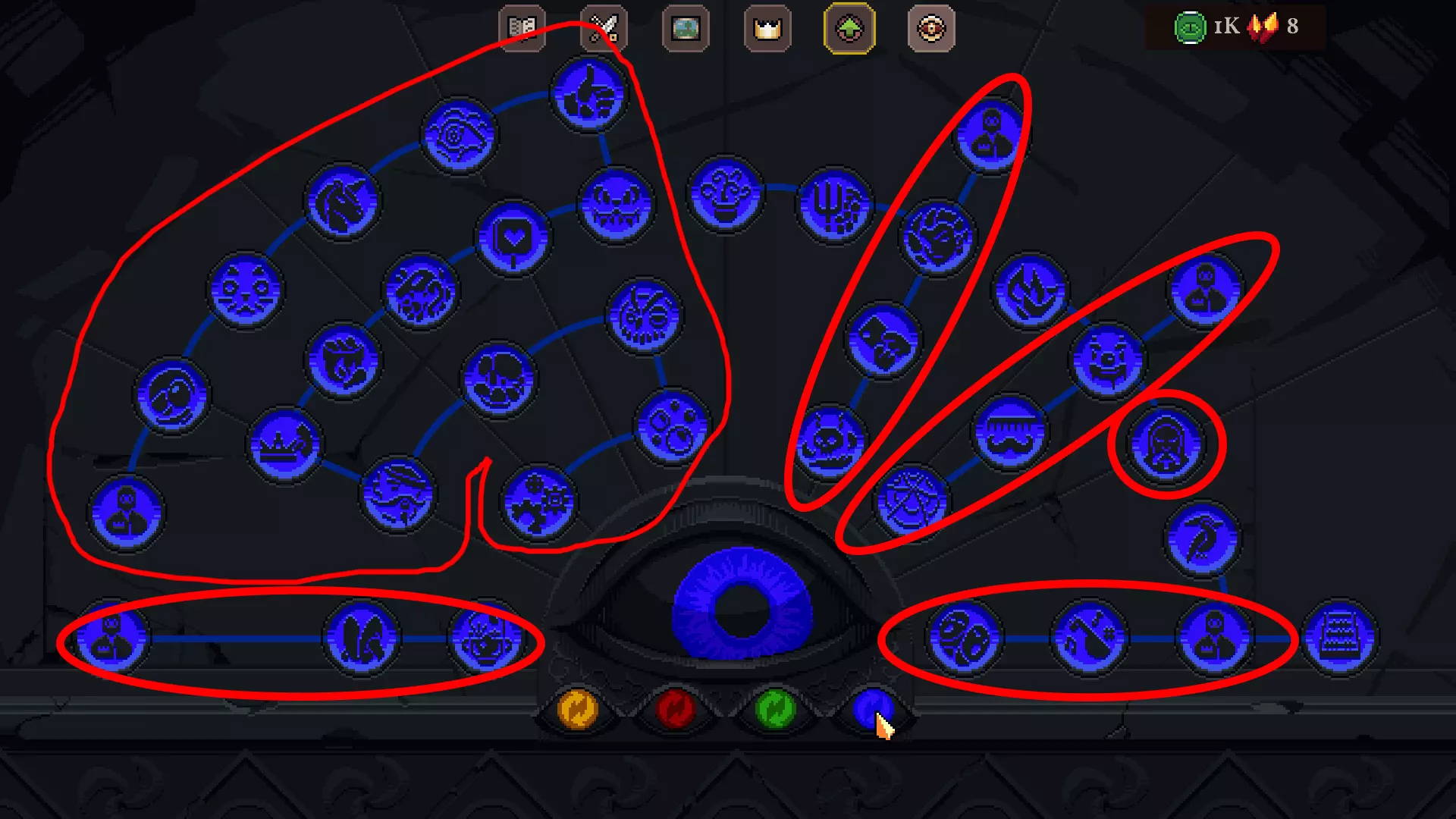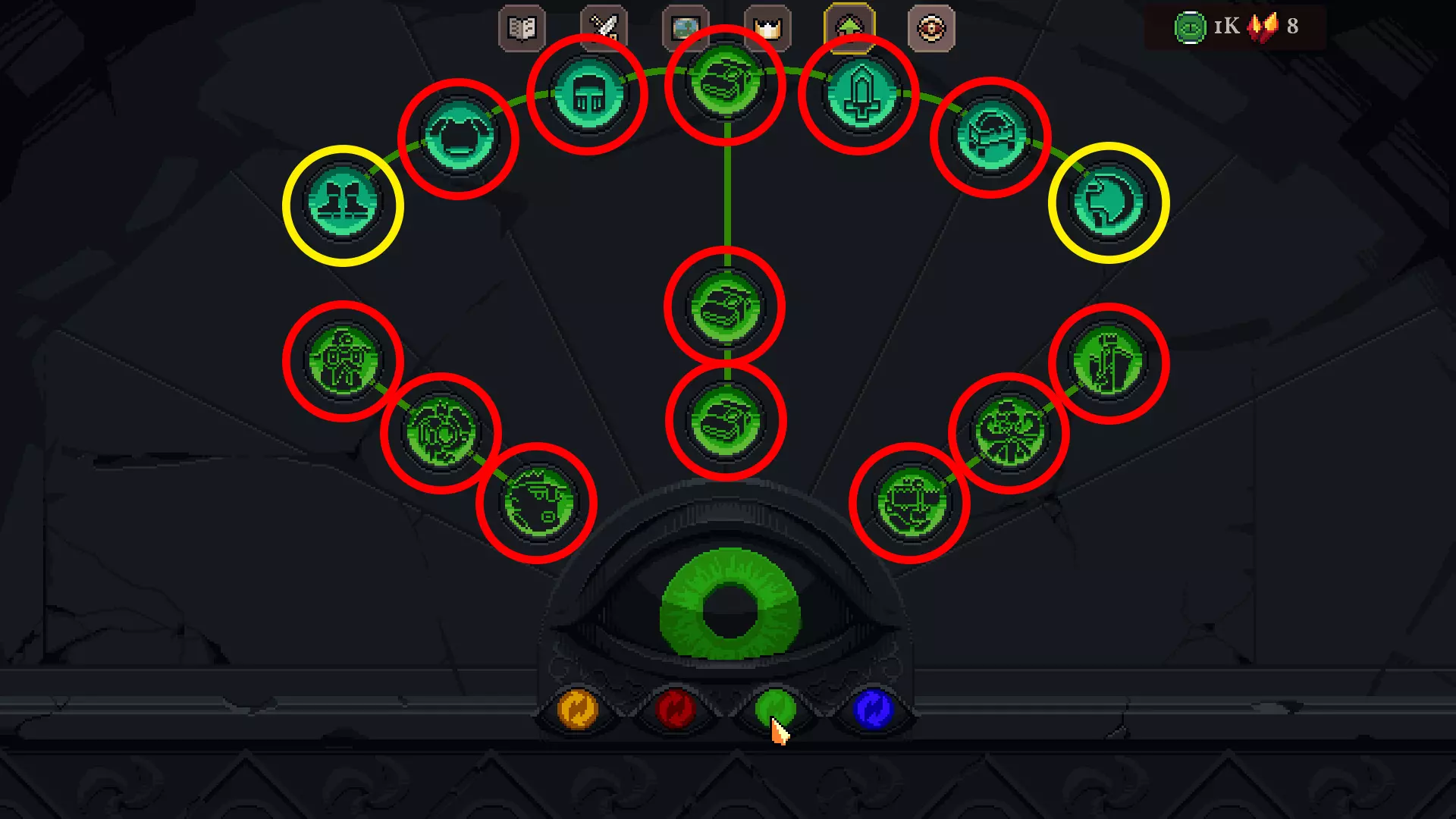 ### 如何轻松为每位国王通过第10关的提示与技巧 前言 各位国王,欢迎! 第10关是一场严峻的考验,仅靠运气已远远不够。你将面临数十种负面效果,任何微小的失误都会受到惩罚。这一关需要你清晰理解游戏机制、合理管理经济,并了解每位统治者的优势。在本指南中,我详细介绍了适用于所有人的通用通关原则,以及每个国王独有的策略,凭借这些策略我成功通关了村庄10级。这些策略也可作为其他地点通关的基础。 升级 解锁的升级越多,通关10级的几率就越高。我将列出最必要的升级。 【红色标注的是最重要的,黄色标注的是值得选择的。】 1.黄眼:必须获取印记,因为在10级时大多数格子都带有减益效果。