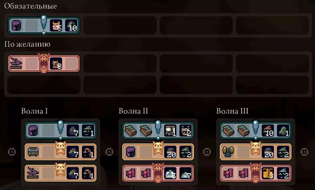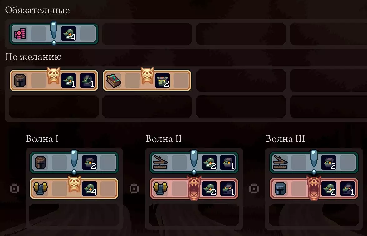 战术 发展路线选择 我主要建议通过两种策略进行游戏: 1. 强力单位(精英) 核心:水晶战士(或蜥蜴战士)+治疗者+闪电法师+投石机 支援:仙子、鞭挞者、火枪手 重要提示:水晶战士必须获取所有强化!在事件、商店中寻找,并选择作为波次奖励。关于【獠牙怪】的注意事项:尽管它们非常强大,但生产难度较高(需要【葡萄】+【肉】,而制作【肉】还需要【面粉】)。这条生产链比【水晶】+【黏土】更难构建。适合将它们作为次要单位,或者在运气好获得肉(例如通过 artifact)时使用。 训练士兵时优先选择【唤法师】/【冠军】。如果没有,则选择【弓箭手】。 2. 新兵(“流浪汉”)基础配置:【狂战士】+【刺客】+【治疗者】+【剑士】+【投石机】。支援单位:医院、闪电法师/鞭挞者。 刺客是游戏中最强的单位之一。作为基础单位,他们拥有高额生命值和高额伤害,获取强化后这些属性还会大幅提升。 所有新兵单位都能与刺客形成良好的协同效果。例如狂战士。大剑兵和投石机可以强化刺客。此外,还可以选择治疗师和精灵,因为半人马也属于新兵单位,能获得增益效果。士兵训练 - 优先训练新兵。如果没有新兵,则训练弓箭手。 选择优先级: 初期最好选择单位+资源。 商店方面:优先升级(尤其是针对水晶单位的升级)。 关键建筑(必要的单位图纸和生产设施(钢铁、面粉和肉类))。 有用的 artifacts。 单位升级。 资源放在最后考虑。只有在特殊情况或需要支援时才使用法术。