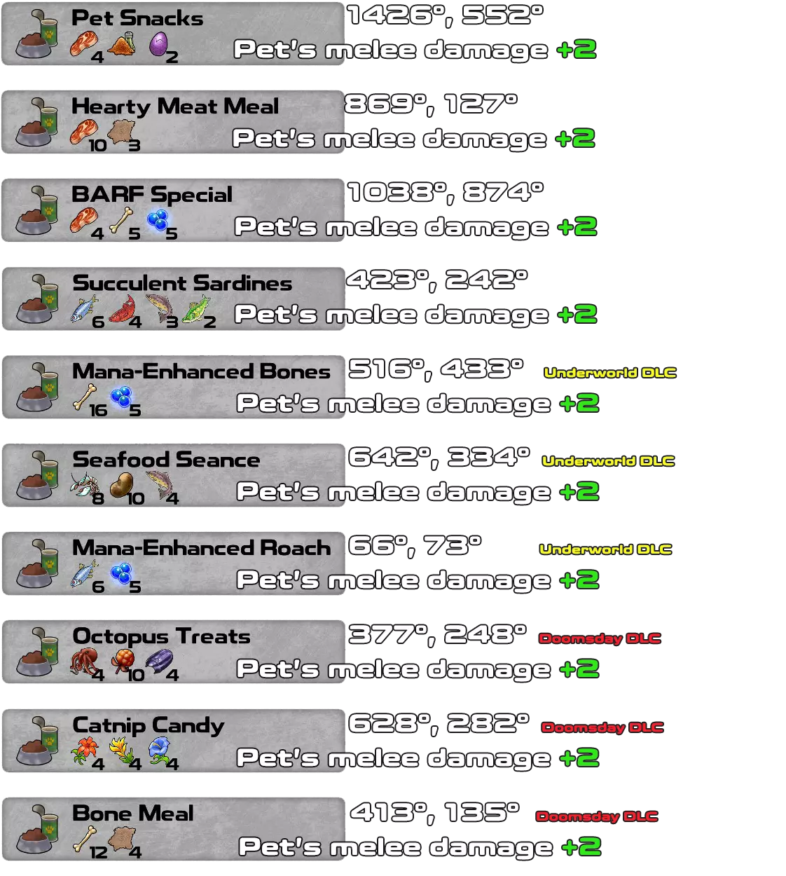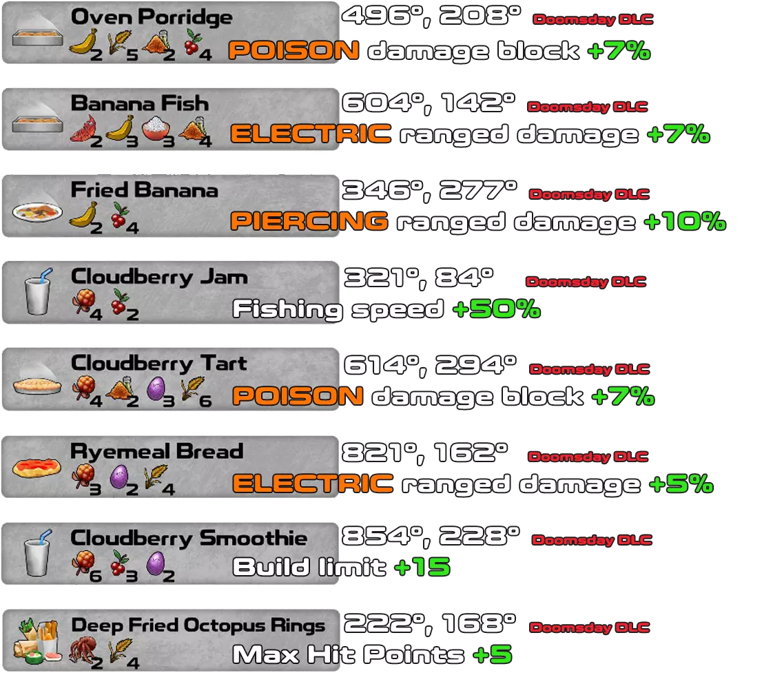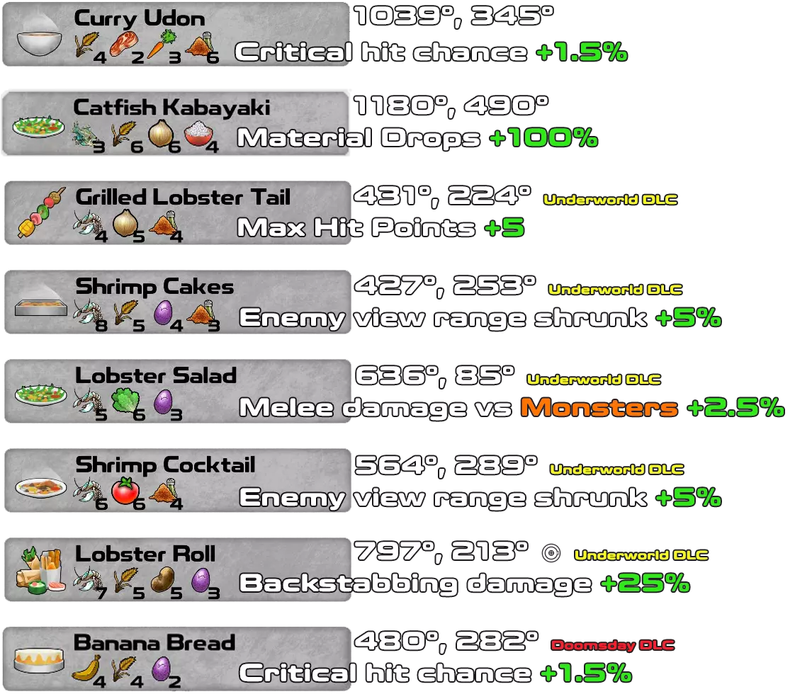 这是游戏1.4.0.41版本及所有DLC(Underworld、Doomsday和Pets & Dungeons)的配方书。 一旦拥有材料并知道所需物品,无需蓝图即可制作配方。材料必须按照确切的顺序和数量排列,配方才能生效。 对于Pets & Dungeons DLC,情况略有不同,因为某些材料在找到配方之前不会显示在材料列表中。我添加了游戏中每个配方的坐标,以便轻松找到所有配方。大多数配方是该DLC新增的宠物地下城的奖励。 第一行
