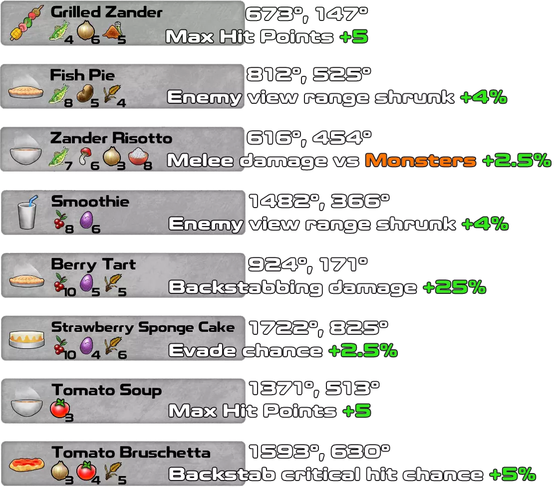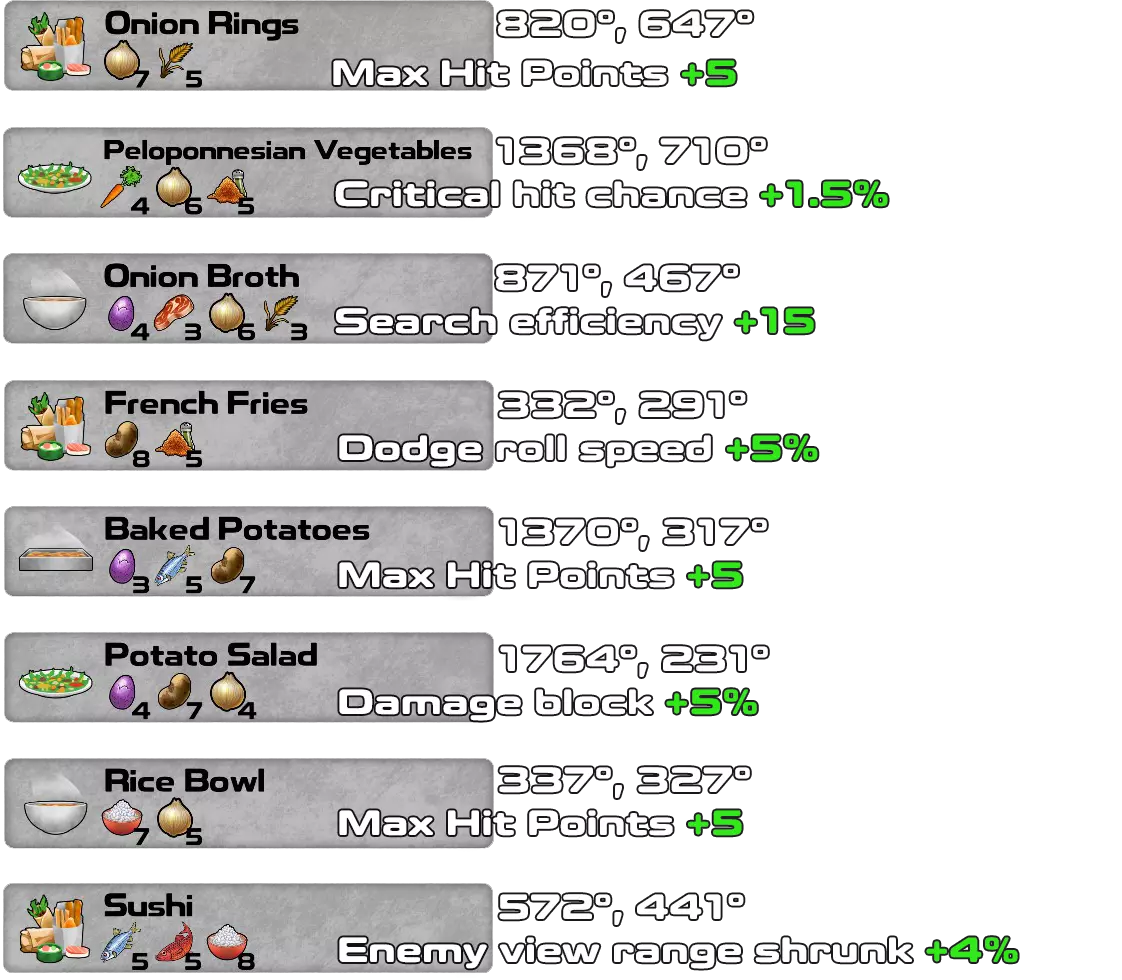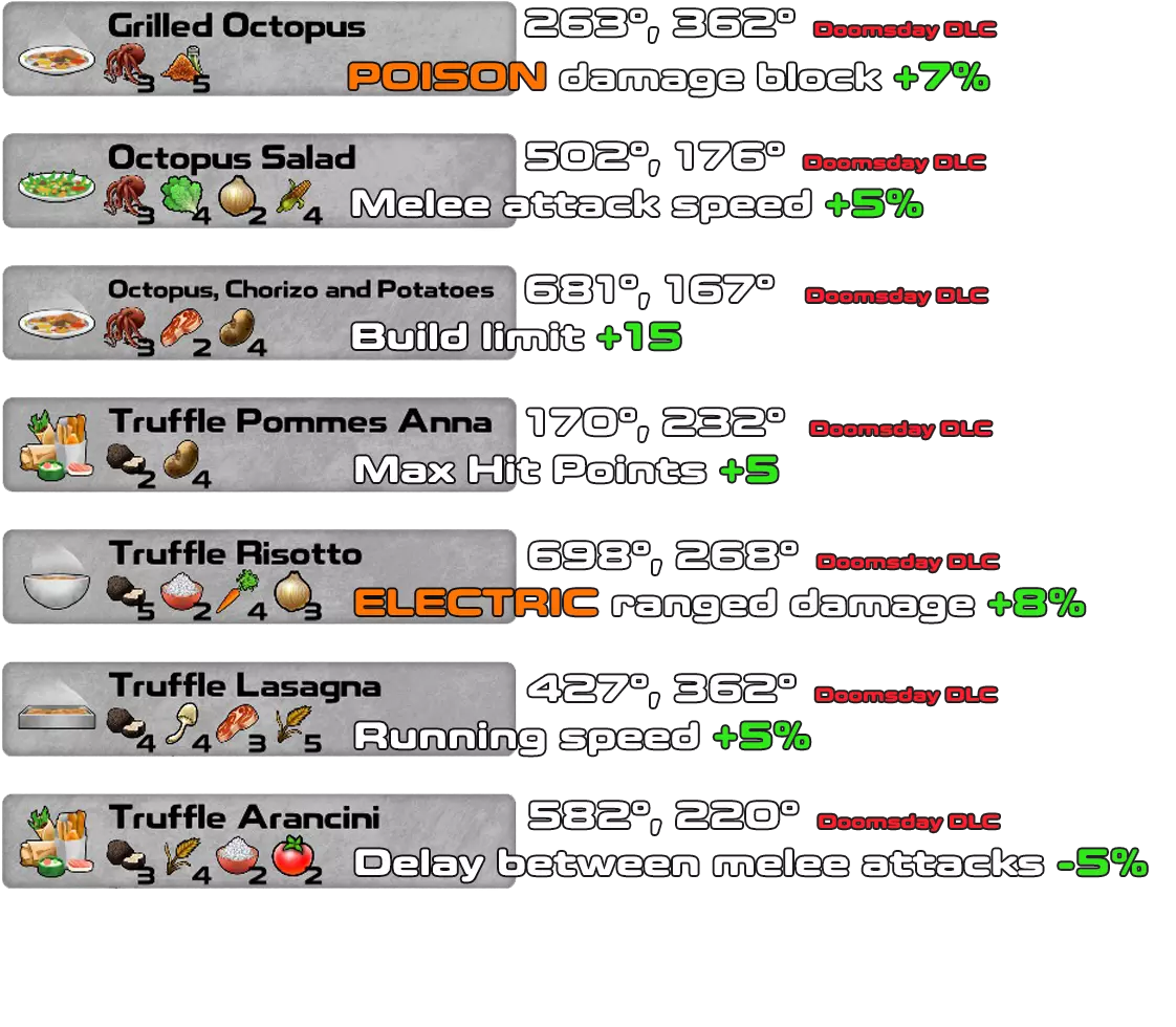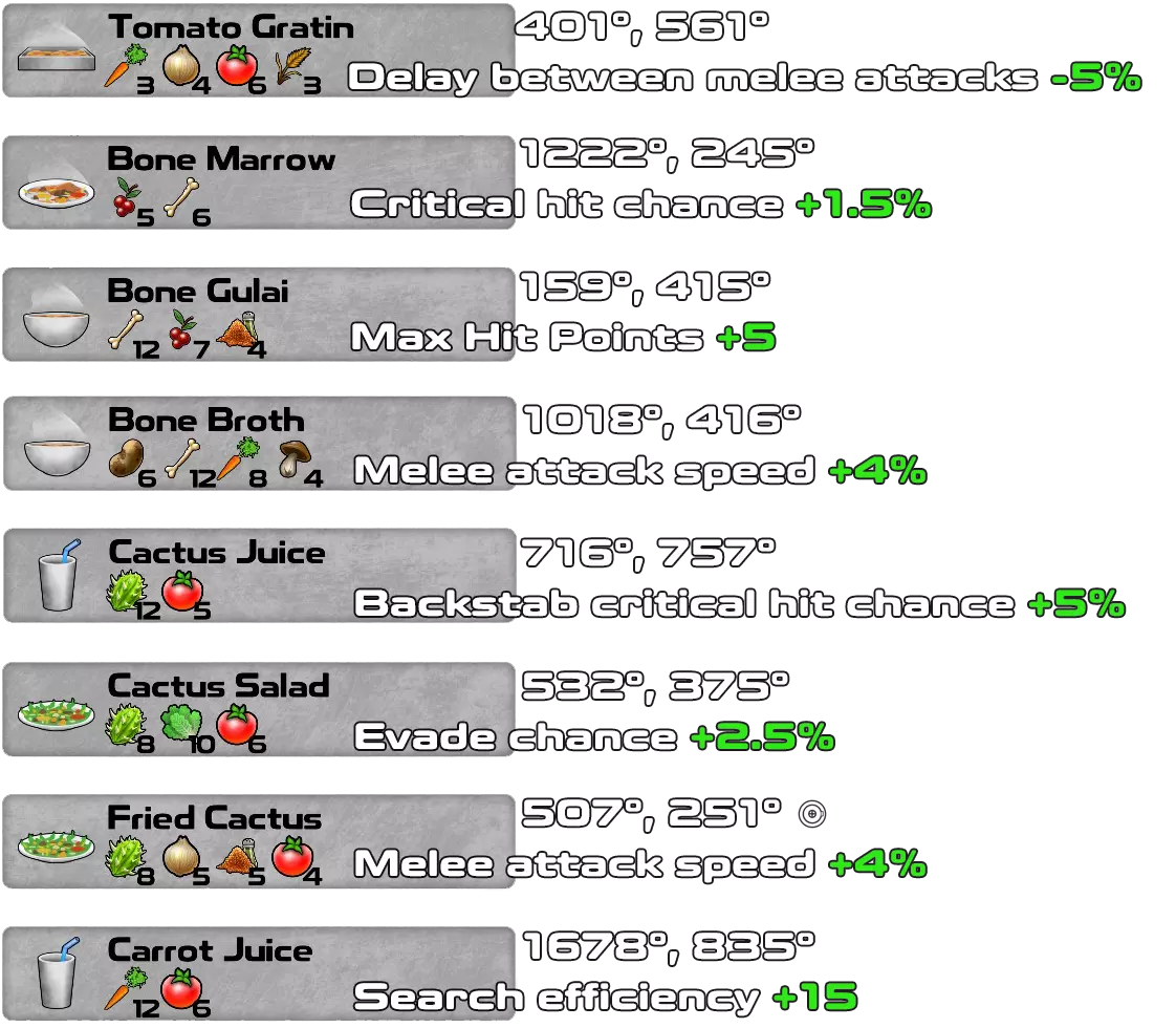 这是游戏1.4.0.41版本及所有DLC(Underworld、Doomsday和Pets & Dungeons)的配方书。 一旦拥有材料并知道所需物品,无需蓝图即可制作配方。材料必须按照确切的顺序和数量排列,配方才能生效。 对于Pets & Dungeons DLC,情况略有不同,因为某些材料在找到配方之前不会显示在材料列表中。我添加了游戏中每个配方的坐标,以便轻松找到所有配方。大多数配方是该DLC新增的宠物地下城的奖励。 第一行