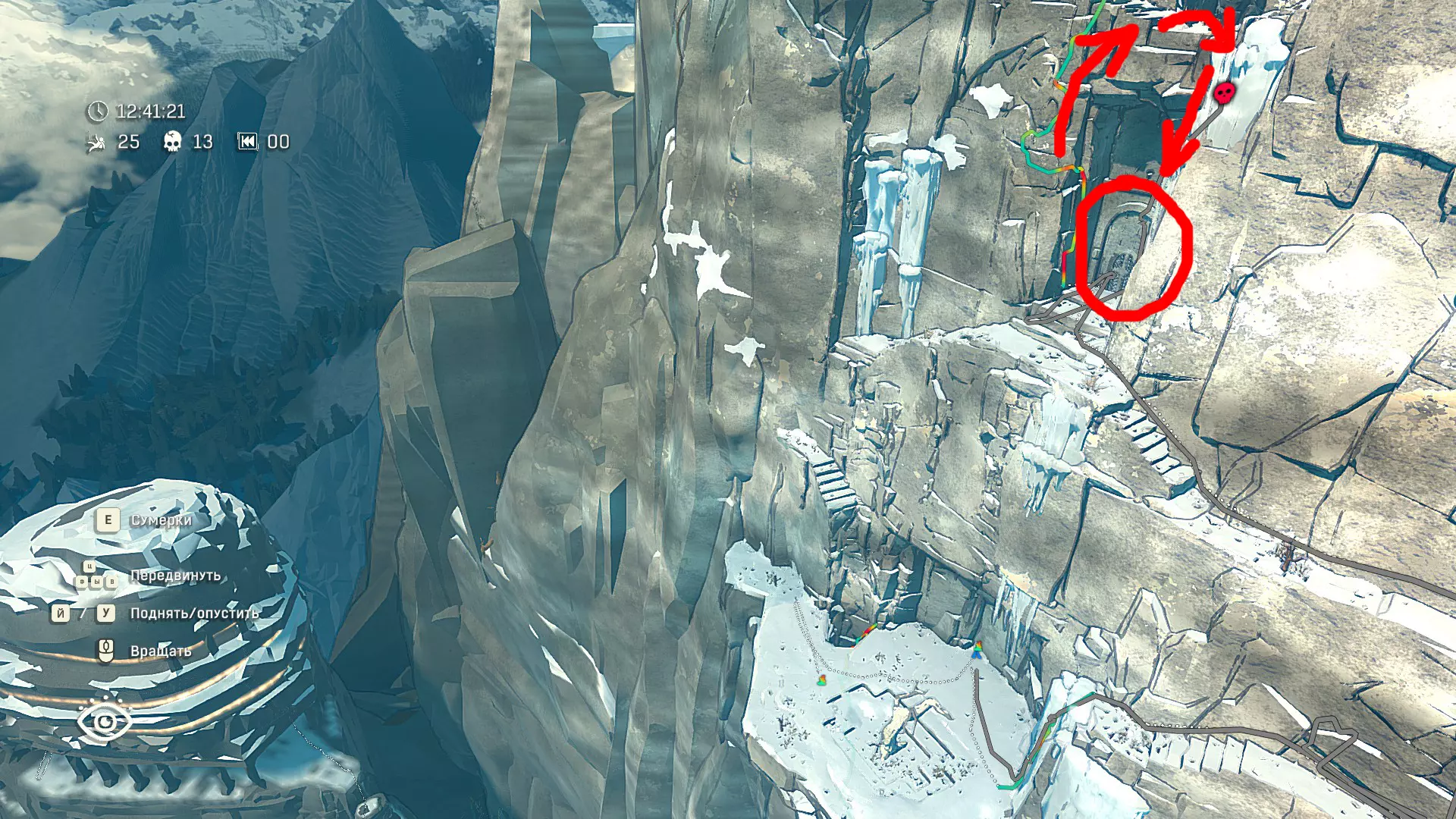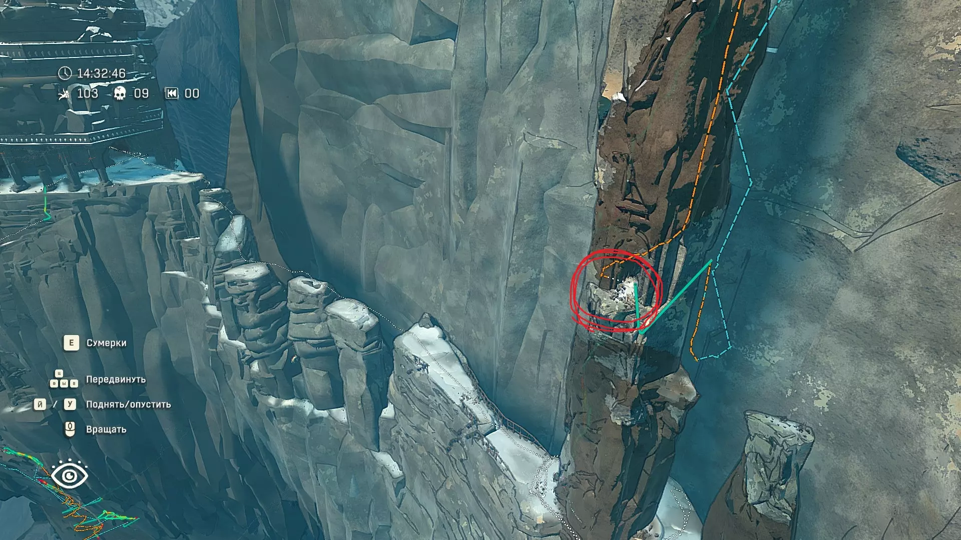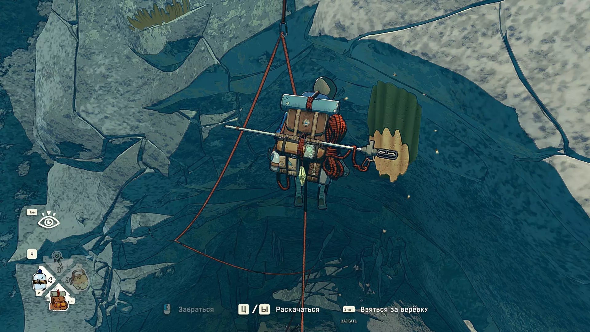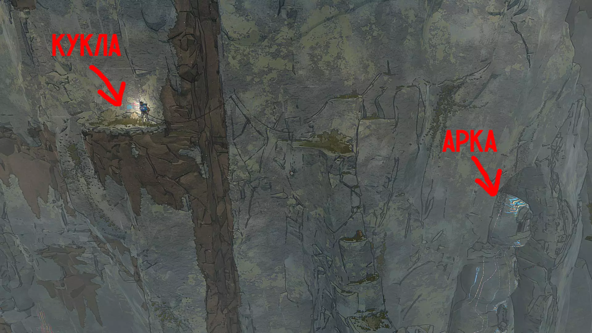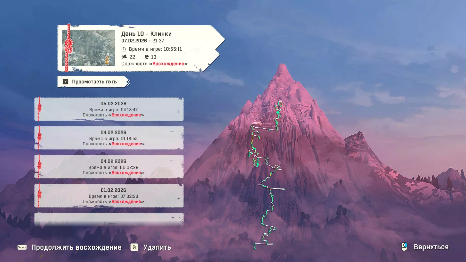 Полное руководство со скринами. Можно завершить за 1 заход (главное выбирайте концовку с уходом с горы, иначе придётся начинать всё сначала) Основные моменты перед началом сбора ачивок Игру можно проходить на любой сложности, на получение достижений это не влияет В идеале изучить либо все разделы руководства до начала игры, либо все разделы до «Достижения по порядку от низа до верха Ками» и начать игру, параллельно ориентируясь на указанный выше раздел Ближе к концу игры будет возможность либо спуститься с Марко, либо продолжить восхождение на Ками. Выбирайте сначала спуск, смотрите концовку, а только потом возвращайтесь в точку сохранения и выбирайте подъем. Иначе игру придется проходить во второй раз 10 лайфхаков Лайфхаки и советы по прохождению (их всего 10, дальше все ачивки со скриншотами): 1. Можно смотреть маршрут выше/ниже, изучать нужные места либо с помощью Esc — Фоторежим, либо через Tab — Alt (он же Esc — Загрузить). В фоторежиме на третьей вкладке есть управление временем суток и погодой. Если управление погодой заедает, то просто поменяйте его еще раз. Tab сам по себе дает небольшой кругозор, а Alt уже позволяет летать намного дальше. Q (Й) и E (У) меняет высоту. 2. Когда хотите спуститься вниз, стоя у склона, игра выдает два варианта: спуститься через английскую Е (русскую У), либо через левую кнопку мыши. При первом варианте вбивается крюк, при втором нет. Но если во время вбивания крюка нажимать одну или несколько любых кнопок, то крюк ломается. 3. Максимально экономьте крюки. Они никогда не бывают лишними. Поэтому если после одного участка сломалось сразу крюка три, то это хороший повод откатиться к предыдущему сохранению (если позволяет сложность игры). Вообще, в любой ситуации откат к сохранению помогает. Например, его можно использовать после получения затратной по ресурсам ачивки. 4. Сломанный фотоаппарат, который дается после прохождения карты из демки и выбора «Начать восхождение» в начале игры, нужно утилизировать на Q (Й). Это необязательное, но сюжетное действие, о котором упоминается в монологе Аавы после звонка Криса. 5. Вставать на автостраховку можно несколько раз. Например, если крюк вбит перед сложным моментом, на котором Аава сама бы упала, то можно встать на автостраховку, пролезть до момента, когда она вот-вот упадет, встать на автостраховку, а потом снова лезть. 6. Если долезли до ровной поверхности, но Аава не становится на нее, а продолжает якобы лезть, то спрыгнуть можно на правую кнопку мыши. Главное убедиться, что точно есть, куда спрыгивать, и Аава от этого не улетит в пропасть. 7. На скалодроме можно найти много крюков и монет как внизу, так и забравшись наверх после касания финиша и побродив там. Сверху или с любого места на скалодроме можно просто спрыгнуть на правую кнопку мыши: неприятно, да, но хп не снимет. 8. Смотрите на соотношение размера и пользы. Например, если большой предмет в рюкзаке дает мало еды, то проще его съесть и занять чем-то полезнее. 9. За монеты на скалодроме можно купить из еды: - Злаковый батончик: +40 еды - Бодрящий мармелад: +10 еды - Фруктовый батончик: +30 еды, -10 воды - Изюм: +20 еды Из питья: - Желтый як: +20 воды, 1 минута хватки - Горная кола: +20 воды, 2 минуты выдержки Я каждый раз беру 1 желтый як, 1 горную колу и на остальные монеты закупаюсь злаковыми батончиками. Можете делать по-другому, теперь список со все