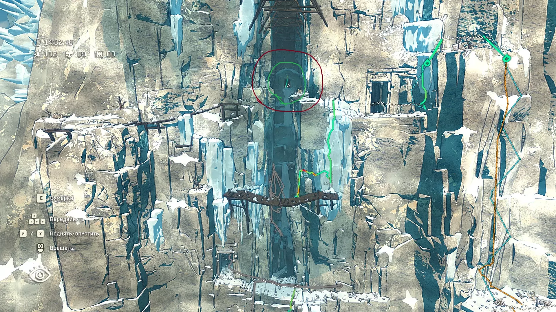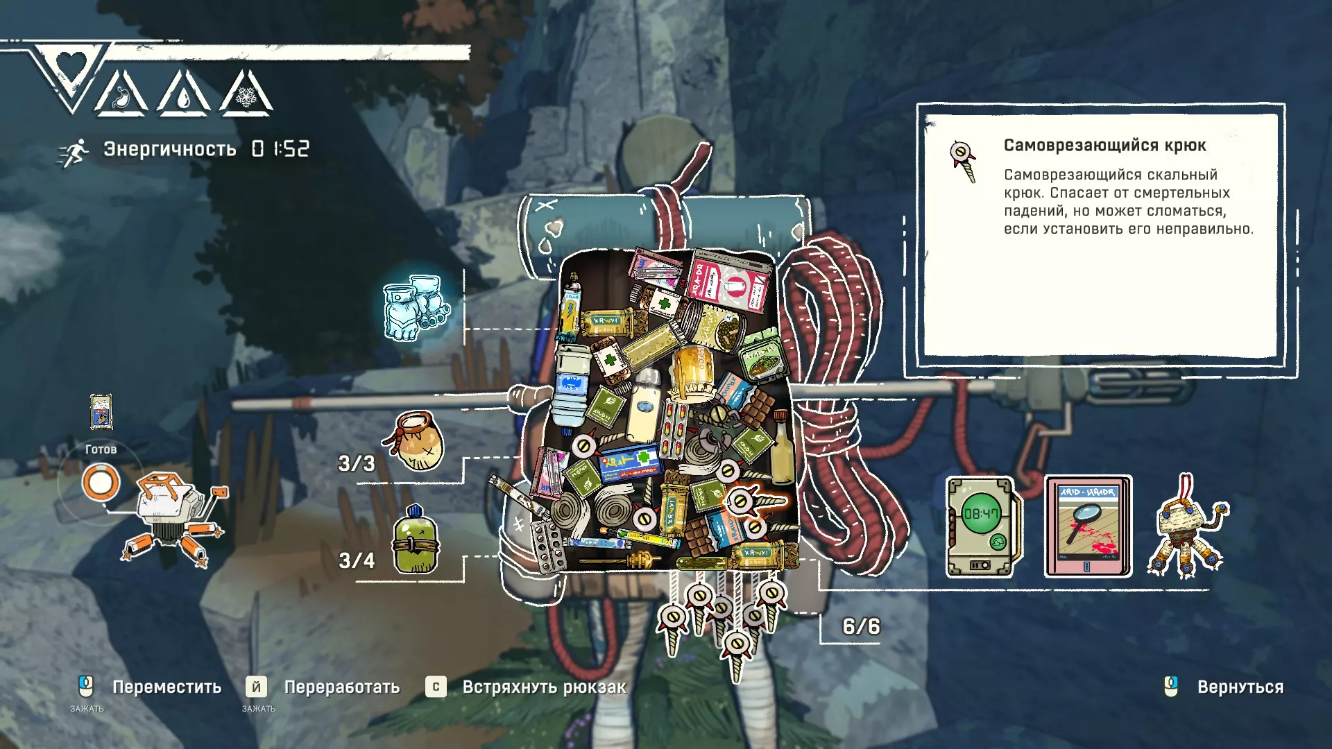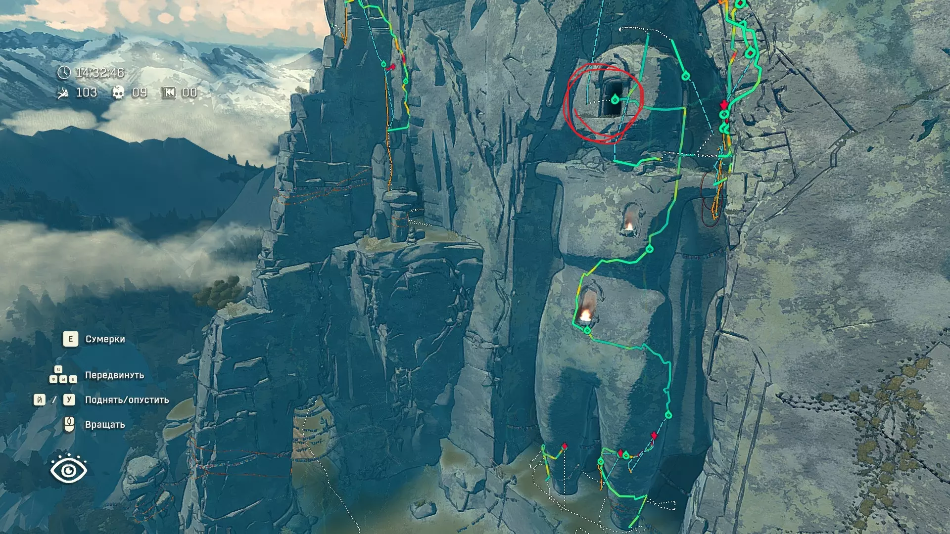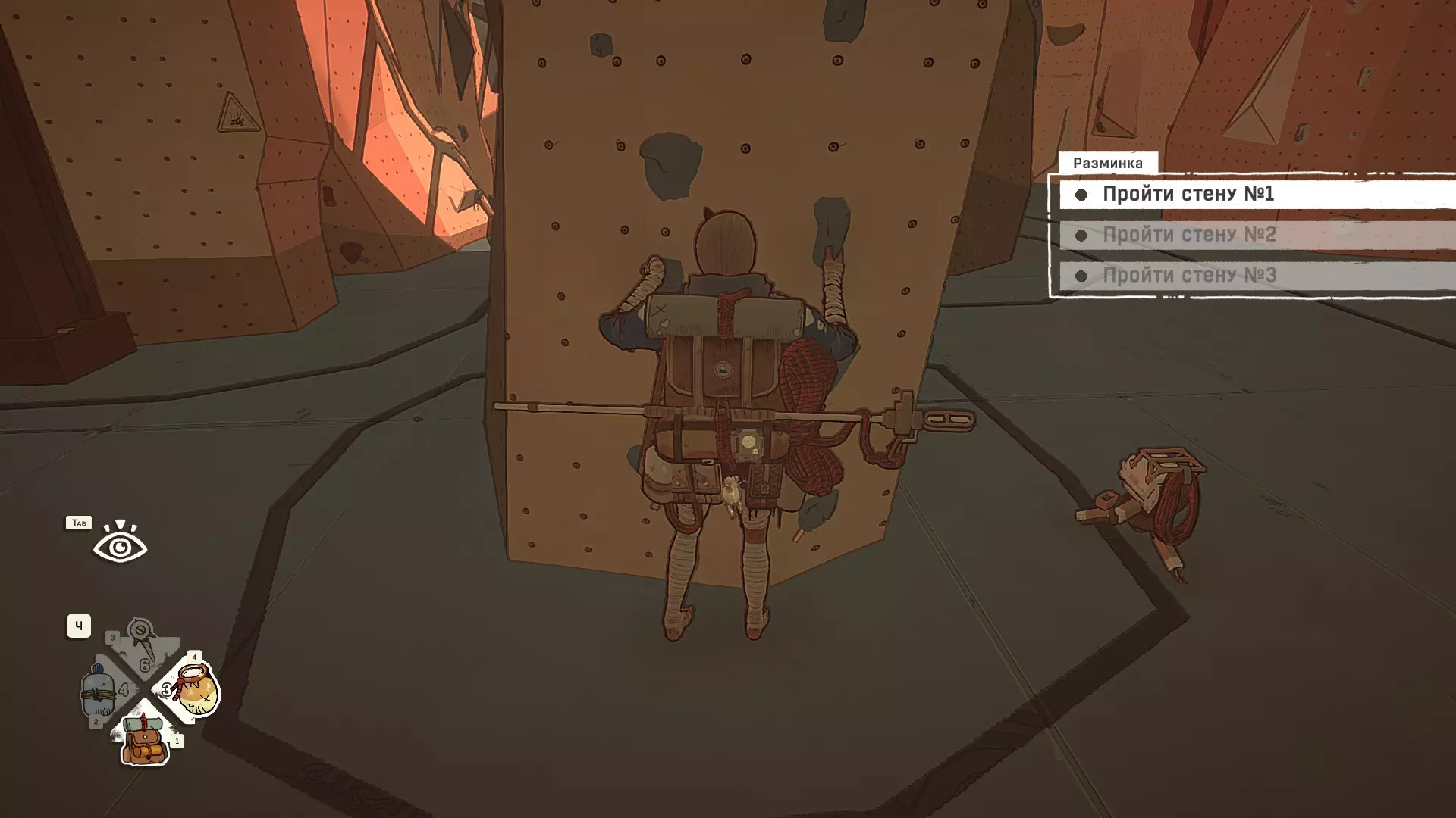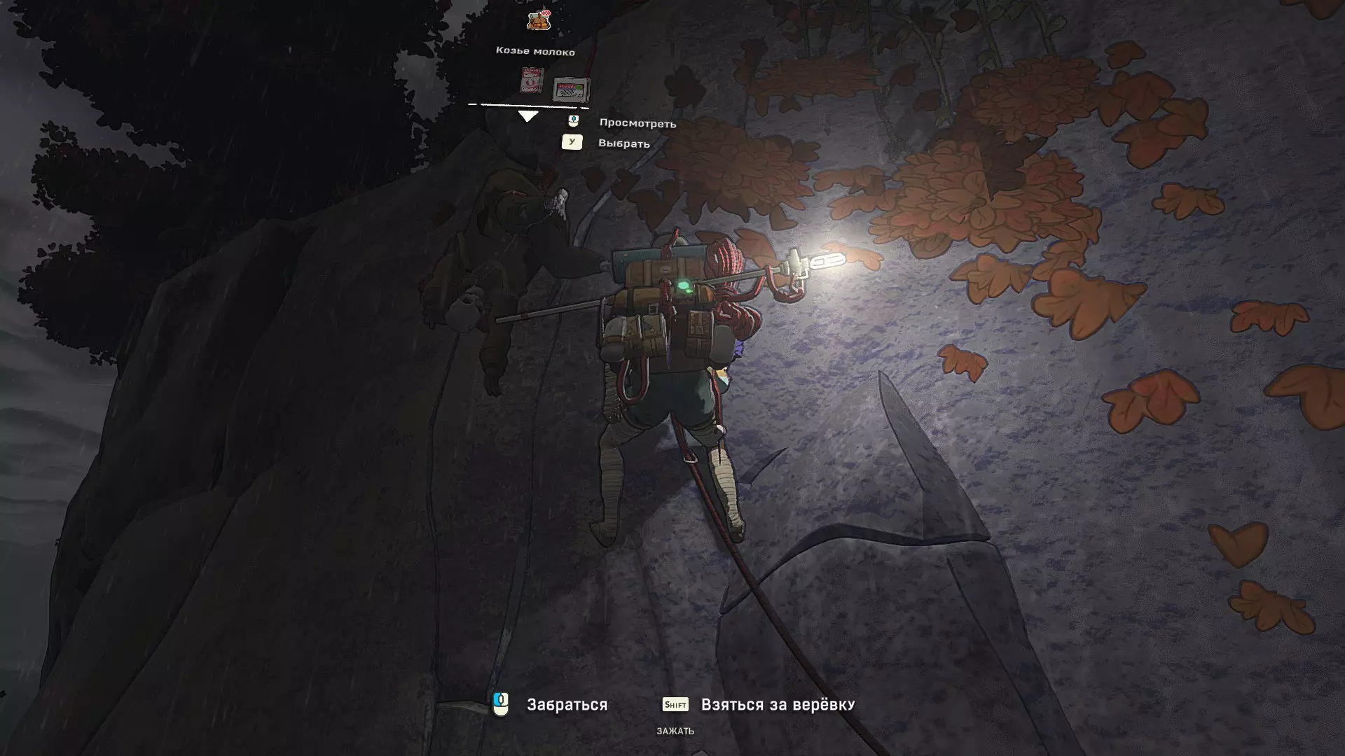 Полное руководство со скринами. Можно завершить за 1 заход (главное выбирайте концовку с уходом с горы, иначе придётся начинать всё сначала) Основные моменты перед началом сбора ачивок Игру можно проходить на любой сложности, на получение достижений это не влияет В идеале изучить либо все разделы руководства до начала игры, либо все разделы до «Достижения по порядку от низа до верха Ками» и начать игру, параллельно ориентируясь на указанный выше раздел Ближе к концу игры будет возможность либо спуститься с Марко, либо продолжить восхождение на Ками. Выбирайте сначала спуск, смотрите концовку, а только потом возвращайтесь в точку сохранения и выбирайте подъем. Иначе игру придется проходить во второй раз 10 лайфхаков Лайфхаки и советы по прохождению (их всего 10, дальше все ачивки со скриншотами): 1. Можно смотреть маршрут выше/ниже, изучать нужные места либо с помощью Esc — Фоторежим, либо через Tab — Alt (он же Esc — Загрузить). В фоторежиме на третьей вкладке есть управление временем суток и погодой. Если управление погодой заедает, то просто поменяйте его еще раз. Tab сам по себе дает небольшой кругозор, а Alt уже позволяет летать намного дальше. Q (Й) и E (У) меняет высоту. 2. Когда хотите спуститься вниз, стоя у склона, игра выдает два варианта: спуститься через английскую Е (русскую У), либо через левую кнопку мыши. При первом варианте вбивается крюк, при втором нет. Но если во время вбивания крюка нажимать одну или несколько любых кнопок, то крюк ломается. 3. Максимально экономьте крюки. Они никогда не бывают лишними. Поэтому если после одного участка сломалось сразу крюка три, то это хороший повод откатиться к предыдущему сохранению (если позволяет сложность игры). Вообще, в любой ситуации откат к сохранению помогает. Например, его можно использовать после получения затратной по ресурсам ачивки. 4. Сломанный фотоаппарат, который дается после прохождения карты из демки и выбора «Начать восхождение» в начале игры, нужно утилизировать на Q (Й). Это необязательное, но сюжетное действие, о котором упоминается в монологе Аавы после звонка Криса. 5. Вставать на автостраховку можно несколько раз. Например, если крюк вбит перед сложным моментом, на котором Аава сама бы упала, то можно встать на автостраховку, пролезть до момента, когда она вот-вот упадет, встать на автостраховку, а потом снова лезть. 6. Если долезли до ровной поверхности, но Аава не становится на нее, а продолжает якобы лезть, то спрыгнуть можно на правую кнопку мыши. Главное убедиться, что точно есть, куда спрыгивать, и Аава от этого не улетит в пропасть. 7. На скалодроме можно найти много крюков и монет как внизу, так и забравшись наверх после касания финиша и побродив там. Сверху или с любого места на скалодроме можно просто спрыгнуть на правую кнопку мыши: неприятно, да, но хп не снимет. 8. Смотрите на соотношение размера и пользы. Например, если большой предмет в рюкзаке дает мало еды, то проще его съесть и занять чем-то полезнее. 9. За монеты на скалодроме можно купить из еды: - Злаковый батончик: +40 еды - Бодрящий мармелад: +10 еды - Фруктовый батончик: +30 еды, -10 воды - Изюм: +20 еды Из питья: - Желтый як: +20 воды, 1 минута хватки - Горная кола: +20 воды, 2 минуты выдержки Я каждый раз беру 1 желтый як, 1 горную колу и на остальные монеты закупаюсь злаковыми батончиками. Можете делать по-другому, теперь список со все