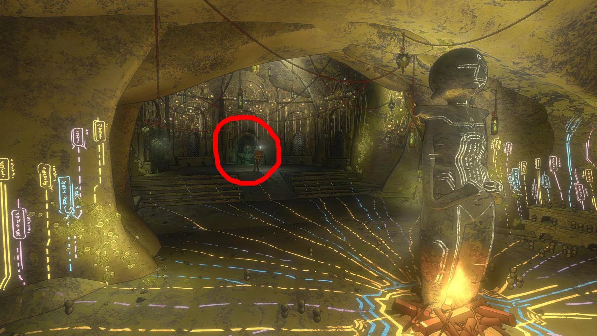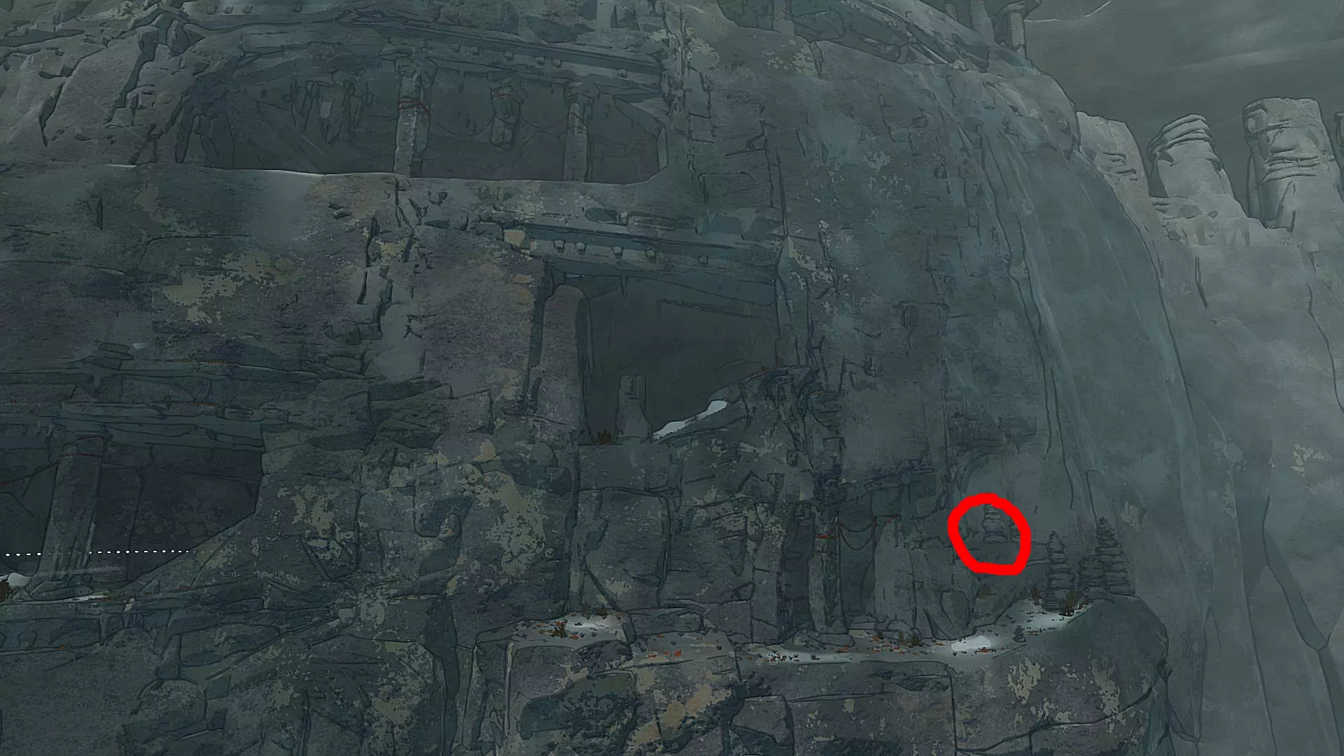 4. 第三个玩偶在区域右侧巨大雕像的上方
