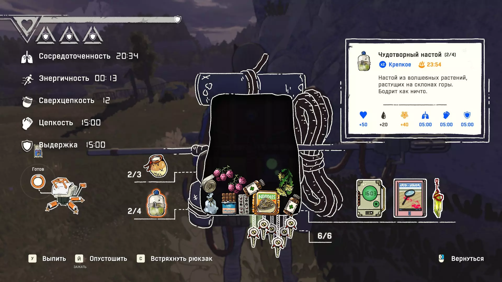 全力前进: 同时感受能量、连锁、超连锁、专注和耐力的影响 食物、饮料+镁 获得成就可借助神奇的浸液。其配方如下(烹饪成就部分,成就【Сила трав】),简而言之,就是水+任意草药,制成的浸液+任意草药,得到的浸液再+任意草药。注意观察屏幕右上角是否成功制成浸液。神奇酊剂可立即提供专注力、连击值和耐力。超强连击值可通过镁补充,活力值可通过其他方式补充。
