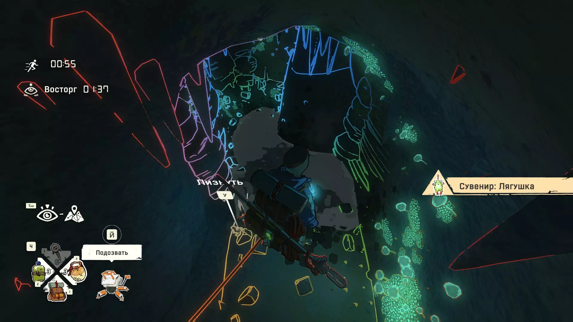 这里是最后一次可以完成成就【А зачем на свете мёд?】的地方。 成就【Аава Портер Бриджес】在此结束。同时进行的还有成就【Дитя погоды】。 关键是不要沉迷: 获得新体验,舔青蛙 第一只青蛙在第一个穴居人钩子左侧的洞穴里。第二只在第二次遇到马可的湖边,位于该区域左侧的洞穴中。点击动作按钮并查看结果。