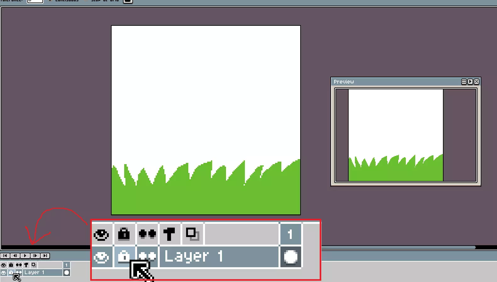 这是我的草丛。别吐槽它。它就是草丛而已。很酷的草丛。 现在用图层旁边的这个按钮把它锁定。这样你就不会把它弄乱了。 锁定后你就不能再在上面绘制了,但可以通过再次点击该按钮来解锁。