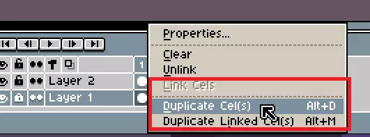 它应该是完整的,这意味着其中包含图像(因为你在上面绘制过)。 如果你右键点击图层上的圆圈,然后按“复制单元格”,它会将图片复制到下一帧。这就是我们想要的操作。现在就这么做吧。