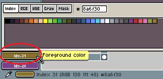 按X键可以切换已选择的色板。你也可以通过点击前景/背景按钮,或者直接点击并拖动上方的颜色图来更改颜色。