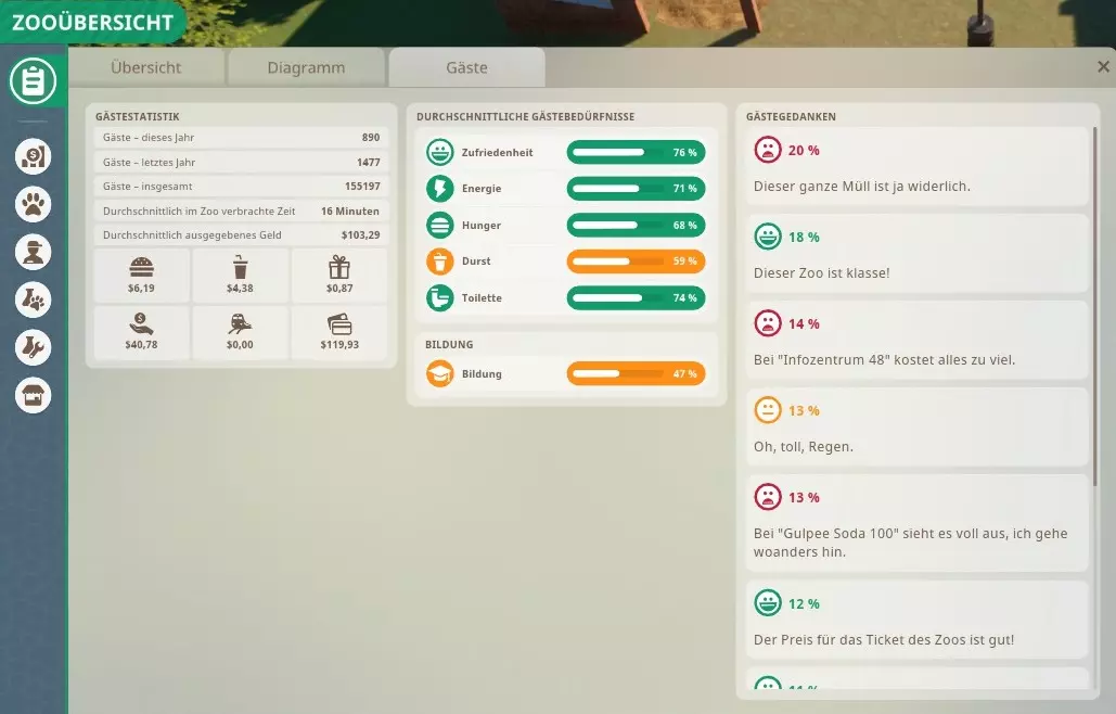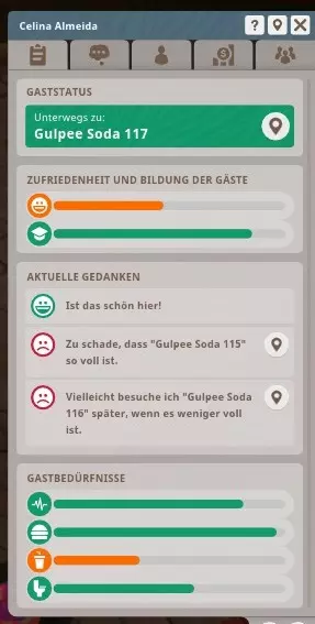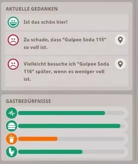 《动物园之星》中的每位游客都是随机生成的,且绝对独一无二。 所有游客都有6项基本需求需要被满足: - 满意度(详情见下文) - 教育性(详情见下文) - 精力(长椅、座位和交通工具,部分饮料类型也可恢复精力) - 饥饿(食品商店) - 口渴(饮料商店) - 如厕 满意度受其他5项基本需求的影响,原则上是所有需求的平均值。除了这5项需求外,满意度还会受到以下因素的负面影响: