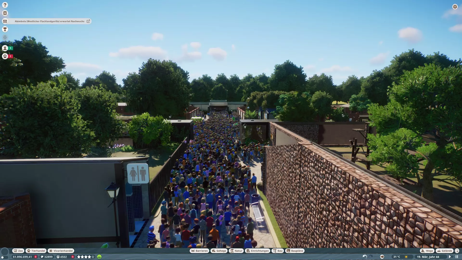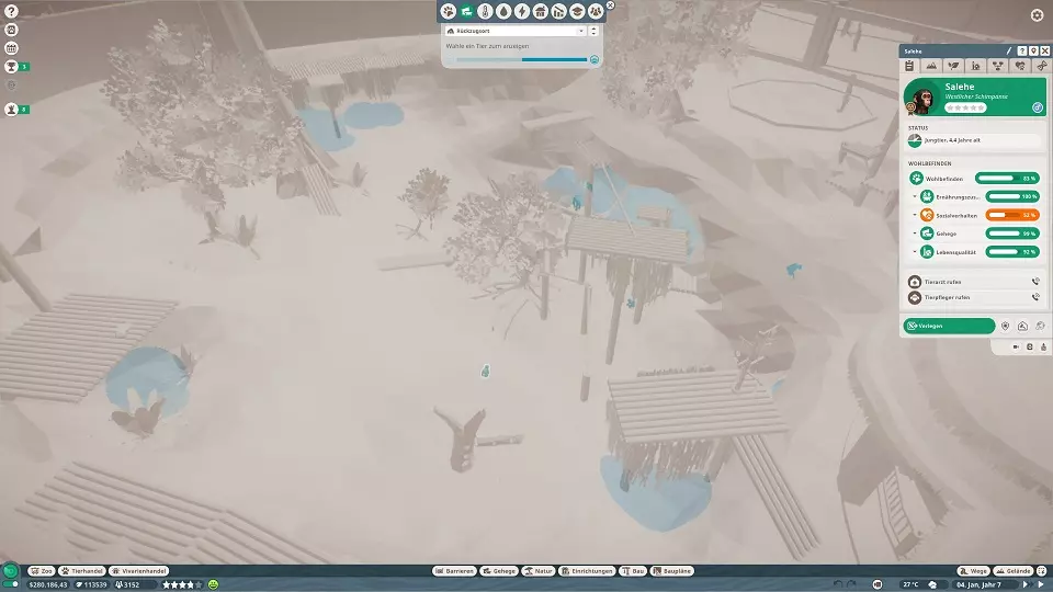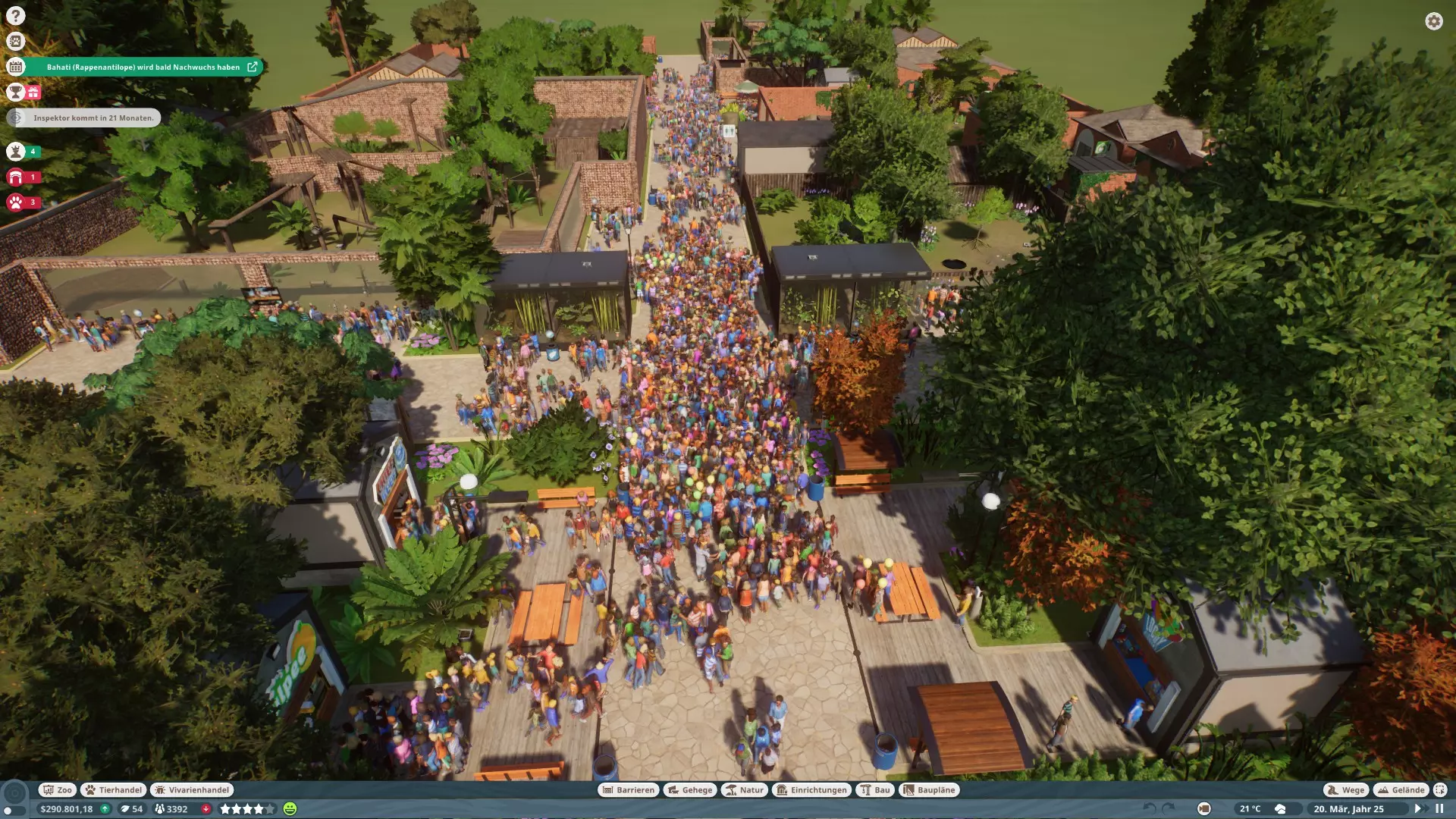 Hier sieht man nun auch mit grünen Linien die Objekte, die erklettert werden können. Und sollte ein Fluchtpunkt erkannt werden, werden an der Stelle rote Symbole angezeigt. Leider zeigt er diese aber scheinbar nur an, wenn man Objekte über die Barriere setzt und das Tier so direkt das Gehege verlassen kann oder Tunnel unter der Barriere hindurchgehen, selbst wenn das nur eine Höhle ist und er dort nicht raus käme. Würde das Tier in die Höhle gehen, würde es nicht entkommen, aber ihr würdet dennoch die Meldung erhalten und Gäste womöglich fliehen, da das Tier, die Barriere umgangen hat. Also einfach alles innerhalb der Gehegegrenzen machen. Was tun wenn ein Tier entkommen ist?Es gibt verschiedene Möglichkeiten, um ein entkommenes Tier wiederzufinden. Rufen eines Tierarztes ein Tierarzt wird zum Tier rennen, mit einem Blasrohr betäuben und es anschließend zu seinem Gehege zurück transportieren das Tier kann sich natürlich solange der Tierarzt noch nicht da ist, weiter austoben Notfall dies kostet 1.000, unabhängig vom Tier, und führt zum sofortigen Verpacken und Versenden an die Ausstellung Workshopinhalte Einige haben immer wieder Probleme mit Workshopinhalten. Ich selber habe noch keine benutzt, aber aus Erfahrung mit eigenen Bauplänen kann ich schonmal folgendes sagen: Alle Objekte in einem Bauplan müssen bereits erforscht sein, sofern man Ihn woanders nutzen möchte, sonst ist der Bauplan mit einem Schlosssymbol versehen und kann nicht verwendet werden. Sollte man ein Gehegeobjekt drin haben, muss man eventuell erst das entsprechende Tier erforschen, damit auch dieses freigeschaltet ist. Hatte bisher jedenfalls noch keine Probleme mit eigenen Bauplänen, abgesehen von der nicht vorhandenen Forschung. sonstige Tipps Sollten plötzlich irgendwelche Bugs auftreten, die vorher nicht da waren, einfach mal das Spiel beenden und neu starten...das löst so manche Probleme. Preise Eintrittspreise anpassen, wenn Gäste den Zoo betreten direkt mal anklicken und auf die Gedanken schauen Es gibt diverse Abstufungen, wenn der Preis GUT ist, ist es die letzte grüne Stufe bevor der Smiley zu Orange wird und der Preis nur FAIR ist. Also erhöht die Preise mindestens so lange, bis der Preis "nur" noch GUT ist und nicht mehr GÜNSTIG, sonst verschenkt ihr ne Menge Geld. Ich mach meist so, dass manche GUT sagen und manche Fair. Preise der Shops anpassen, da ist immer Luft nach oben... Wichtig ist nur, wenn ihr Preise ändert, beobachtet noch kurz ob noch wer diese Objekte benutzt oder ob es allen zu teuer ist. Preise für die Toilette anpassen, ich habe 1€ genommen, damit beschwert sich noch keiner und das Klo macht Gewinn. Auch mit Scheiße kann man Geld verdienen :) Preise auch für Geldautomaten, meine Gäste nutzen den Automaten bis 10€ noch, Problem ist nur, nicht jeder hat noch 10€. Da muss man dann abwegen, wie viel man nehmen möchte, umsonst würde ich es aber nicht machen. Wichtig ist nur, wenn ihr Preise ändert, beobachtet noch kurz ob noch wer diese Objekte benutzt oder ob es allen zu teuer ist. Bauen haltet beim bauen die Zeit an, es wird eine Weile dauern und ihr werdet nicht dauernd durch Meldungen unterbrochen verteilt die Shops im ganzen Zoo, macht KEINEN großen Platz wo alle Shops sind, sonst werden sich die Gäste nur da aufhalten und es gibt nur Gedrängel Macht lieber mehrere kleine Plätze mit paar Shops und nen kleinen Mitarbeiterraum in der Nähe mit PR-Programm, dadurch verteilen sich die Besucher im ganzen Zoo, die haben nämlich guten Hunger und Durst nehmt die maximale Gehwegbreite für Hauptwege, gerade am Zooeingang und Kreuzungen kann es schonmal eng werden, deswegen empfehle ich bei der ersten Kreuzung nichts zu bauen, was den Weg blockieren könnte, auch keine Objekte direkt am Rand, wo sich Warteschlangen bilden, wie Geldautomaten sorgt für kurze Wege und genug Mitarbeitergebäuden, nur die Pausenräume haben Betriebskosten, also seit bei den anderen Gebäude nicht zu sparsam Spendenboxen, Spendenboxen, Spendenboxen...nicht zu sparsam sein damit Zutaten und Vielfalt der Shops anpassen, je nach Wetter geht manches besser als anderes. Bei 40°C ist kaltes Wasser oder Eis besser als eventuell nen heißer Kaffee. Deswegen auch verschiedene Shops anbieten. sorgt für Bildung, das macht die Gäste länger zufrieden nutzt bei den Mitarbeiterräumen die Sonderfunktion wie PR-Programm für Verkäufer ich empfehle die Wartungsintervalle bei Strom und Wasser auf 3 oder 6 Monate zu setzen und bei Gehegen auf 6 Monate, damit die Mechaniker nicht erst kommen wenn es zu spät ist. Arztbesuche alle 6 Monate reicht auch vollkommen aus, sofern die Gehege alle sauber sind Sollte bei selbst erstellten Bauplänen ein Schloss-Symbol sein, habt ihr vermutlich noch nicht alle Objekte erforscht, die im Bauplan verwendet wurden. Personal nutzt Arbeitsbereiche, dadurch wird das Personal effizienter und läuft nicht von einem Ende des Zoos zum anderen, besonders bei Tierpflegern ist darauf achten Achtet aber auch darauf, das wirklich die richtigen Gebäude im Arbeitsbereich sind. Ein Mechaniker kann z.B. kein Geldautomat reparieren, wenn in seinem Arbeitsbereich kein Geldautomat ist. Sollte man noch Personal ohne Arbeitsbereich haben, würden diese dann diese Aufgabe übernehmen. Sollte das aber nicht der Fall sein, können im schlimmsten Fall Tiere sterben, weil man einfach vergessen hat, das Gehege im Arbeitsbereich anzugeben und kein Tierpfleger dahin geht. Forschung je weiter die Krankheiten erforscht sind, desto geringer die Wahrscheinlichkeit, dass ein Tier daran erkrankt, desto schneller kann die Krankheit geheilt werden und desto länger wird bei kritischen Krankheiten der Tod hinausgezögert achtet darauf, dass ihr mindestens einen Arzt/Techniker frei habt, der nicht forscht und sich um die anderen Aufgaben kümmern kann Weitere Tipps werden nach und nach ergänzt, sobald sie mir wieder einfallen :) Schlussworte So, ich hoffe ich konnte ein paar Leuten helfen. 