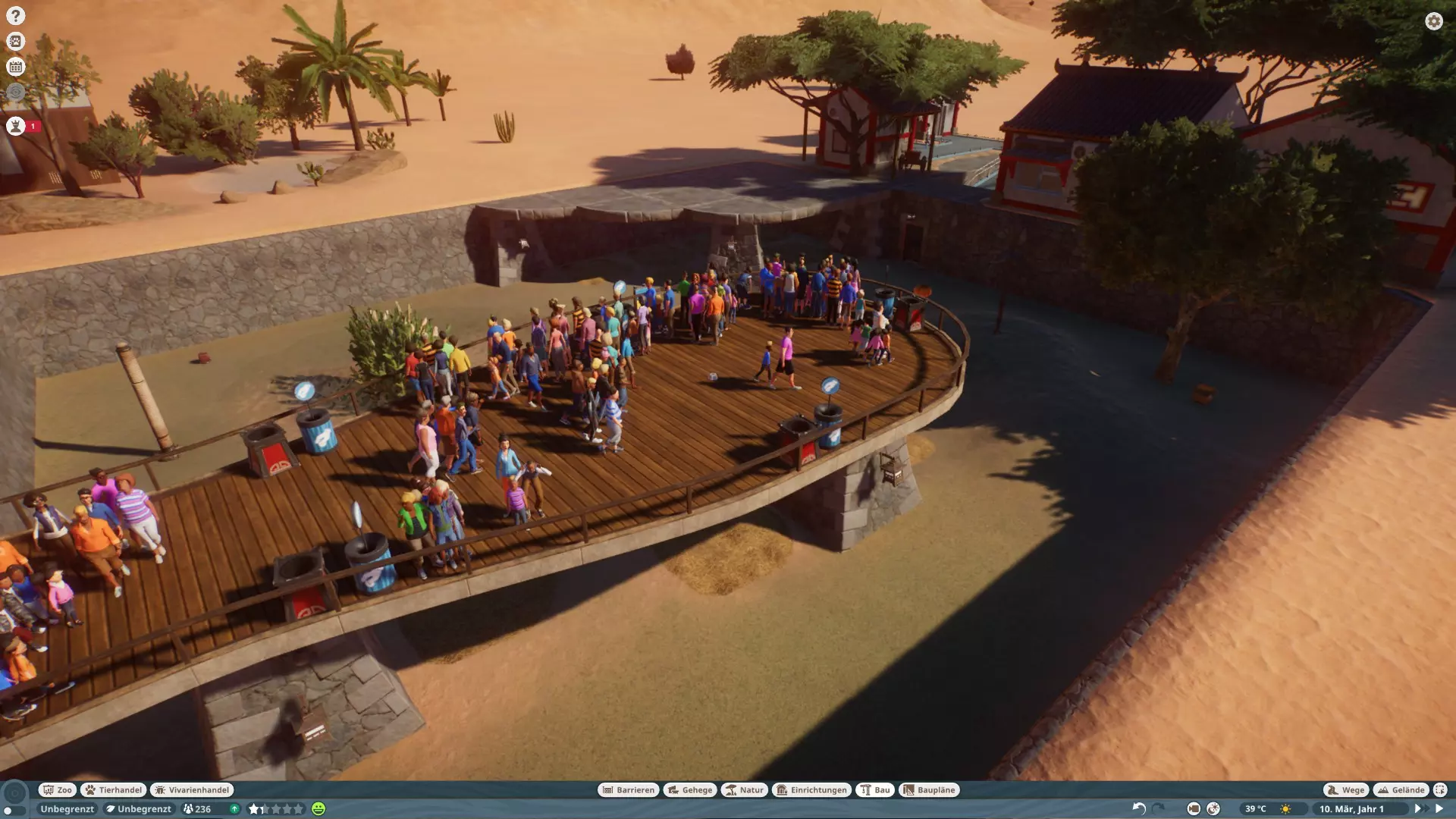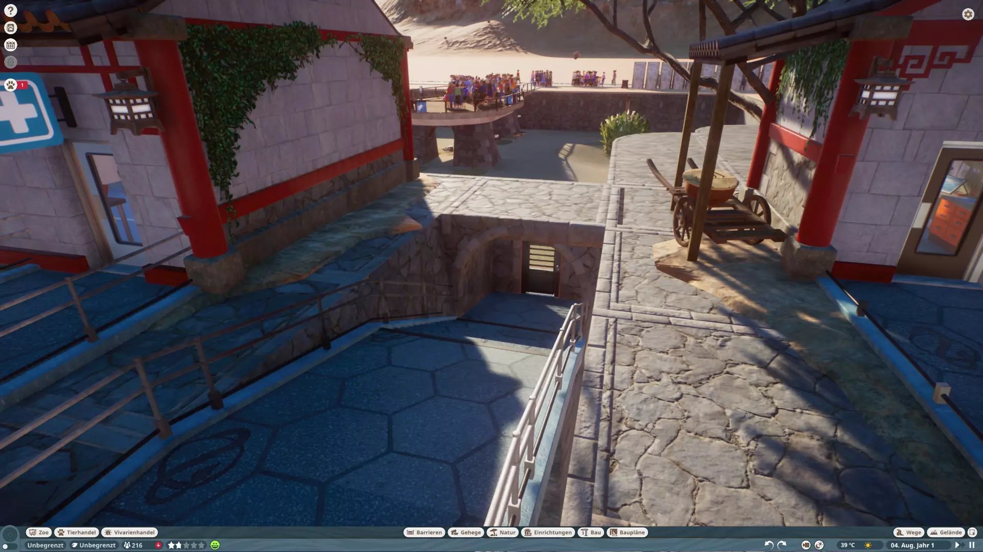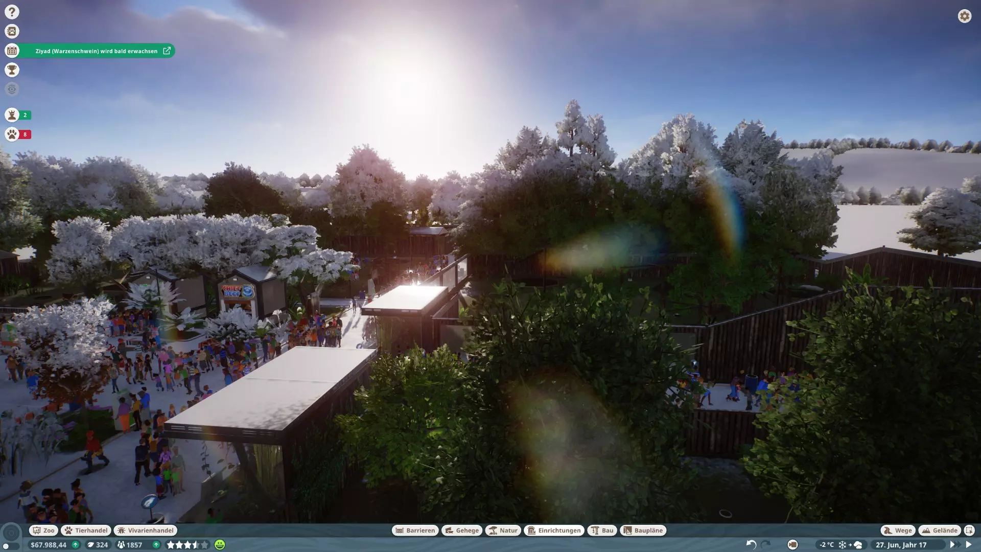 Hier sieht man nun auch mit grünen Linien die Objekte, die erklettert werden können. Und sollte ein Fluchtpunkt erkannt werden, werden an der Stelle rote Symbole angezeigt. Leider zeigt er diese aber scheinbar nur an, wenn man Objekte über die Barriere setzt und das Tier so direkt das Gehege verlassen kann oder Tunnel unter der Barriere hindurchgehen, selbst wenn das nur eine Höhle ist und er dort nicht raus käme. Würde das Tier in die Höhle gehen, würde es nicht entkommen, aber ihr würdet dennoch die Meldung erhalten und Gäste womöglich fliehen, da das Tier, die Barriere umgangen hat. Also einfach alles innerhalb der Gehegegrenzen machen. Was tun wenn ein Tier entkommen ist?Es gibt verschiedene Möglichkeiten, um ein entkommenes Tier wiederzufinden. Rufen eines Tierarztes ein Tierarzt wird zum Tier rennen, mit einem Blasrohr betäuben und es anschließend zu seinem Gehege zurück transportieren das Tier kann sich natürlich solange der Tierarzt noch nicht da ist, weiter austoben Notfall dies kostet 1.000, unabhängig vom Tier, und führt zum sofortigen Verpacken und Versenden an die Ausstellung Workshopinhalte Einige haben immer wieder Probleme mit Workshopinhalten. Ich selber habe noch keine benutzt, aber aus Erfahrung mit eigenen Bauplänen kann ich schonmal folgendes sagen: Alle Objekte in einem Bauplan müssen bereits erforscht sein, sofern man Ihn woanders nutzen möchte, sonst ist der Bauplan mit einem Schlosssymbol versehen und kann nicht verwendet werden. Sollte man ein Gehegeobjekt drin haben, muss man eventuell erst das entsprechende Tier erforschen, damit auch dieses freigeschaltet ist. Hatte bisher jedenfalls noch keine Probleme mit eigenen Bauplänen, abgesehen von der nicht vorhandenen Forschung. sonstige Tipps Sollten plötzlich irgendwelche Bugs auftreten, die vorher nicht da waren, einfach mal das Spiel beenden und neu starten...das löst so manche Probleme. Preise Eintrittspreise anpassen, wenn Gäste den Zoo betreten direkt mal anklicken und auf die Gedanken schauen Es gibt diverse Abstufungen, wenn der Preis GUT ist, ist es die letzte grüne Stufe bevor der Smiley zu Orange wird und der Preis nur FAIR ist. Also erhöht die Preise mindestens so lange, bis der Preis "nur" noch GUT ist und nicht mehr GÜNSTIG, sonst verschenkt ihr ne Menge Geld. Ich mach meist so, dass manche GUT sagen und manche Fair. Preise der Shops anpassen, da ist immer Luft nach oben... Wichtig ist nur, wenn ihr Preise ändert, beobachtet noch kurz ob noch wer diese Objekte benutzt oder ob es allen zu teuer ist. Preise für die Toilette anpassen, ich habe 1€ genommen, damit beschwert sich noch keiner und das Klo macht Gewinn. Auch mit Scheiße kann man Geld verdienen :) Preise auch für Geldautomaten, meine Gäste nutzen den Automaten bis 10€ noch, Problem ist nur, nicht jeder hat noch 10€. Da muss man dann abwegen, wie viel man nehmen möchte, umsonst würde ich es aber nicht machen. Wichtig ist nur, wenn ihr Preise ändert, beobachtet noch kurz ob noch wer diese Objekte benutzt oder ob es allen zu teuer ist. Bauen haltet beim bauen die Zeit an, es wird eine Weile dauern und ihr werdet nicht dauernd durch Meldungen unterbrochen verteilt die Shops im ganzen Zoo, macht KEINEN großen Platz wo alle Shops sind, sonst werden sich die Gäste nur da aufhalten und es gibt nur Gedrängel Macht lieber mehrere kleine Plätze mit paar Shops und nen kleinen Mitarbeiterraum in der Nähe mit PR-Programm, dadurch verteilen sich die Besucher im ganzen Zoo, die haben nämlich guten Hunger und Durst nehmt die maximale Gehwegbreite für Hauptwege, gerade am Zooeingang und Kreuzungen kann es schonmal eng werden, deswegen empfehle ich bei der ersten Kreuzung nichts zu bauen, was den Weg blockieren könnte, auch keine Objekte direkt am Rand, wo sich Warteschlangen bilden, wie Geldautomaten sorgt für kurze Wege und genug Mitarbeitergebäuden, nur die Pausenräume haben Betriebskosten, also seit bei den anderen Gebäude nicht zu sparsam Spendenboxen, Spendenboxen, Spendenboxen...nicht zu sparsam sein damit Zutaten und Vielfalt der Shops anpassen, je nach Wetter geht manches besser als anderes. Bei 40°C ist kaltes Wasser oder Eis besser als eventuell nen heißer Kaffee. Deswegen auch verschiedene Shops anbieten. sorgt für Bildung, das macht die Gäste länger zufrieden nutzt bei den Mitarbeiterräumen die Sonderfunktion wie PR-Programm für Verkäufer ich empfehle die Wartungsintervalle bei Strom und Wasser auf 3 oder 6 Monate zu setzen und bei Gehegen auf 6 Monate, damit die Mechaniker nicht erst kommen wenn es zu spät ist. Arztbesuche alle 6 Monate reicht auch vollkommen aus, sofern die Gehege alle sauber sind Sollte bei selbst erstellten Bauplänen ein Schloss-Symbol sein, habt ihr vermutlich noch nicht alle Objekte erforscht, die im Bauplan verwendet wurden. Personal nutzt Arbeitsbereiche, dadurch wird das Personal effizienter und läuft nicht von einem Ende des Zoos zum anderen, besonders bei Tierpflegern ist darauf achten Achtet aber auch darauf, das wirklich die richtigen Gebäude im Arbeitsbereich sind. Ein Mechaniker kann z.B. kein Geldautomat reparieren, wenn in seinem Arbeitsbereich kein Geldautomat ist. Sollte man noch Personal ohne Arbeitsbereich haben, würden diese dann diese Aufgabe übernehmen. Sollte das aber nicht der Fall sein, können im schlimmsten Fall Tiere sterben, weil man einfach vergessen hat, das Gehege im Arbeitsbereich anzugeben und kein Tierpfleger dahin geht. Forschung je weiter die Krankheiten erforscht sind, desto geringer die Wahrscheinlichkeit, dass ein Tier daran erkrankt, desto schneller kann die Krankheit geheilt werden und desto länger wird bei kritischen Krankheiten der Tod hinausgezögert achtet darauf, dass ihr mindestens einen Arzt/Techniker frei habt, der nicht forscht und sich um die anderen Aufgaben kümmern kann Weitere Tipps werden nach und nach ergänzt, sobald sie mir wieder einfallen :) Schlussworte So, ich hoffe ich konnte ein paar Leuten helfen. 