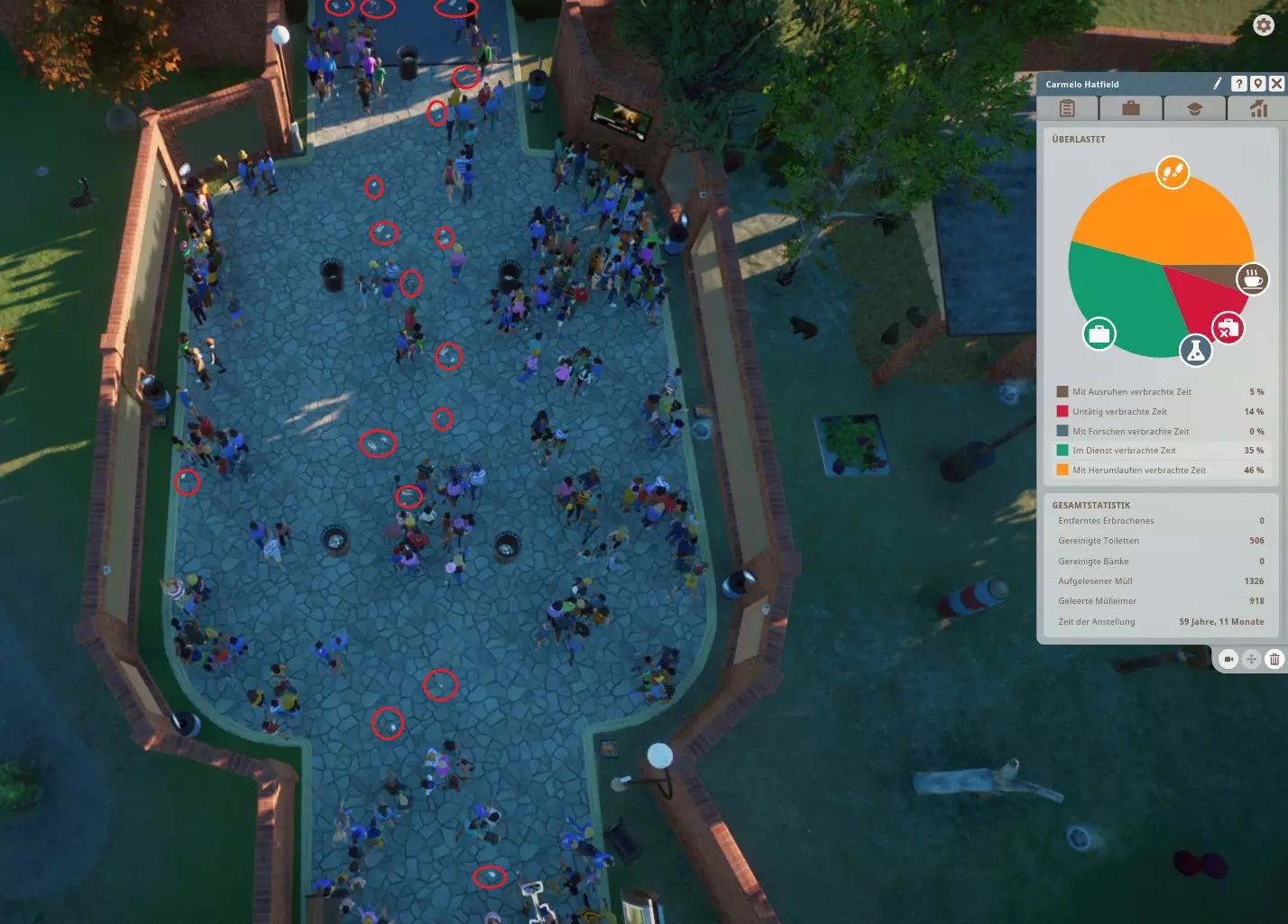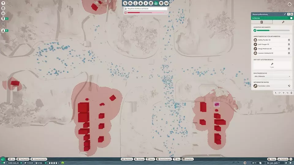 Personal kann auch dann eingestellt werden, wenn der Zoo über negative Geldmittel verfügt, sprich man Pleite ist beim Personal kann man auch selber festlegen, welche Aufgaben es machen soll und was nicht. So kann man Tierpflegern z.B. sagen, dass sie nur füttern sollen und ein anderer nur sauber machen soll. Natürlich nur in seinem Aufgabengebiet...ein Tierpfleger kann keine Reparaturen ausführen. sobald ein Shop platziert wird, wird automatisch ein Verkäufer eingestellt Bedürfnisse & Leistung der Mitarbeiter Mitarbeiter haben Bedürfnisse, die befriedigt werden müssen, damit sie effizient bleiben Sie haben auch ein "Zufriedenheitslevel", was in Verbindung mit den Bedürfnissen steht Um die Mitarbeiter bei Laune zu halten, müssen sie gut bezahlt, nicht erschöpft und ihre Einrichtungen ansehnlich sein. Sprich Szenerie nutzen! Sollten sie zu unglücklich sein, können Mitarbeiter von selbst kündigen (keine Sorge, da muss schon viel passieren) Das Gehalt sollte im grünen Bereich sein, kann aber bei den meisten Mitarbeitern noch gesenkt werden, da es bei der Einstellung der Mitarbeiter teilweise mittig im grünen Bereich liegt. Mein Personal ist immer an der Grenze zum roten und sind alle zufrieden damit :) Schulung der MitarbeiterDie Schulung der Mitarbeiter ist ein guter Weg, um ihre Zufriedenheit, Effizienz, Belastbarkeit und Arbeitsgeschwindigkeit zu verbessern. Alle Mitarbeiter beginnen mit einer Ein-Sterne-Bewertung und können auf der Registerkarte Zoo unter der Registerkarte Mitarbeiter oder durch Auswahl eines einzelnen Mitarbeiters verbessert werden. Mitarbeiter können nicht sofort nach der Einstellung geschult werden, sondern müssen erst die "Probezeit" überstehen. Man kann die Mitarbeiter auch nur Stück für Stück schulen und es braucht Zeit, bis die Schulung abgeschlossen ist.. Das heißt, Sie können z.B. Ihren Mechaniker nicht sofort auf fünf Sterne bringen, erst auf 2 Sterne, dann auf 3 usw.. Die Schulung wird erst wirksam, wenn der Mitarbeiter das nächste Mal einen Mitarbeiterraum betritt. Die Schulung eines Mitarbeiters ist mit Kosten verbunden. Es ist nicht für jeden Mitarbeiter gleich, aber es kann mehrere 100€ pro Level sein. Die Mitarbeiter erwarten mit jeder neuen Ausbildungsstufe eine Gehaltserhöhung, welche automatisch eingestellt wird. weitere nützliche Hinweise zu den einzelnen Mitarbeitern:Zoopfleger Die Hauptaufgabe ist wohl die Müllbeseitigung. Um den Müll niedrig zu halten, ist es notwendig eine Menge Mülleimer zu platzieren. Das Problem bei den Zoopflegern besteht darin, dass Sie keinen Pfad zum Arbeitsbereich hinzufügen können, sodass sie nur für die Reinigung von Toilette zugewiesen werden können, nicht jedoch für einen Pfadabschnitt oder einen Mülleimer. Achtet also auf den Müll. Eure Gäste werden es euch danken. (diese Drecksäcke ;D) Bei mir wird von den Zoopflegern gerne mal der Eingangsbereich vom Zoo ignoriert. Das kann man mit einem kleinen Kniff umgehen. Da nur Toiletten von ihnen als Gebäude gereinigt werden, kann man am Zooeingang direkt mal eine Toilette platzieren und woanders im Zoo ebenfalls. Dann einem Zoopfleger beide Toiletten im Arbeitsbereich zuweisen und er geht früher oder später dort hin und reinigt auf dem Weg dahin alles nötige. Natürlich muss man den Zoopflegern auch einen Mitarbeiterraum zuweisen und nicht zu vergessen, das Handelszentrum. Sonst holen diese Zoopfleger keine Tiere aus dem Handelszentrum. Tierpfleger Nachdem ein Tierpfleger seine aktuelle Aufgabe erledigt hat, sucht er nach dem Gehege, das am wenigsten besucht wurde, sofern er mehr als ein Gehege im Arbeitsbereich hat (auch wenn es sich auf der anderen Seite des Zoos befindet). Das ist sehr ineffizient und könnte den Tieren zum Verhängnis werden. Deswegen sind gerade hier effiziente Arbeitsbereiche mit kurzen Wegen sehr wichtig! weitere Infos im Abschnitt Fütterung im Detail Mechaniker Sie reparieren nicht nur Sachen. Sie sind die einzige Möglichkeit, neue Lebensmittel-, Getränke- und Souvenirläden, Stromerzeuger, Schutz- und Kletterbaupläne sowie weitere Themenlandschaften/objekte zu erwerben. Ich empfehle die Barrieren zuerst zu erforschen, um das Einwegglas freizuschalten und somit bei den Tieren den Stress durch Zuschauer zu reduzieren. BUG: Das reparieren von Objekten, die durch Vandalismus zerstört wurden scheint noch nicht möglich zu sein. meine Erfahrungswerte: stellt bei den Gehegen ein, dass die Mechaniker alle 6 Monate kommen, und nicht einmal im Jahr, damit die Gehege nicht zu sehr beschädigt werden es sollte min. ein Mechaniker vorhanden sein, der nicht forscht, damit ihr schnell auf Ausfälle reagieren könnt und wichtige Gebäude wie Strom/Wasser weiterhin gewartet werden kurze Arbeitswege sind auch hier hilfreich vermeidet möglichst öffentliche Wege, im Gedrängel dauert es länger trainiert sind sie schneller sowohl in Forschung als auch bei Reparaturen, wobei man nach der Forschung eigentlich nicht mehr viele Mechaniker braucht Gäste mögen keine kaputten Gegenstände (Rückerstattung), deswegen sollte man eventuell einen Mechaniker nur für Vandalismusreparaturen einsetzen, sofern der BUG mal behoben wird...kann sich nur noch um Jahre handeln Sicherheitspersonal Sicherheitspersonal läuft buchstäblich nur im Zoo herum und starrt Ihre Gäste an. Ich habe nahezu überall Sicherheitskameras, aber es wird weiter randaliert und Mülleimer umgeworfen. Sie finden wohl abundzu mal Taschendiebe usw, aber die Ausbeute ist Mager bei mir im Vergleich zum Vandalismus. Ich muss das ganze noch genauer beobachten. Verkäufer Verkäufer verlassen und schließen ihren Shops, wenn sie müde sind und gehen zum nächsten Mitarbeiterraum. Um zu vermeiden, dass zu viele Shops gleichzeitig geschlossen sind, macht es durchaus Sinn, ein paar Verkäufer mehr einzustellen, als Shops da sind. Damit diese dann einspringen können. Tierärzte Ihre Hauptaufgabe ist die Erforschung! Tierarztforschung ist der einzige Weg, um das 