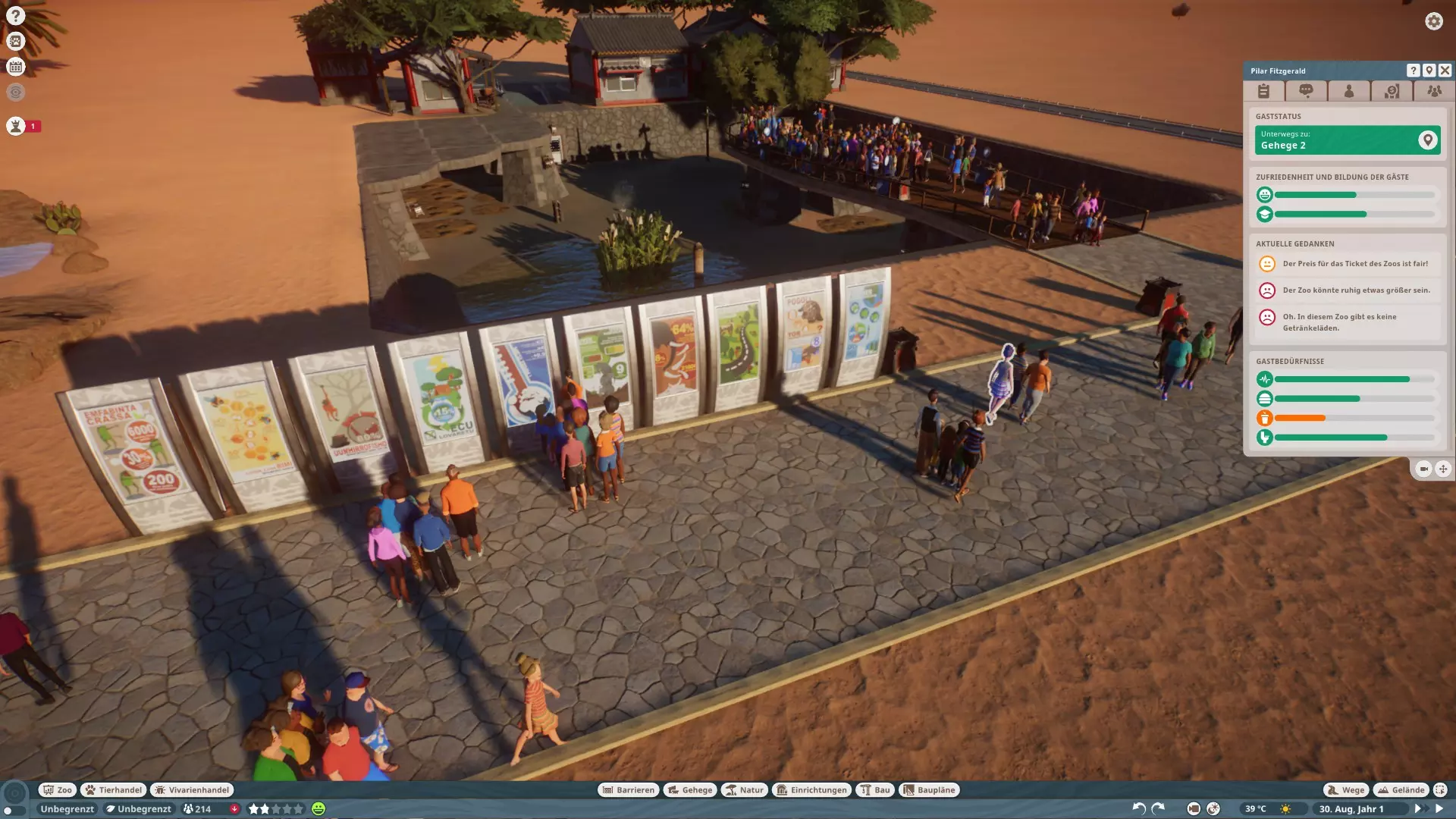 这位女士已经学到了很多知识,她刚到动物园,目前只看了几块信息牌。当然,不是所有游客都会驻足观看,可能也没人会全部读完,但如果在人行道的另一边也放置信息牌,机会还会增加。当然,也可以大量放置,但不必过度。 一个小副作用是,这些信息牌会被算作景观,有些游客会喜欢这种景象。 当然也可以把道路弄窄,但之后如果有人进出就会拥堵,还会有很多人站在那里看牌子,这样不太好。 大多数人会怎么想呢?您其实可以查看这些信息 :) 点击动物园概览(热图旁边的左下角)顶部的【游客】选项,就能看到以下界面: