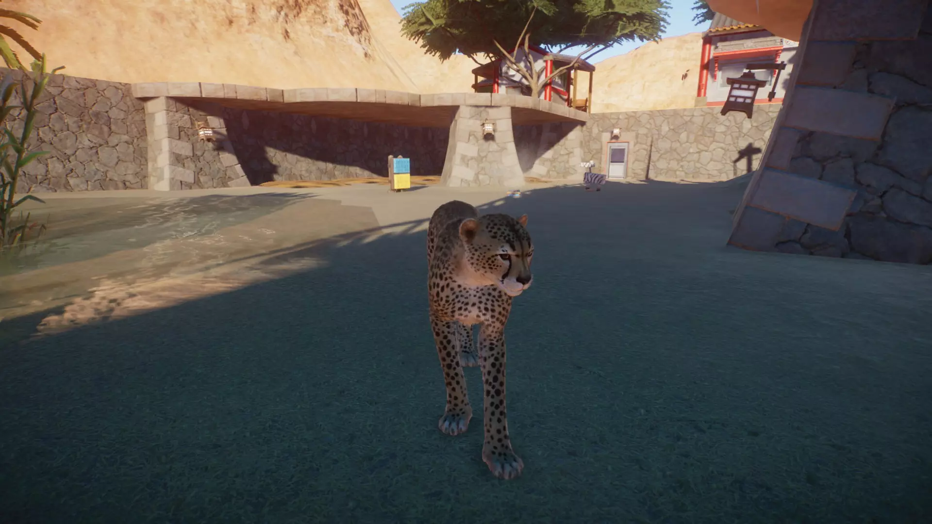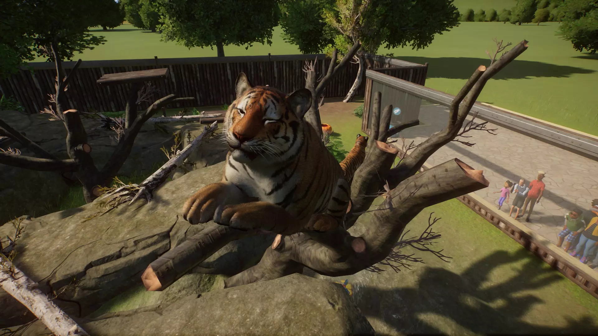 水域边缘应设计得较为平缓,否则动物可能无法爬出并导致饿死等情况。 当动物处于水源内或离水源过近,或者水源处会形成通路时,无法进行注水操作。 请尽快使用一次性玻璃,以避免不必要地增加动物的压力。为此,机械师需要将围栏研究到最高等级,因为一次性玻璃要到最后阶段才能解锁。 一旦研究完成并将围栏窗户替换为一次性玻璃后,只要空间允许,你可以放心地将所有动物游乐设施直接放置在窗户前方,让游客能以最佳视角观赏动物。动物的休息区也应尽量靠近窗户,因为它们经常在那里活动。 原则上,所有设施都应尽可能靠近游客放置,但关于喂食区,我更建议将其设置在入口大门附近,这样可以缩短动物饲养员的行走距离。 积雪只有在温度低于0°C时才会留存,所以如果想在夏季布置积雪,需要先用空调将环境温度降低,否则你和动物们要等到天气变冷才能看到积雪。 用场景物品建造围栏?不可破坏的墙壁?没问题!你也可以使用场景物品来建造围栏,这种围栏无需维护!不需要机械师进行维修。这简直就像作弊一样……你只需要使用建筑物体建造栅栏,或者使用地形工具创建自然边界,以防止动物逃脱。然后用隐形屏障设定围栏边界【重要:隐形边界可以被动物和人类穿过,因此必须将边界设置在动物无法到达的地方,例如场景后方或像我上方那样设置在墙后,否则会触发逃脱警报】,这样就完成了。 场景不会损坏,动物无法穿过场景,机械师也可以退休了(前提是没有bug)。当然,你必须注意围栏的高度。在我的示例中,我只是挖了一个坑,用墙壁物件进行了铺设,然后还在上面为休息区加盖了一些屋顶板,并对围栏入口进行了美观的装饰,同时也处理好了通道。接着再搭建一个供访客使用的漂亮平台之类的,就完成了。当然,对于容易紧张的动物,需要稍微注意一下,因为我觉得似乎没有单向玻璃作为场景物件。