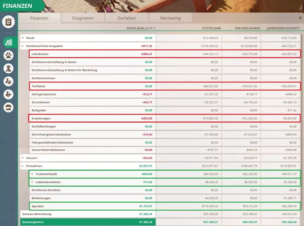 钱都去哪儿了?从我的截图中可以看出,捐款和门票销售是最大的收入来源。动物园里的游客越多、停留时间越长,商店就越赚钱。时间长了,每个人都会感到饥饿或口渴。 最大的支出也很容易看出来,通常动物饲料是第一位的……饲料质量的不同很容易使成本翻倍。 但除此之外,不同动物园的情况可能会有很大差异。这取决于你有多少员工以及他们的培训程度,有些动物园在这方面的花费可能会相当高。