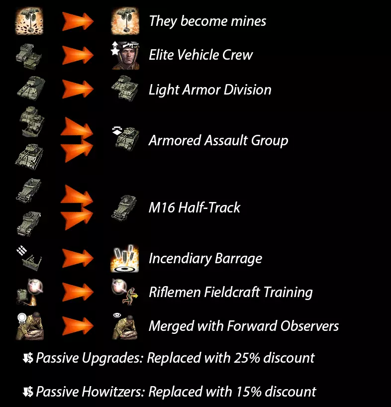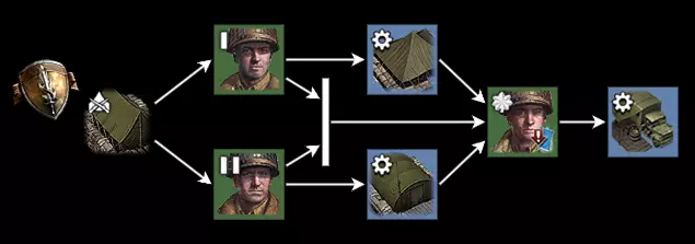 HQ - Barracks AbilitiesTransfer Orders | Free Orders a selected squad or vehicle to withdraw from the map and return to the rear. UpgradesLend-Lease Act | 25 fuel and 80 munitions Your allied factions share weapons and various units. You can now buy weapons at the weapon racks from your allies and call-in reinforcements to the battlefield. (US forces, British forces and Soviets only) Weapon Rack Unlock | 150 manpower and 15 fuel Unlocks the M9 Bazooka and the M1918A2 Browning Automatic Rifle (BAR) at the Weapon Rack. Increases infantry firepower. Can be selected by any infantry unit. M1919A6 Browning LMG Rack | 80 manpower and 5 fuel Provides access to the M1919A6 Browning LMG at the base. Pick up weapons from the Weapon Rack in the base. Grenade Package | 125 manpower and 15 fuel Unlock Mk. 2 'Pineapple' fragmentation grenades, Incendiary Grenades and M23 Smoke Screen Grenades. Improves the effectiveness of Riflemen against infantry. Riflemen Fieldcraft Training | 80 manpower and 10 fuel Allows Riflemen squads to fire flares to reveal the target area. Riflemen can use "Fire Up!" which increases their movement speed for a period of time. Riflemen Field Defenses | 80 manpower and 50 munitions Riflemen are trained to build Sandbags and Mines. Forward Observers allows Riflemen to see further while in cover or garrisoned. Infantry RiflemenEquipped with Garands, effective against infantry at medium range. Can be upgraded with Carbines. Squadsize: 5 and Population: 7 Cost: 280 manpower Reinforce Cost: 28 manpower Build time: 27 seconds Hit points: 80 Armor: 1 Received accuracy: 0.95 Sight range: 35 Capture rate: 1 De-capture rate: 1 Vet 1, 580xp 'Mk 2 Frag Grenade' munitions cost: -5 All grenades recharge time: -25% Vet 2, 1160xp Cooldown: -20% Received accuracy: -23% Vet 3, 2320xp Accuracy: +30% All grenades cast range: +25% Abilities (Passive) Forward Observers Riflemen squads now see further while in cover or garrisoned. Sight range: +7 Anti Tank Rifle Grenade | 25 munitions Rifleman will launch an M9A1 Anti-Tank grenade at a vehicle using an M7 Launcher. Damage: 100 Penetration: 100 Trigger engine damage critical Fire Up! | 10 munitions | 8s Squad will move at maximum speed for a period of time, but will suffer from an exhaustion phase for a few seconds. Max speed +50% Flare | 35 munitions A slow-falling parachute flare reveals the target area. Mk 2 Frag Grenade | 30 munitions Standard issue Mk 2 fragmentation grenade often referred to as the "pineapple" grenade can kill or injure infantry in a 4m radius. AOE radius: 4m Damage: 80 Penetration: 25 Upgrades Attach Medic | 40 manpower Unlocks '(Passive) Field Medkit' Received accuracy: -10% Squad size: +1 Attach Sergeant | 40 manpower Reload time: -10% Squad size: +1 3x M1 Carbines | 45 munitions Infantry becomes more effective at close range, less effective at long range. Defenses Fighting Position, Sandbags, M5 Mines Rear Echelon TroopsEquipped with Carbines, but has limited combat capability. Can be upgraded with a Minesweeper and a Flamethrower or Rifle Grenade Launcher. Squadsize: 4 and Population: 5 Cost: 200 manpower Reinforce Cost: 25 manpower Build time: 22 seconds Hit points: 80 Armor: 1 Received accuracy: 1 Sight range: 35 Capture rate: 1 De-capture rate: 1 Repair speed: 1.6 Vet 1, 380xp Accuracy: +20% Vet 2, 760xp Repair speed: +0.5 Cooldown: -20% Received accuracy: -23% Vet 3, 1520xp Squad size: +1 Abilities M23 Smoke Screen Grenade | 15 munitions Fires a rifle grenade smoke round that creates a line of smoke in the targeted direction. Any vehicles hit by the grenade will be temporarily blinded and slowed. Repair | Free Demonstrating pure ingenuity, troops can repair any damaged structure, vehicle, or bridge. Volley Fire | 20 munitions | 15s Rear Echelon Troops lay down a volume of fire with their rapid-firing carbines. While active, the targeted squad slowly becomes suppressed. Accuracy: -50% Max speed: -50% Received accuracy: +15% Weapon suppression: +0.01 Wire Cutters | Free | 5s Wire Cutters are used to cut through barbed wire fences or barbed wire fields. Upgrades Attach Medic | 40 manpower Unlocks '(Passive) Field Medkit' Received accuracy: -10% Squad size: +1 Attach Sergeant | 40 manpower Reload time: -10% Squad size: +1 Hazard Removal Package | 30 munitions Unlocks 'Wire Cutters' Mine detection radius: +25 M2 Flamethrower | 60 munitions Improves anti-infantry capability with area-effect weapon. Rifle Grenade Launcher | 60 munitions Improves anti-infantry capability with ranged area-effect weapon. Structures Airborne Support Center | 180 manpower Radar Post | 210 manpower and 50 fuel Munitions Cache | 250 manpower Fuel Cache | 250 manpower Defenses Fighting Position | 125 manpower Machine Gun Emplacement | 150 manpower and 60 munitions Wooden Bunker | 70 manpower Watchtower | 150 manpower Slit Trench | Free Field Hospital | 200 manpower Anti-Tank Position | 270 manpower and 20 fuel M4A3 Sherman Crocodile | 380 manpower and 40 fuel Other: Sandbags, Razor Wire, Tank Trap, M7 Light Anti-Vehicle Mines, M5 Mines MedicsEquipped with Pistols. Can be upgraded with Combat Medic Equipment. Squadsize: 3 and Population: 4 Cost: 180 manpower Reinforce Cost: 30 manpower Build time: 24 seconds Hit points: 80 Armor: 1 Received accuracy: 1 Sight range: 35 Capture rate: 1 De-capture rate: 1 Vet 1, 340xp 'Smoke Grenade' recharge time: -25% 'Sprint' recharge time: -25% Vet 2, 680xp Received accuracy: -20% Vet 3, 1360xp Distribute Medical Supplies heal rate: +67% Abilities (Toggle) Distribute Medical Supplies The Medic squad will heal themselves and nearby friendly troops, if they are out of combat. Smoke Grenade | 15 munitions Throw a small smoke grenade at a target location. Sprint | 10 munitions | 8s The unit will move very quickly for a short period of time. Weapons cannot be fired while moving. Max speed +50% Upgrades Combat Medic Equipment | 30 munitions Unlocks 'Smoke Grenade' M2 60mm Mortar TeamEffective against static infantry and str
