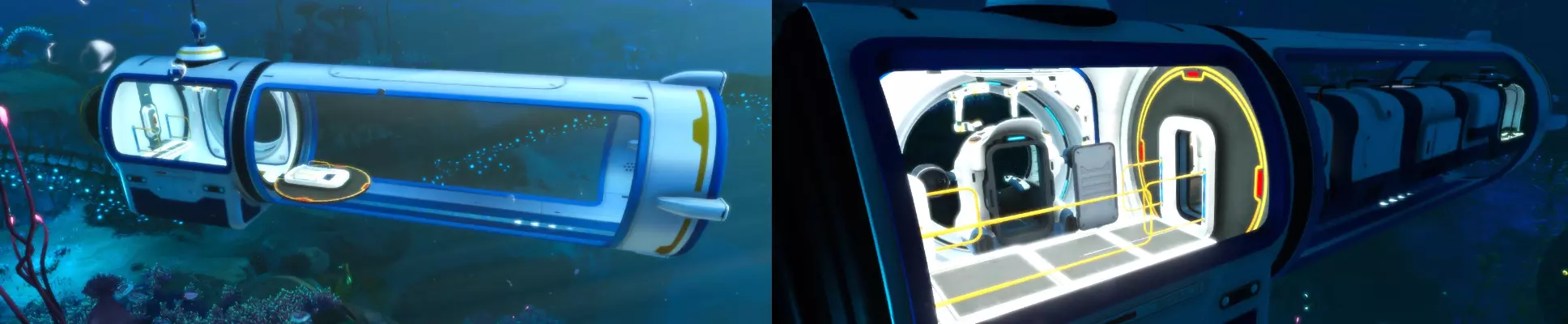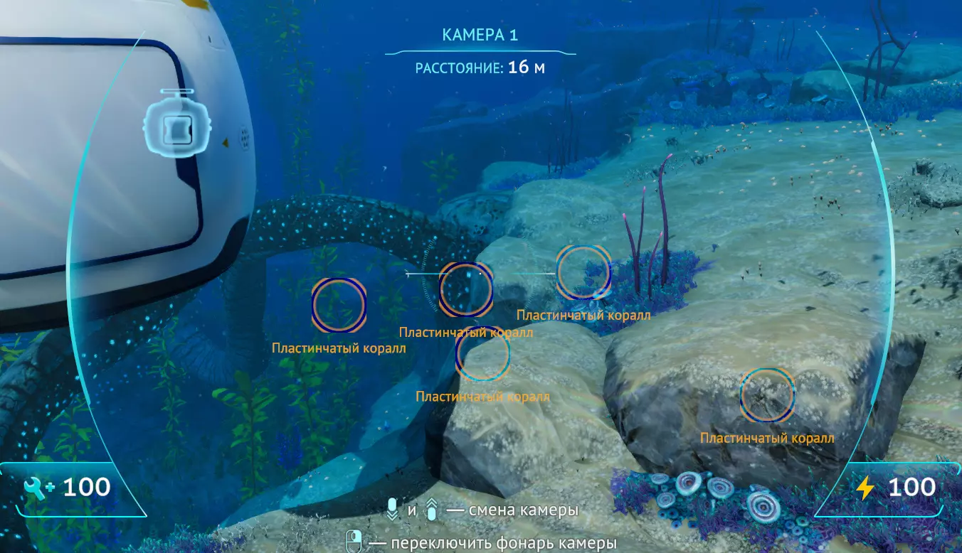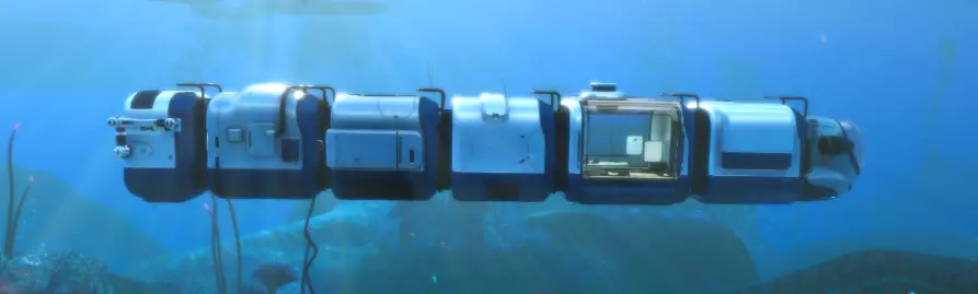 潜水器有4个模块升级槽位和2个可拆卸能量电池。 操作极其简单。 W、A、S、D键控制移动方向。潜水器会朝着玩家面向的方向移动,也就是说,操作方式类似滑翔翼。 右键开启灯光。照明效果良好,但会增加能量消耗。 在未安装深度模块的情况下,最大下潜深度为150米。“海行者”模块 火车车厢 概述 首先说明一些要点。 “海行者”模块并非独立部件,其运行完全依赖海行者自身的能源。 所有模块都有各自的耐久值,因此维修时需要单独修理,无需从整列火车上拆下来。 模块不受下潜深度影响,但“驾驶舱”则不同。独立模块会有标记。它们也可以吸引捕食者,不过你可能不会把它们当作诱饵来使用,因为它们的制作成本太高,不能随意浪费。模块的顺序和数量可以任意调整(连接模块除外)。模块越多,船只航行速度越慢。