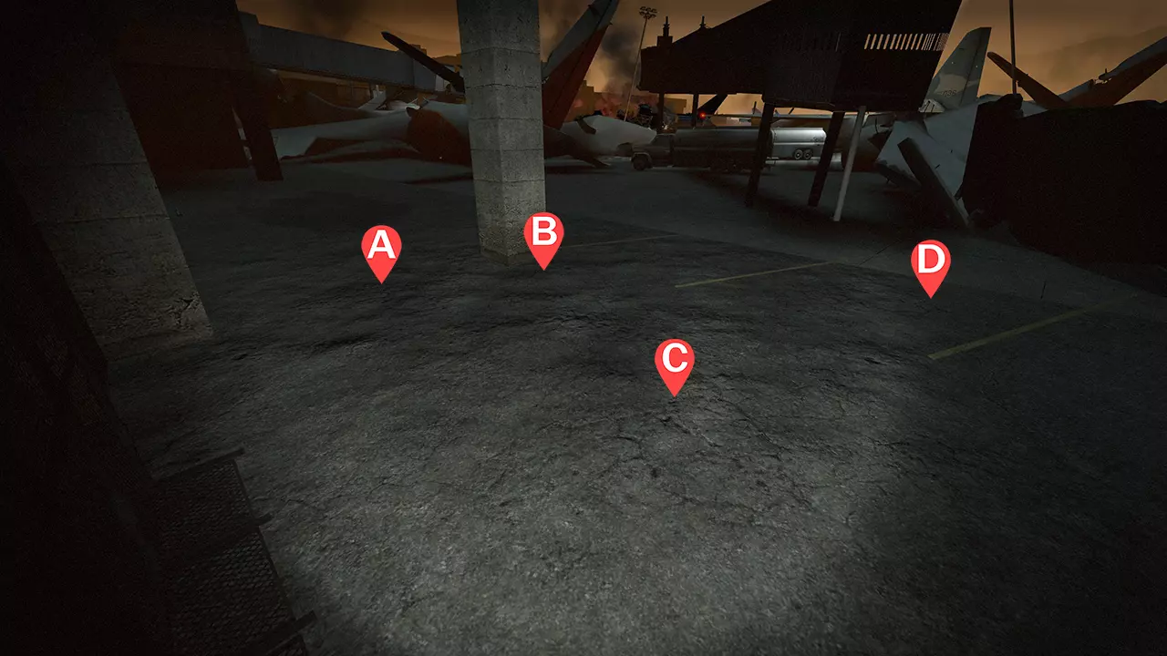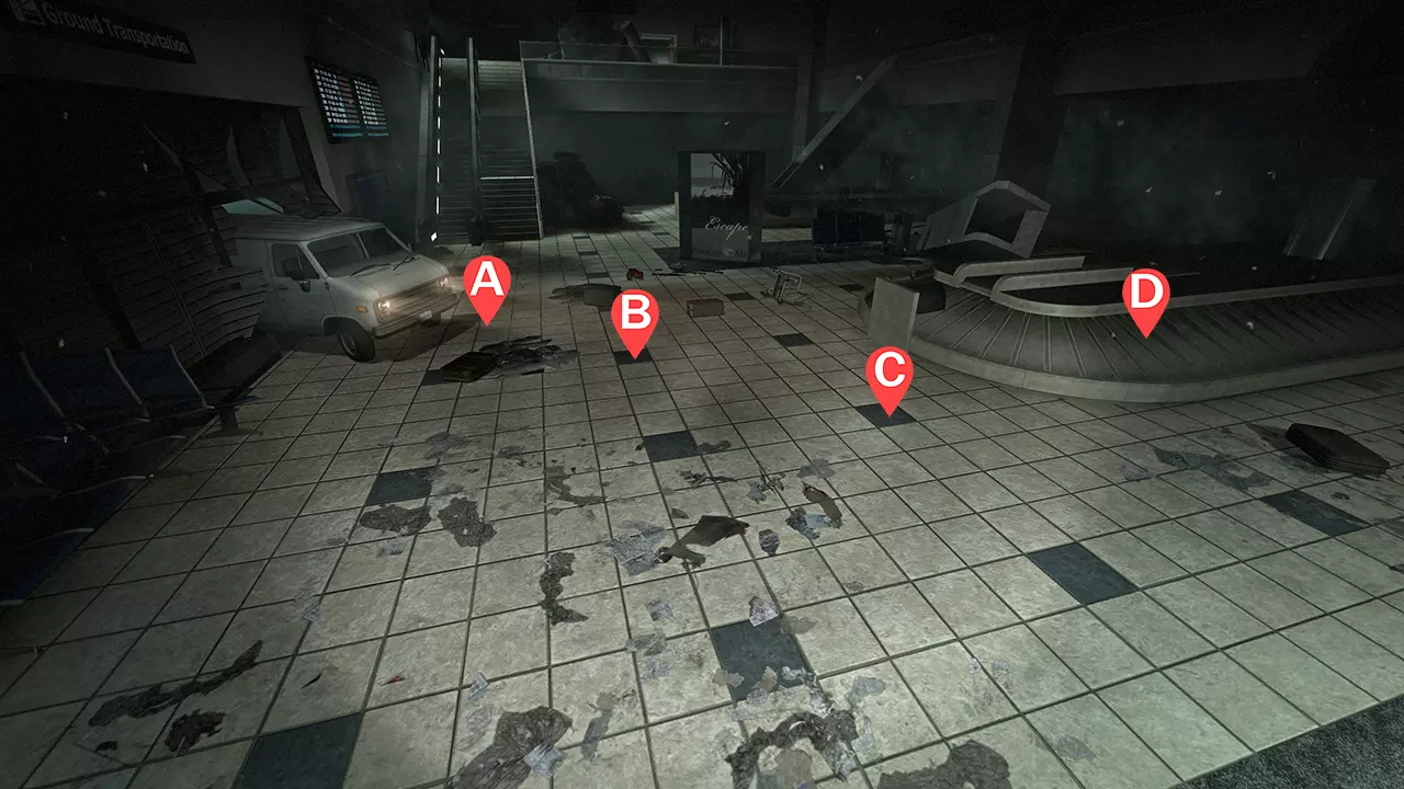 1名幸存者观察左侧(A) 1名幸存者位于中左位置的柱子旁(B) 1名幸存者在后方(C) 1名幸存者在右侧(D) 注意事项: 幸存者A应引诱坦克将岩石投向左侧墙壁,也可利用柱子躲避吸烟者。 幸存者B会经常成为吸烟者和猎人的目标,由于火坑的存在,猎人会持续被点燃。尽可能协助射击左侧的坦克,并注意来自油罐车区域投掷的坦克岩石。 幸存者C站在更靠后的位置,充当常规支援。留意身后的围栏,感染者可能在那里刷新。 幸存者D站在稍靠前的位置,用于聚集普通感染者,吸引坦克仇恨,并利用机场航站楼的支撑梁切断吸烟者的舌头。遗憾的是,【碰撞箱】与模型并不匹配,你需要通过练习来准确了解它们的位置。感染者有时也会从上方的通道出现。大多数情况下,幸存者D会专注于掩护前方,而忽略左侧的坦克。 由于弹药补给路线明显更长,建议比在其他地图更早去补充弹药。 优先使用手枪;但如果需要控制尸潮,也不必犹豫使用霰弹枪,因为弹药不如生命值重要。 弹药补给路线
