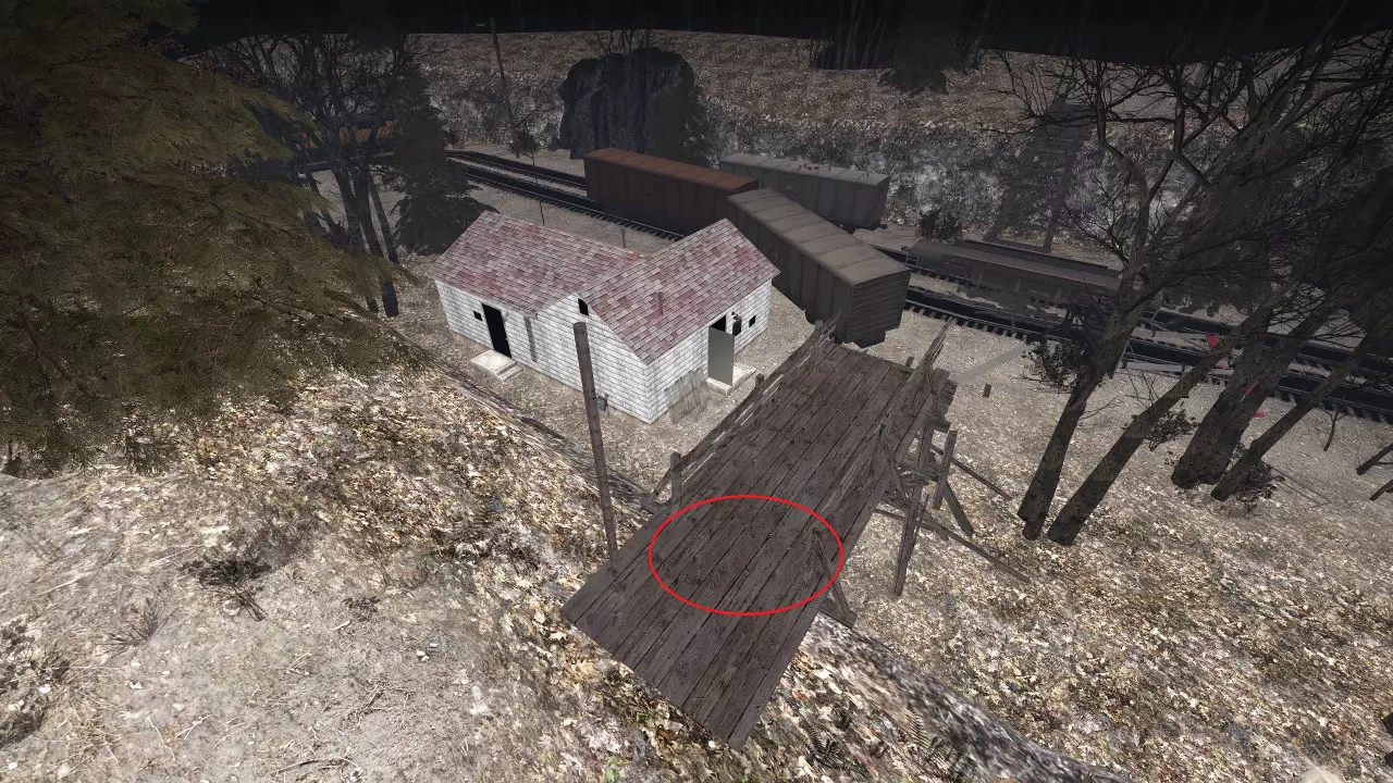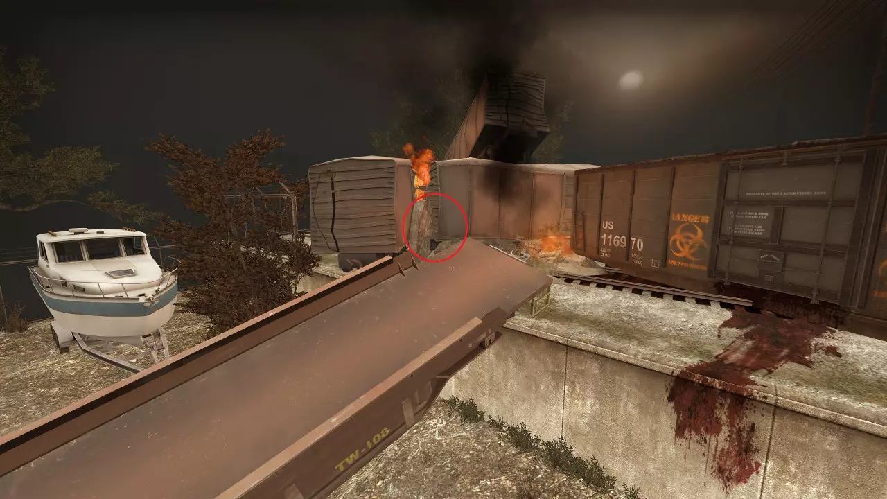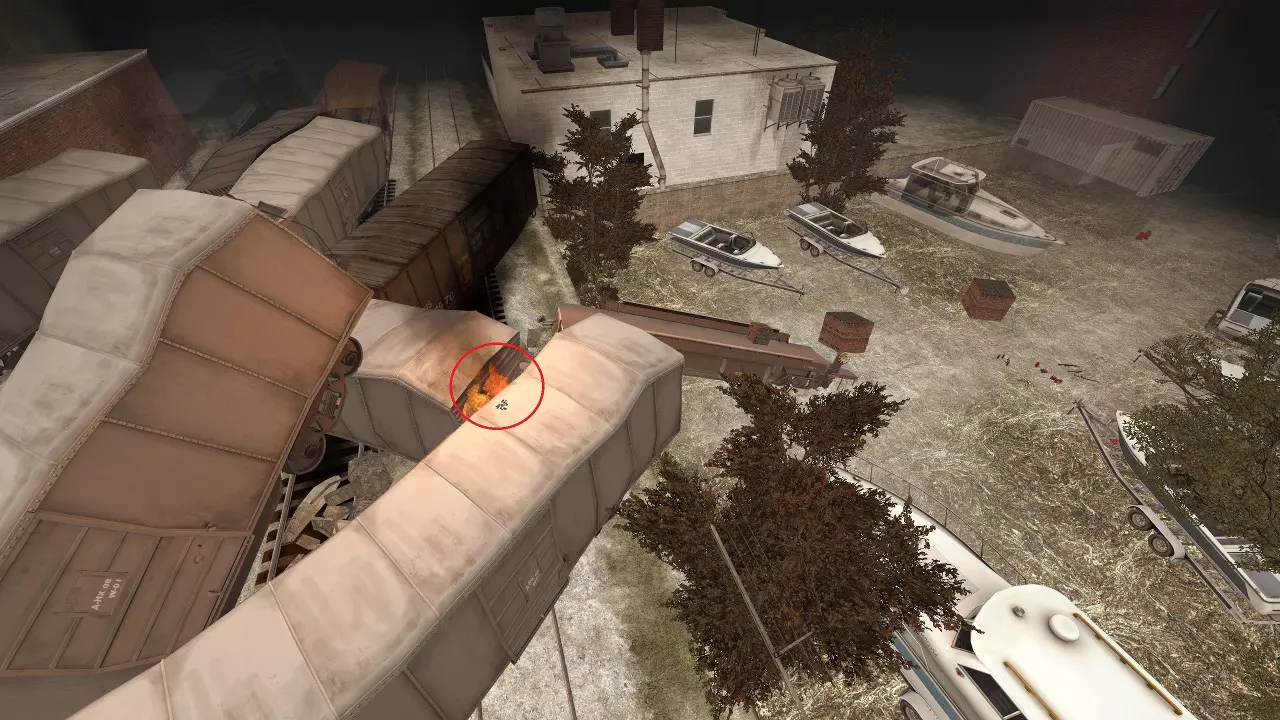 1名幸存者在后方作为猎人诱饵(A) 1名幸存者在后方角落支援幸存者A以及任何可能被突袭的前方幸存者(B) 1名幸存者在前方左侧(C) 1名幸存者在前方右侧,位置稍向前一些(D) 注意:由于后方无法清除灌木丛,幸存者A应更多依靠声音和记忆而非视觉来应对威胁。注意从破栅栏缺口或破火车顶部跃下的猎人,进行紧急停顿时务必向上瞄准。猎人还倾向于在船附近或斜坡下方潜伏。吸烟者可以主动躲避,或交由幸存者B处理。 幸存者B有两项主要任务需要处理。首先,要持续解救被困在后方的吸烟者;如果不这样做,会出现更多坦克。其次,在需要时支援前方,包括对付坦克。 幸存者C负责消灭前方的所有敌人,通过简单后退或从之前的蹲伏状态站起来以避开吸烟者的舌头,使其脱离视野。坦克的石头有着不可思议的能力,能绕过树木和船的边缘,所以务必谨慎行事!当坦克从前方出现时,确保比幸存者D稍早一点后退。如果它们爬上船,在幸存者D引开坦克时提供掩护。 幸存者D应将坦克引到船的后方。偶尔坦克可能会爬上来,一旦发生这种情况,要警告幸存者A坦克可能会掉落到他头上。注意围栏本身,有一处可能会让你卡住。 如果将汽油罐存放在前面的树附近,射击时它们可能会掉到地图外面。 弹药补给路线应沿着围栏走,然后穿过船只之间到达霰弹枪刷新点。 远距离射击普通感染者。掩护很重要,不要视野狭隘。 如果选项中的【效果细节】设置为【低】,可以移除前面的树篱。但这样坦克投掷的石头在远处将不可见,且不会影响后面的树篱。 小型船只可以在回合开始前用7次近战攻击摧毁。最安全的方法是站在船头的金属部分。 卡住点