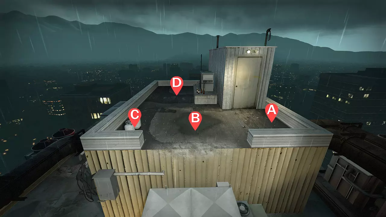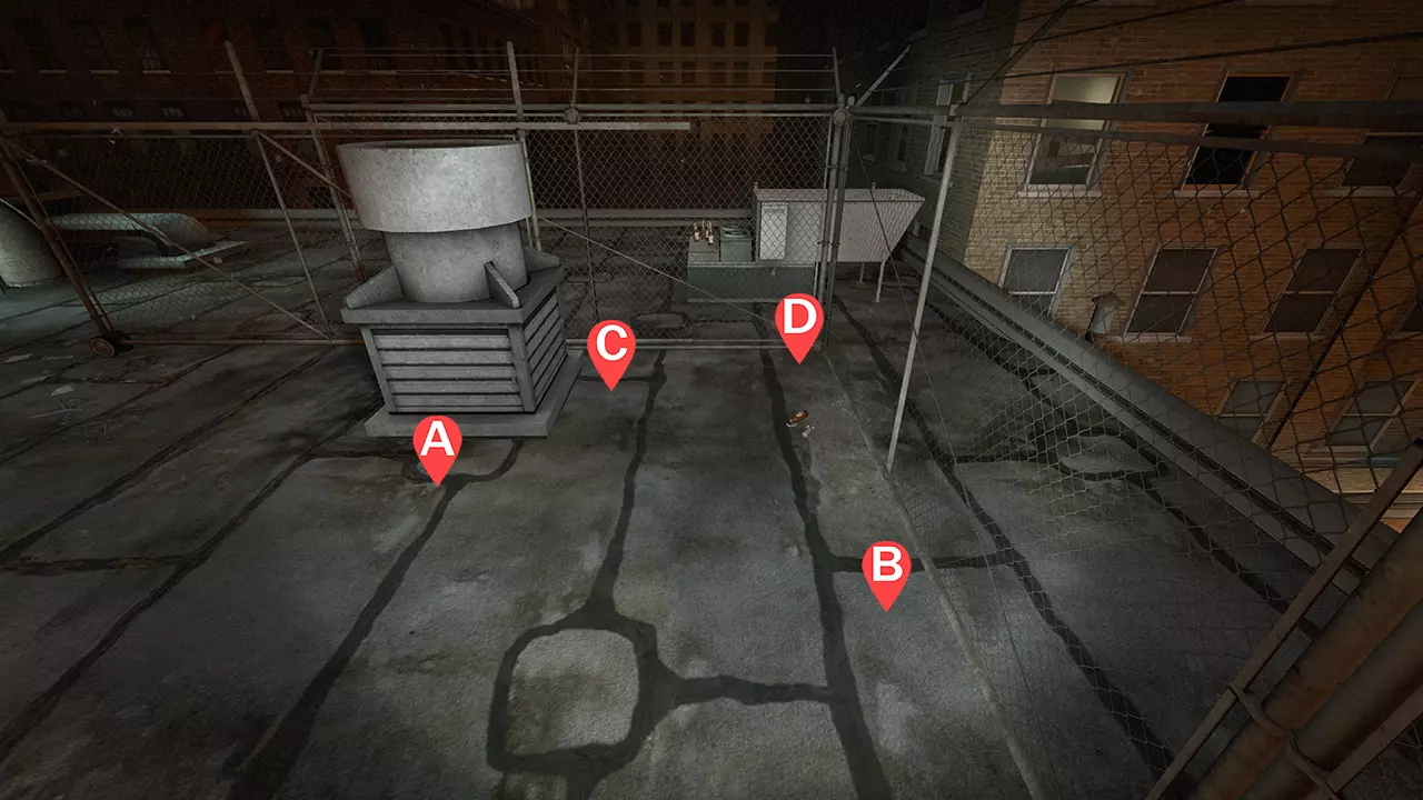 1名幸存者负责前方及左侧区域(A) 1名幸存者负责前方区域(B) 1名幸存者负责前方及右侧区域(C) 1名幸存者负责后方及最右侧区域(D) 注意事项: 幸存者A负责坚守位置的左侧,应对从管道攀爬上来的普通感染者,以及在左侧梯子上攀爬的特殊感染者,防止他们过于靠近。 站在边缘可能会提高对来袭坦克和特殊感染者的能见度,但由于地面可能有吸烟者的拉拽,此举存在风险。要警惕从后方和左侧边缘攀爬上来的坦克。如果坦克开始攀爬,可走到管道上引诱坦克离开。 幸存者B和C共同负责前方开阔区域,需要持续阻止/击退猎人并躲避石块。幸存者C需要与前方边缘保持距离,因为猎人可能会穿过边缘进行攻击。如果幸存者A在忙,幸存者C可以清理左侧梯子处的特殊感染者。 幸存者D专注于右侧和后方边缘,以及最右侧区域(所有普通感染者出现的下方区域)。其职责是阻止普通感染者靠近其他幸存者,并及时通报后方/右侧出现的坦克。如果遇到双坦克情况,或其他幸存者被扑,在可能的情况下立即提供帮助。 如果贴着边缘站立,坦克的拳击更可能造成伤害而非将你击下屋顶。 如果你即将被坦克击中,不要跳跃!否则你会死亡。 卡怪点:一名幸存者在补充弹药时,使用猎枪清理卡怪点的特殊感染者。其他幸存者保持在附近并掩护正在使用猎枪的幸存者非常重要。当特殊感染者被清除后,返回坚守地点。