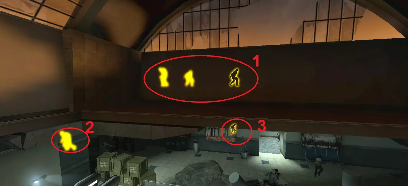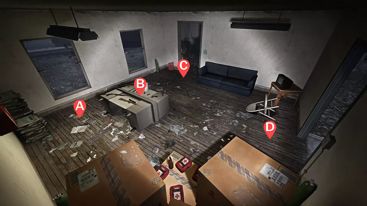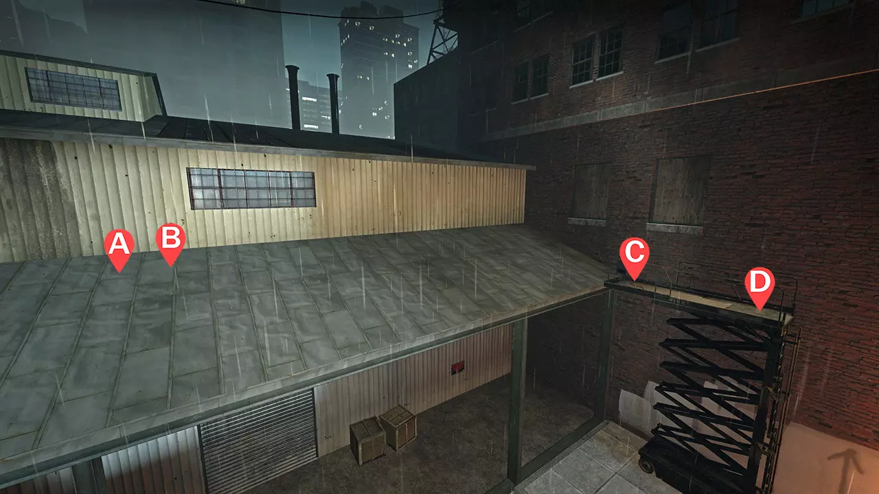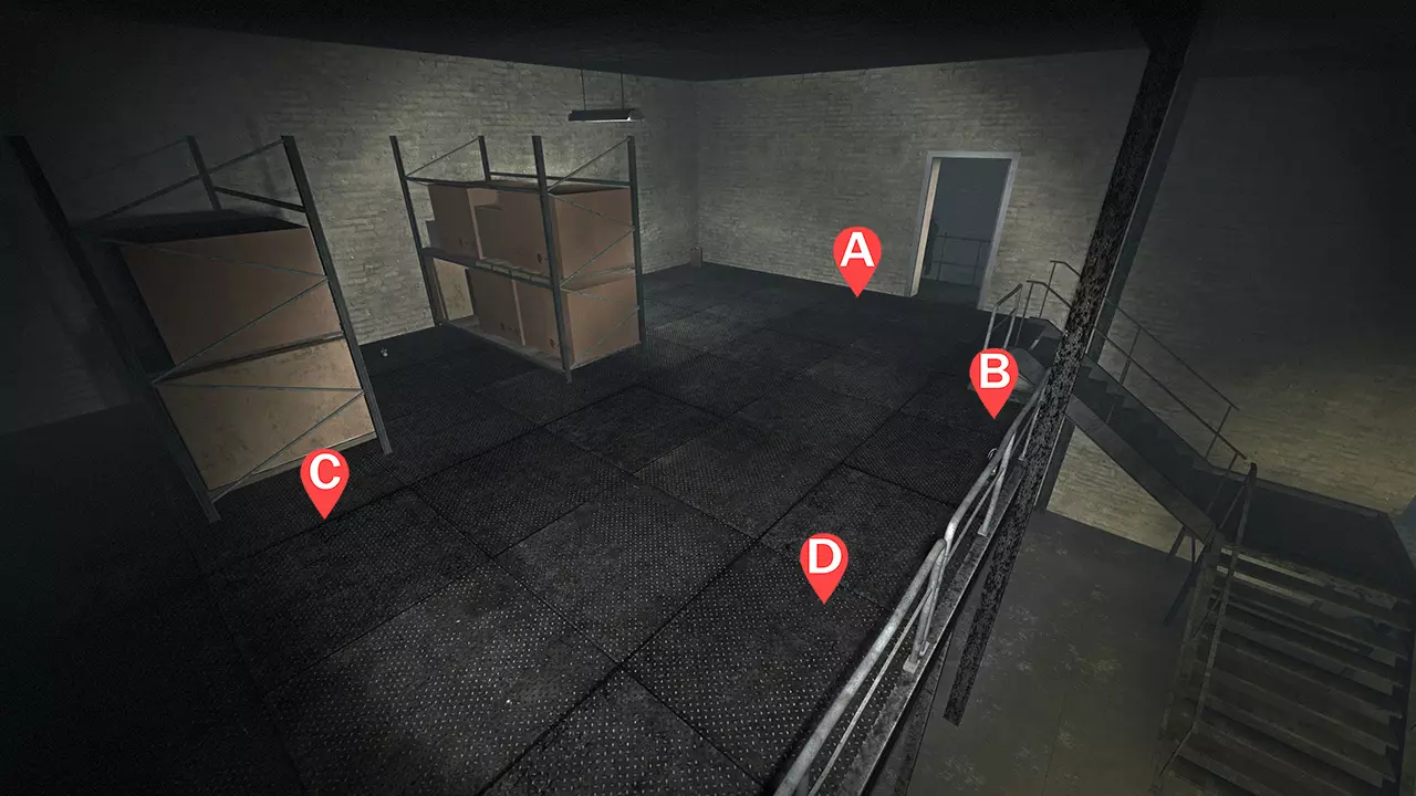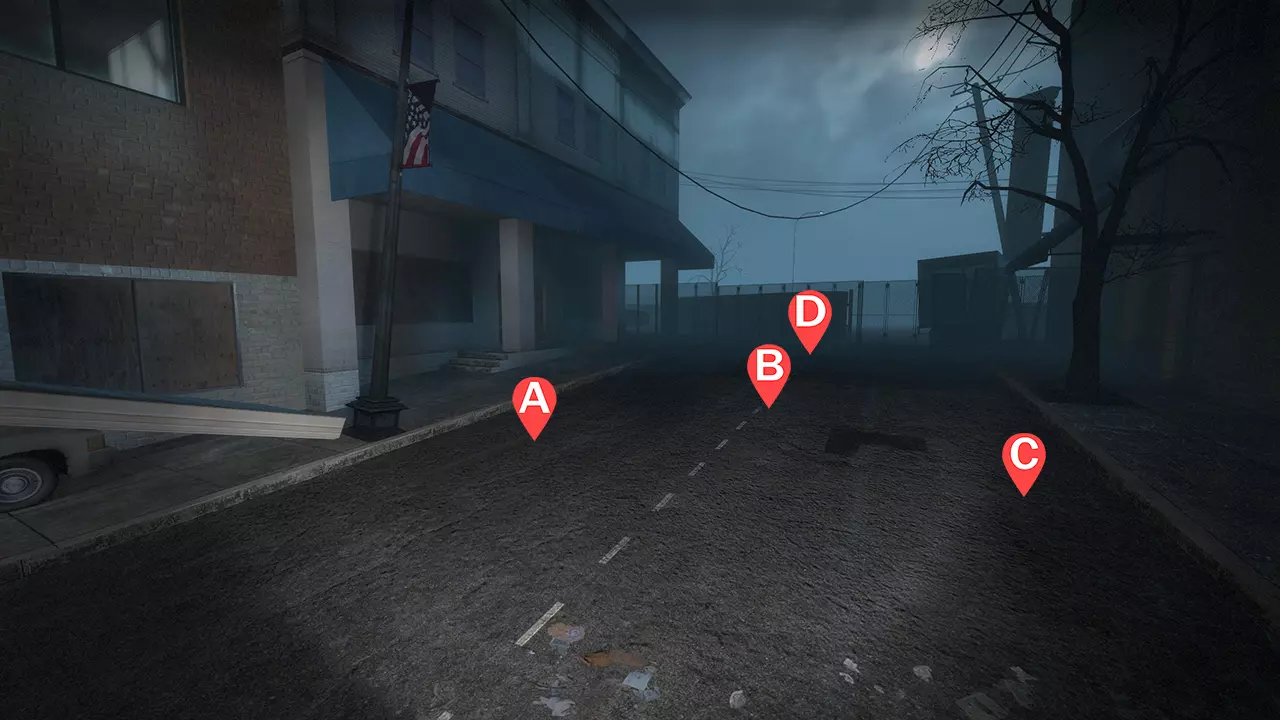 1名幸存者守卫楼梯(A) 1名幸存者坐在最远的角落(B) 1名幸存者站在右侧护栏附近(C) 1名幸存者在有水泥袋的柱子旁(D) 注意事项 幸存者A几乎专门负责监视楼梯;除非天桥上出现两只坦克,否则幸存者A主要对付普通感染者。 幸存者B是支援位置,同时也负责清除地面层的特殊感染者,例如喜欢躲在筒仓后面的吸烟者。幸存者B需协助应对所有坦克。 幸存者C的位置应能看到远处的天桥区域。他们可以利用护栏附近的金属横梁轻松躲避吸烟者。从坦克身边撤退时要靠近护栏,确保不会发生友军火力误伤。 幸存者D必须留意偶尔出现在天桥上的猎人。你可以躲在货架附近的水泥袋后面轻松躲避吸烟者的舌头和坦克的石头。坦克石头的判定范围可以穿透栏杆,当坦克投掷的石头将要击中栏杆附近时,所有幸存者都应与栏杆保持一定距离。频繁切换位置以减少弹药补给次数是常见做法,因为大多数坦克会从高空通道出现。弹药补给