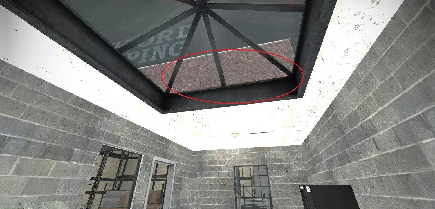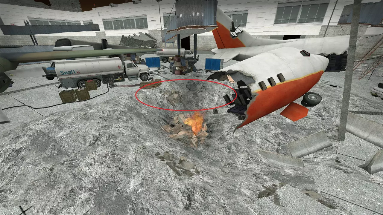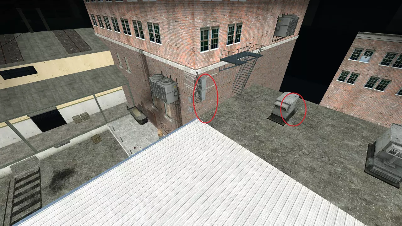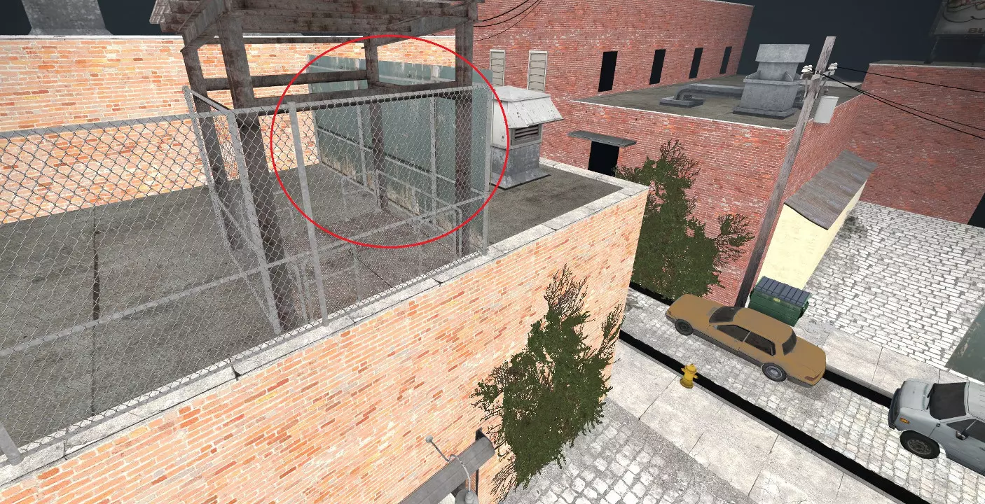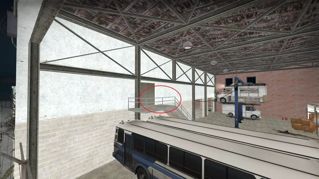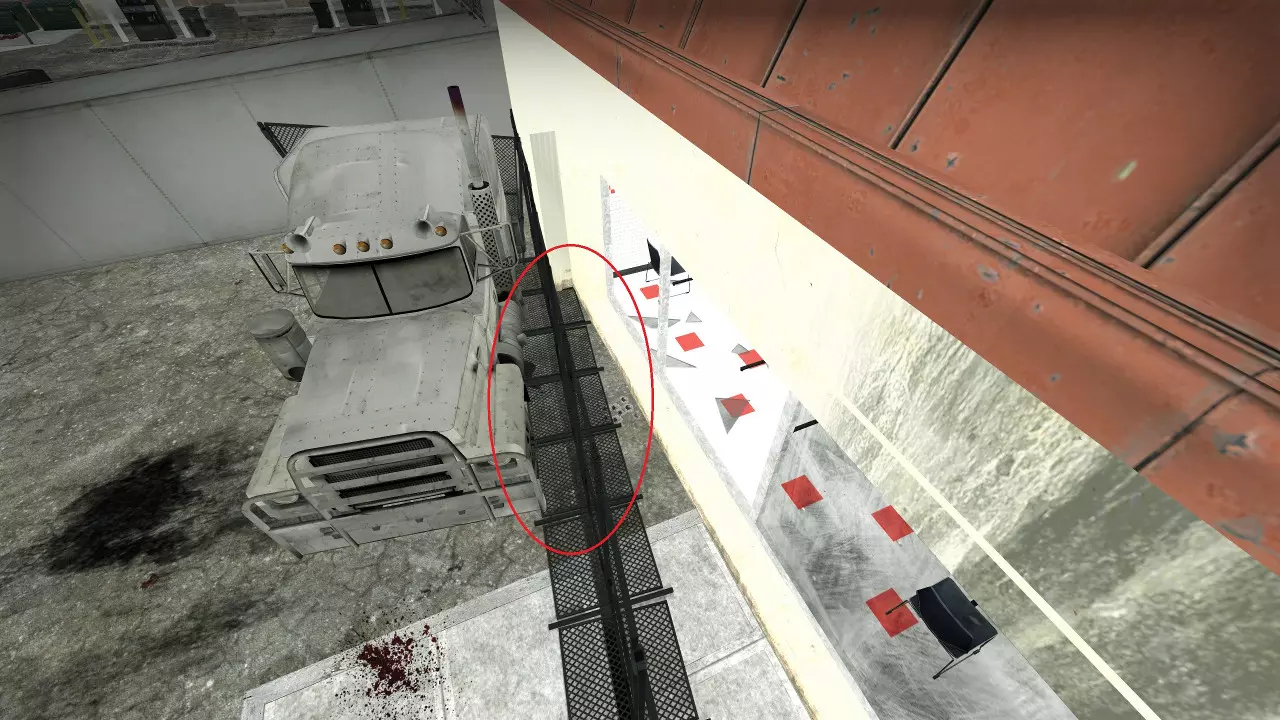 极少数情况下,烟雾弹会卡在团队通常防守位置上方及后方的这个平台上。 跑道