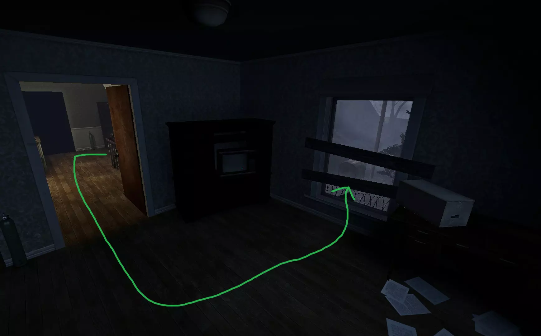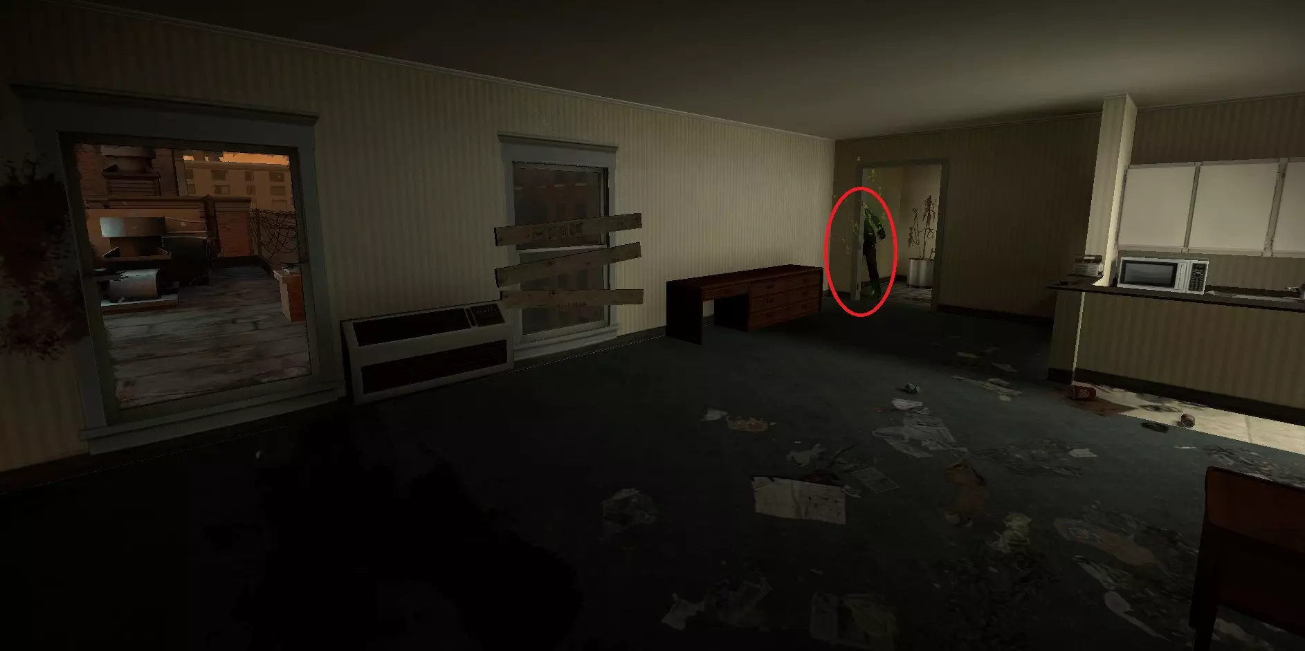 特殊感染者可能会被困在这扇门后,而开启回合的爆炸无法摧毁这扇门。幸存者B可以使用猎枪瞄准门下方他们的脚部进行射击。